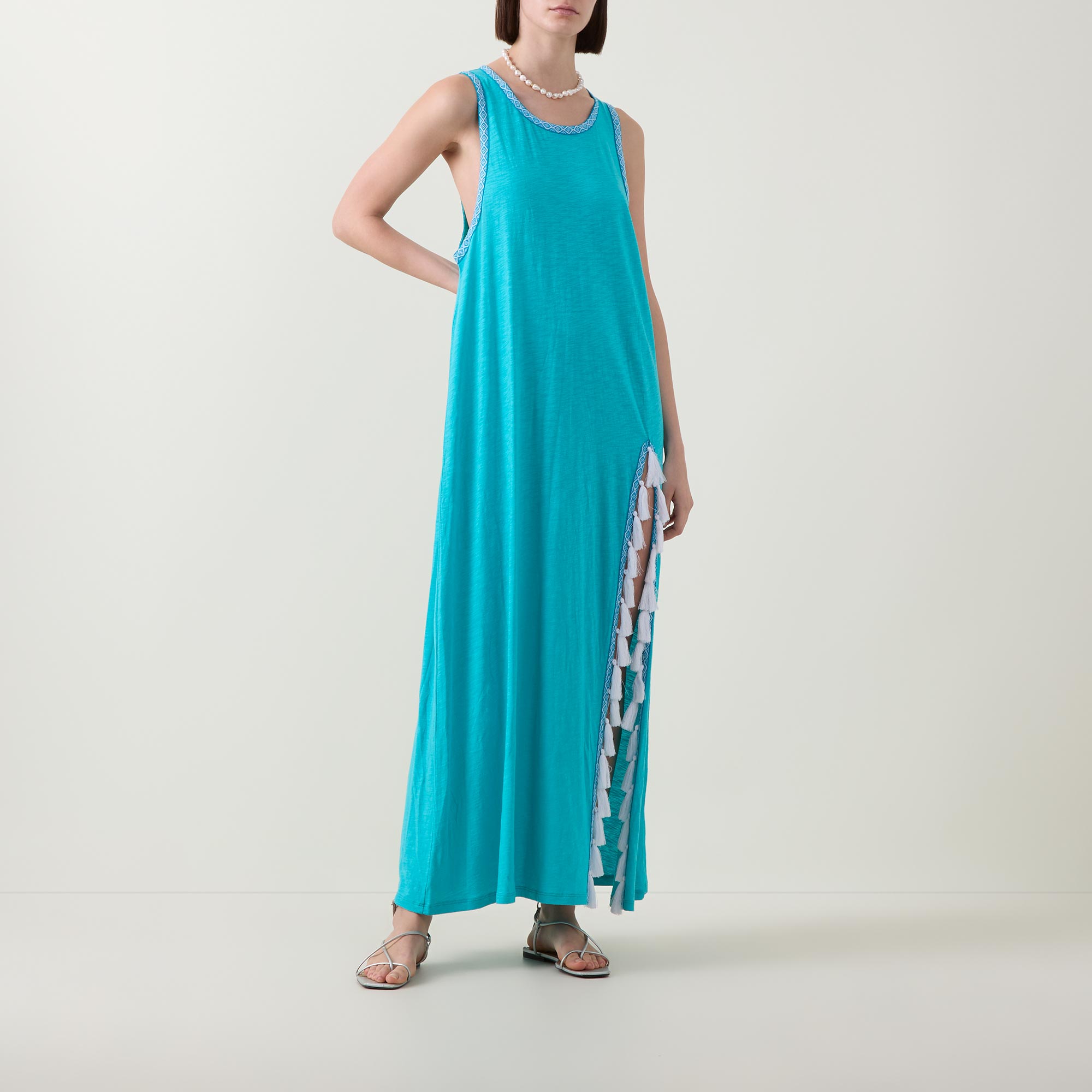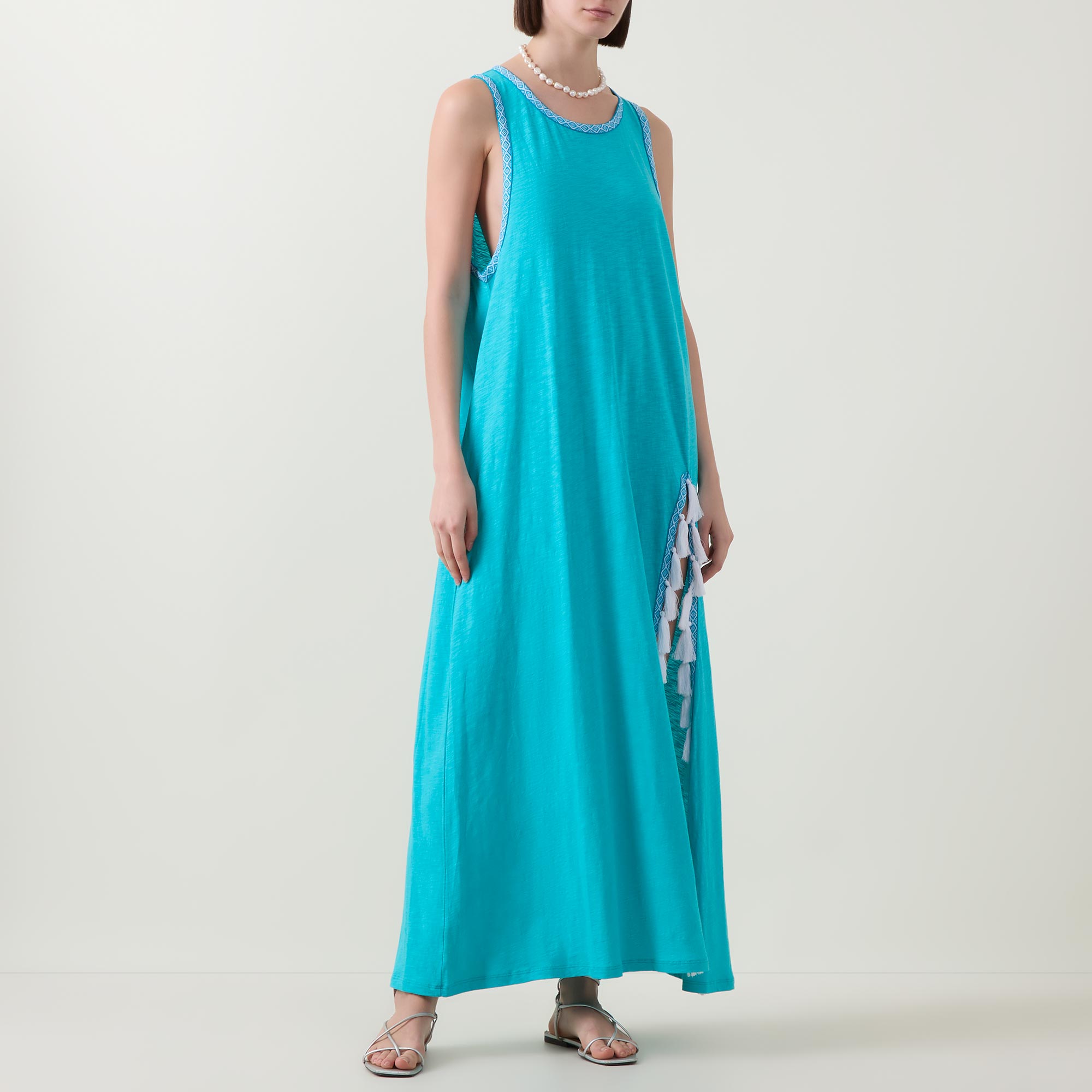 - Round neckline, low armholes, maxi length, slit hemline, tassel embellishment