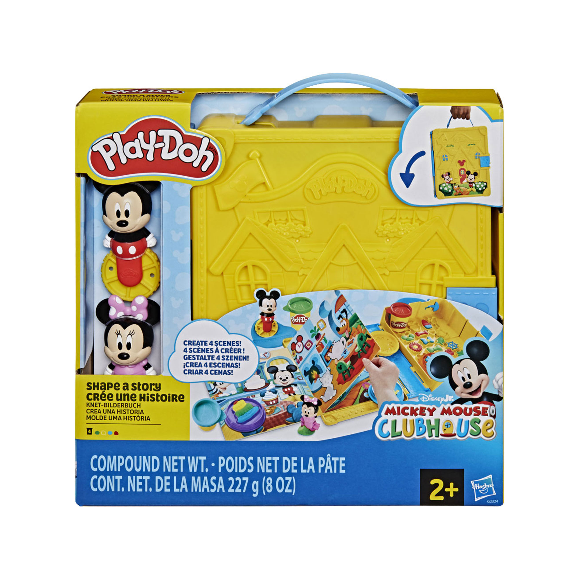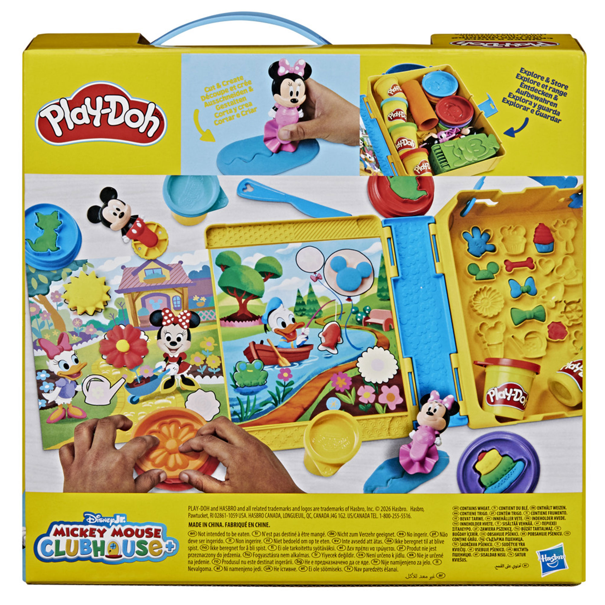 - Includes: Playmat storybook, Mickey rolling stamper, Minnie rolling cutter, Goofy Fun Factory tool, six stampers, roller, knife, four cans of Play-Doh brand modelling compound (total 227g)