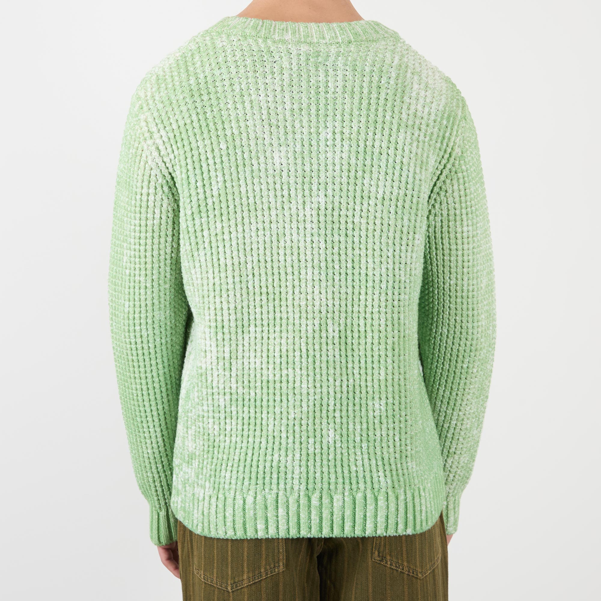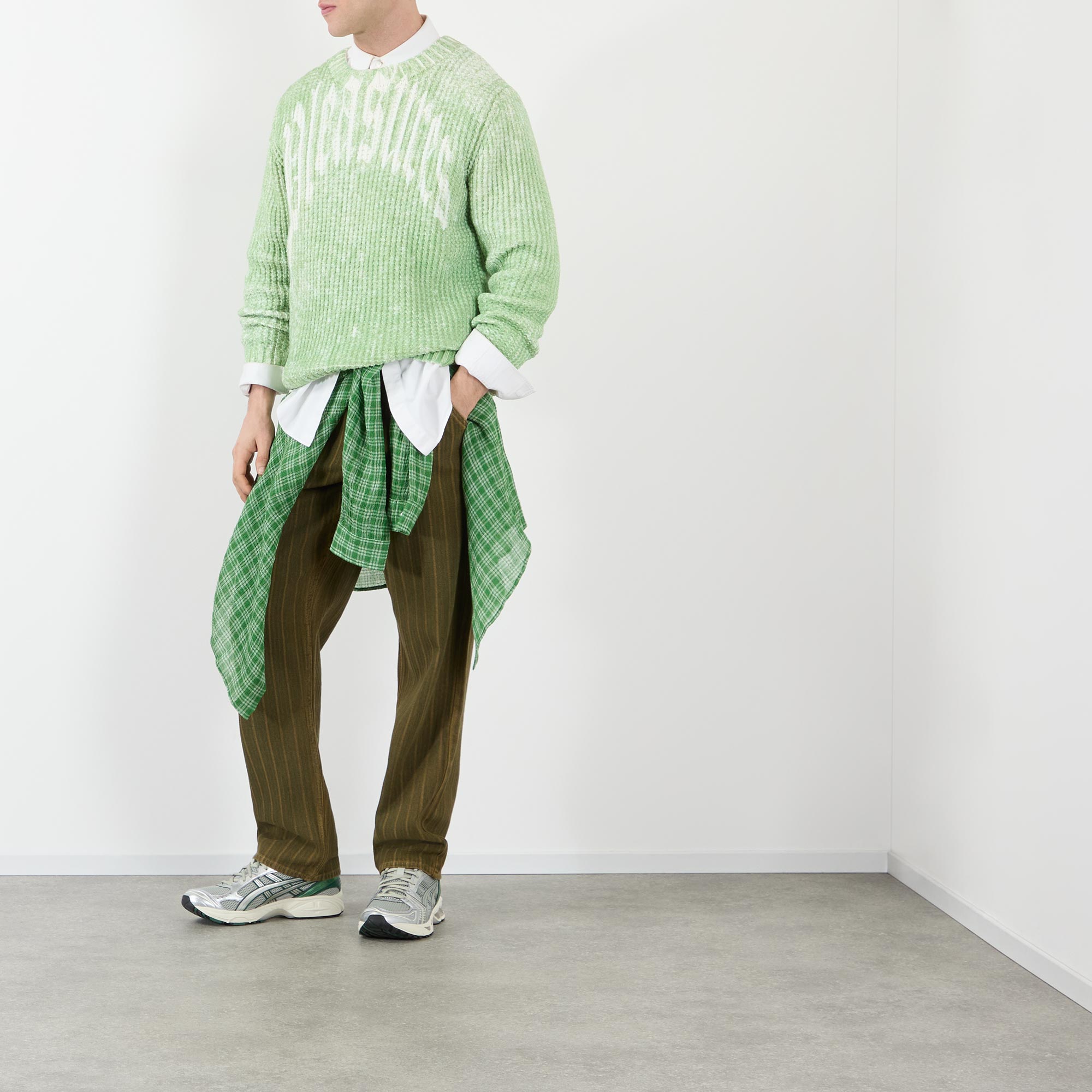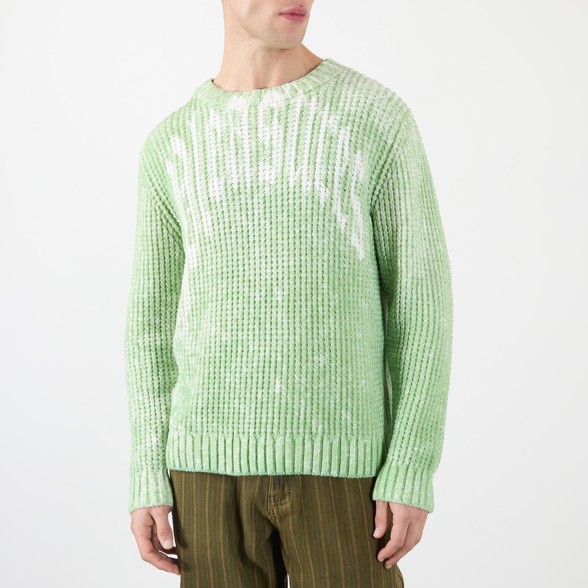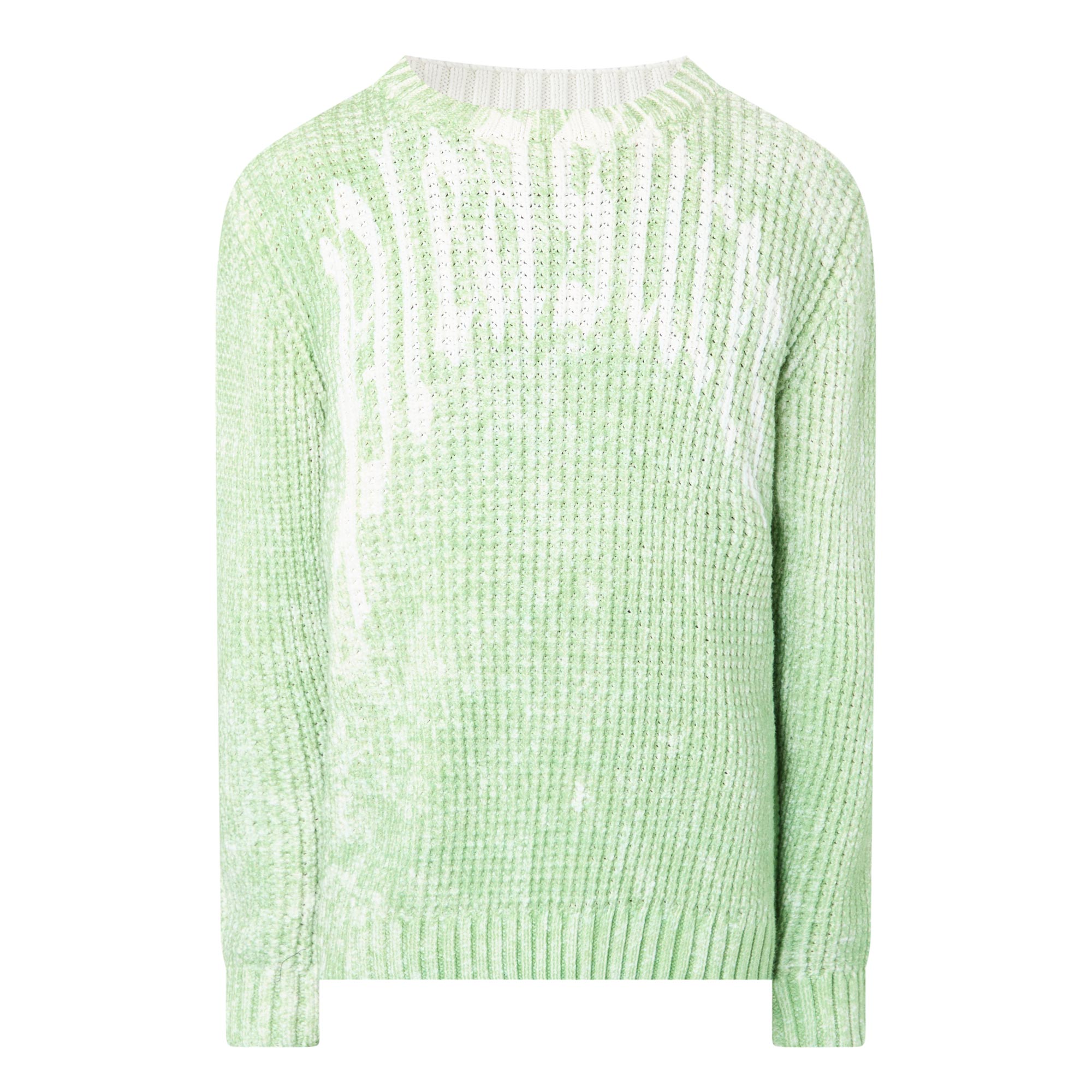 • Crew neck, dropped shoulders, long sleeves, straight hem, ribbed trims, contrast logo across the chest, acid wash design, chunky knit construction