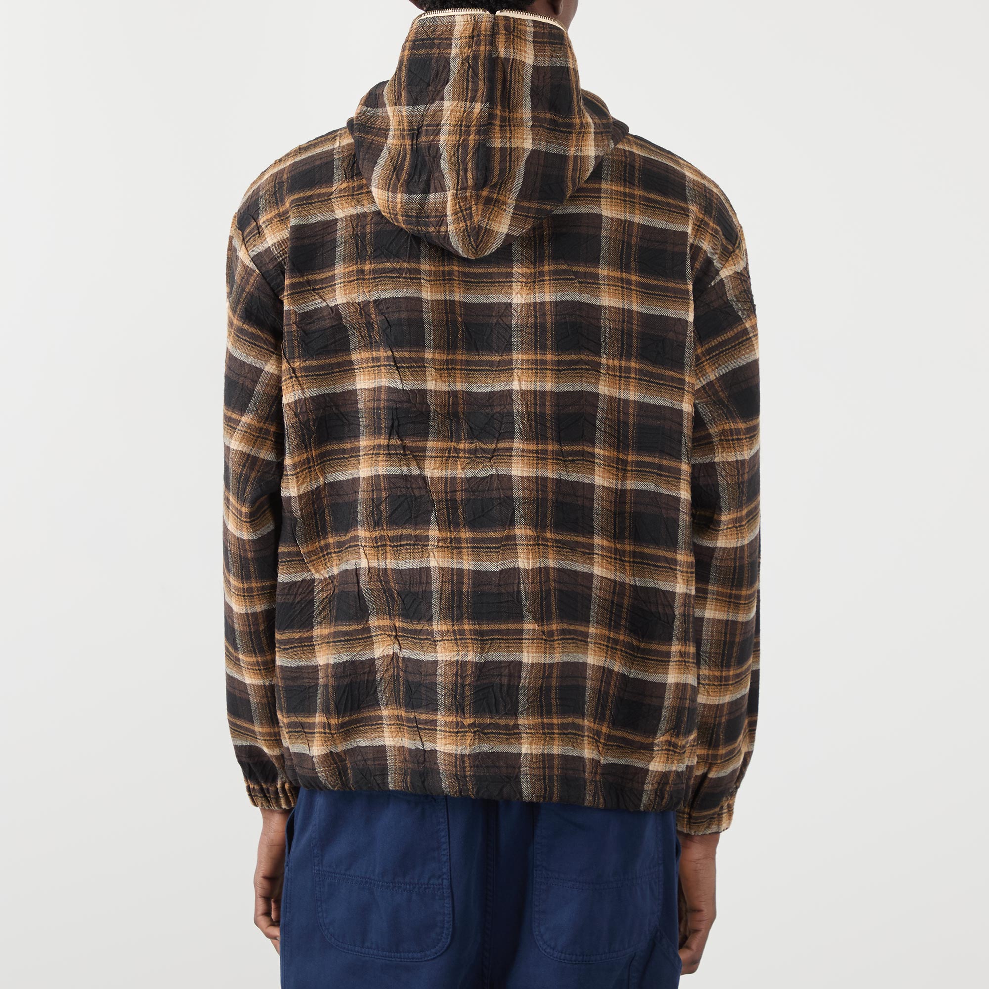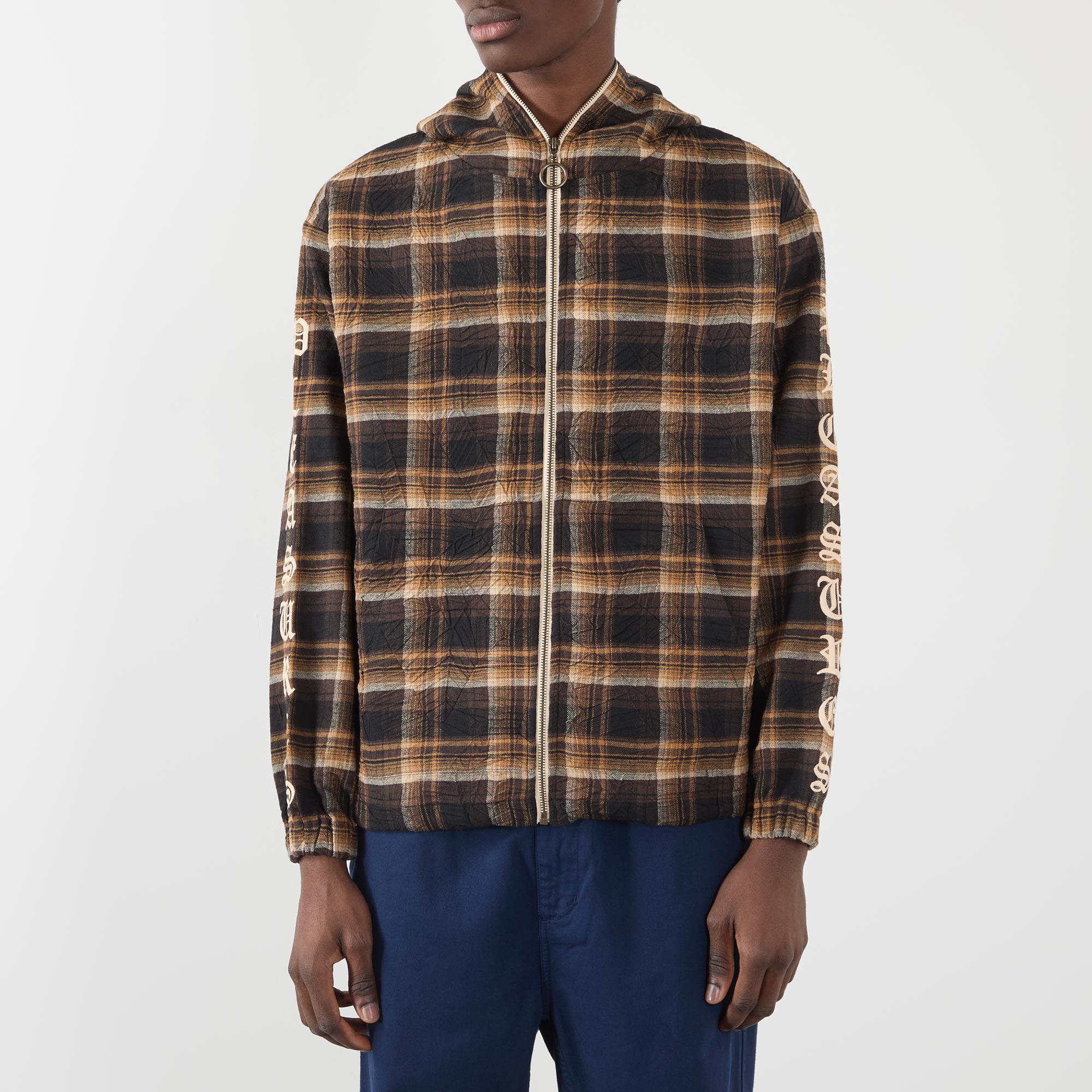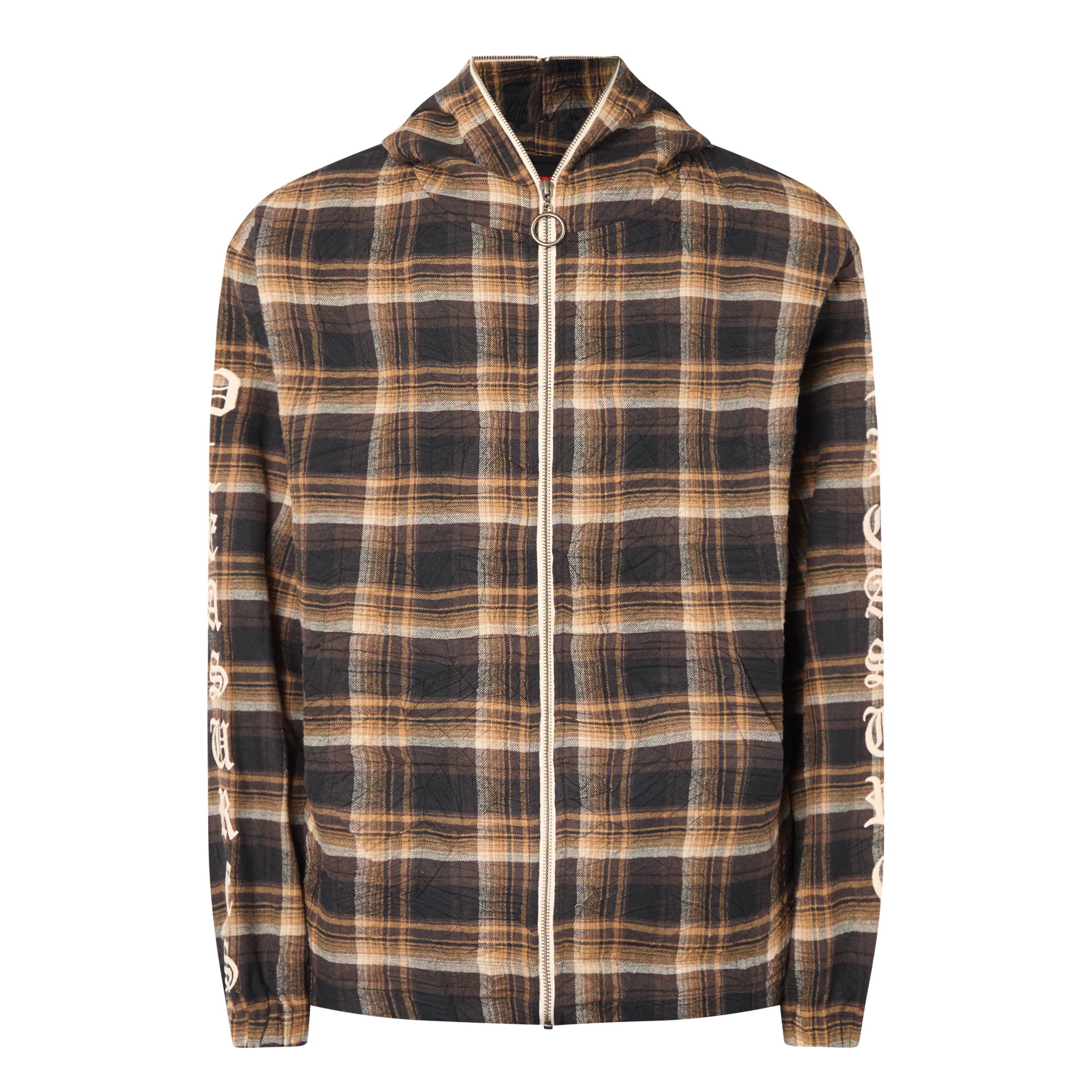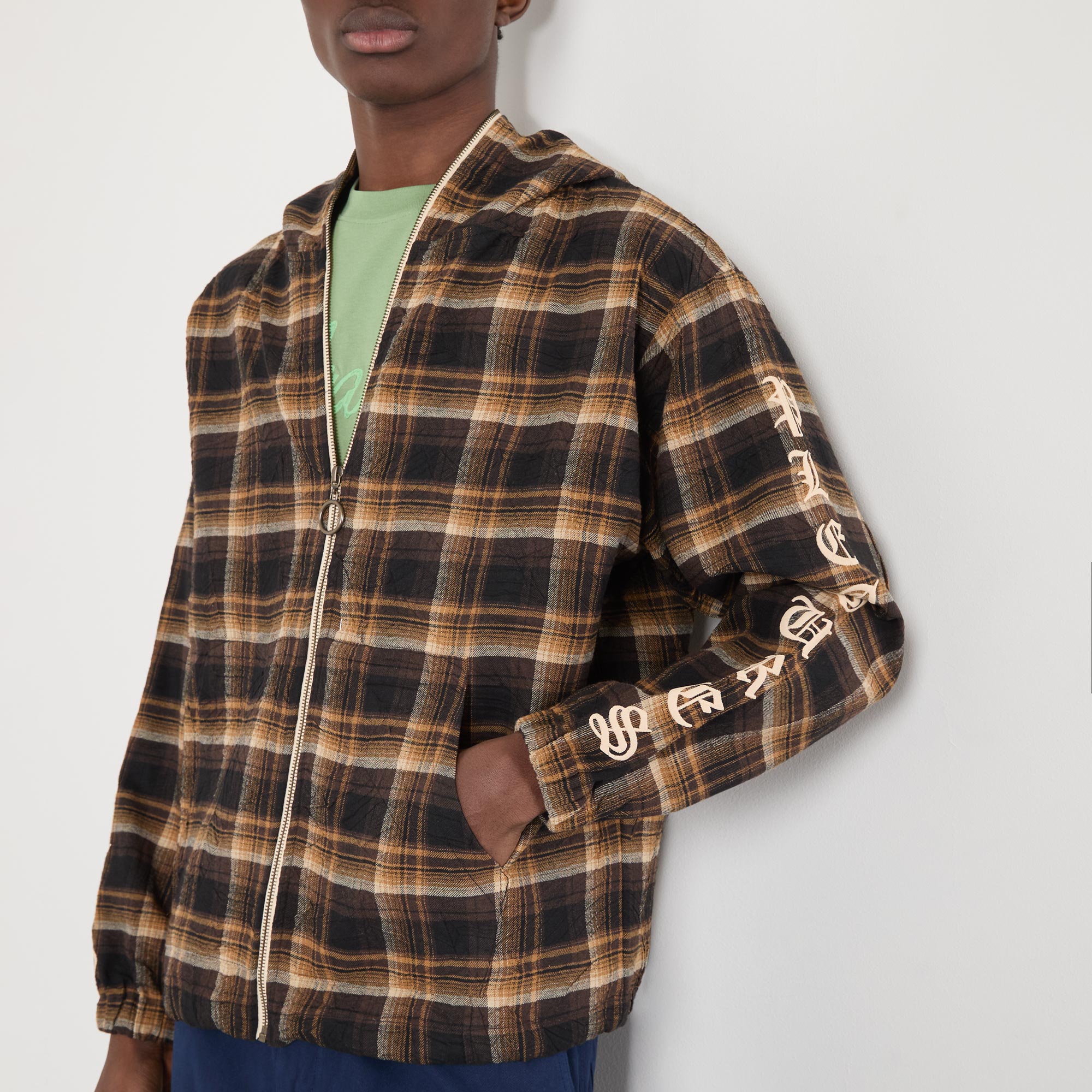 - Check pattern, hooded, zip fastening, logo lettering on sleeves, side pockets