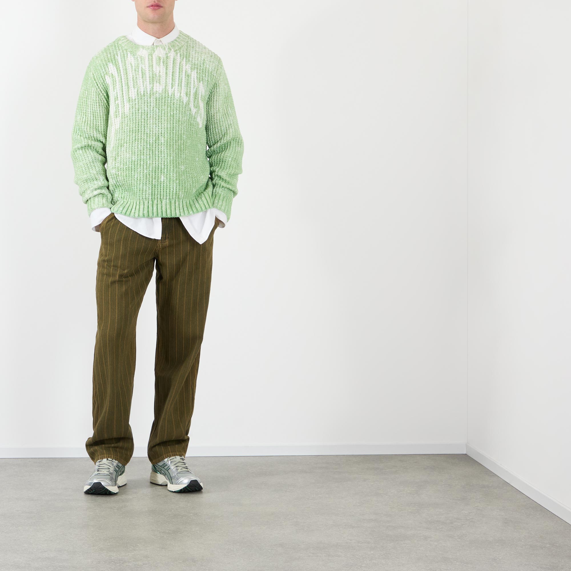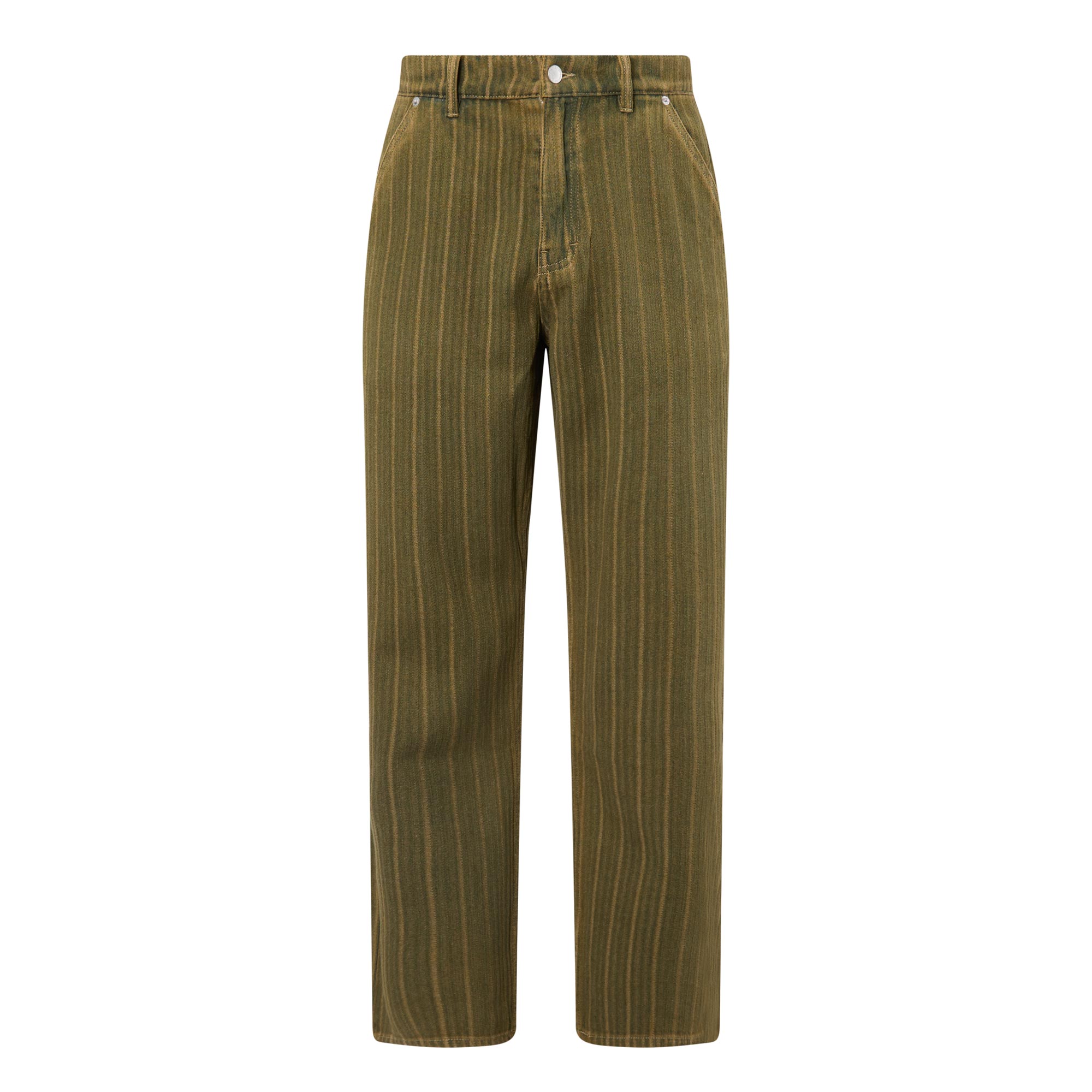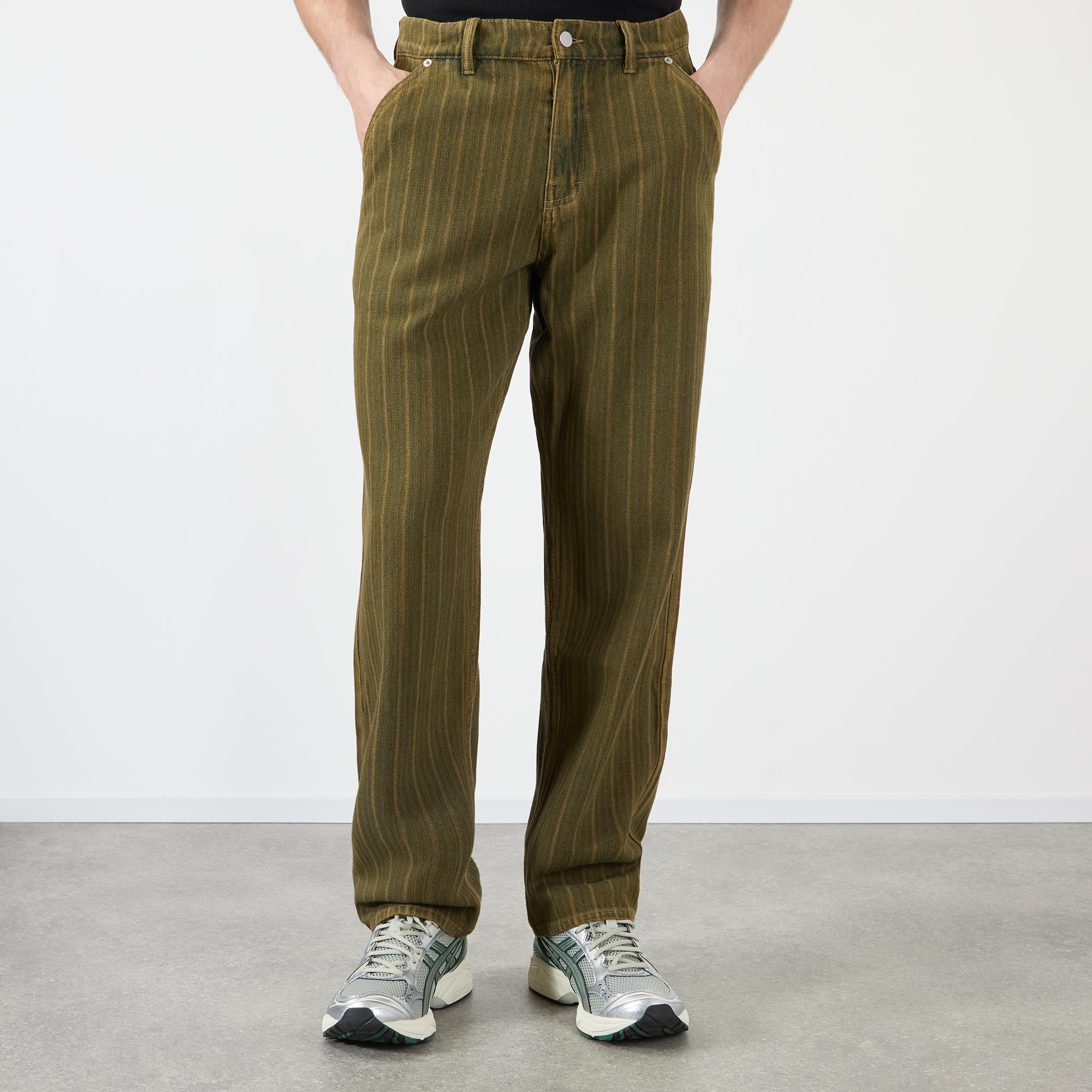- Mid rise, straight leg, belt loops, concealed zip fly and button fastening, two side entry pockets, two rear patch pockets, clean hems, rear logo badge, tonal striped pattern, twill design