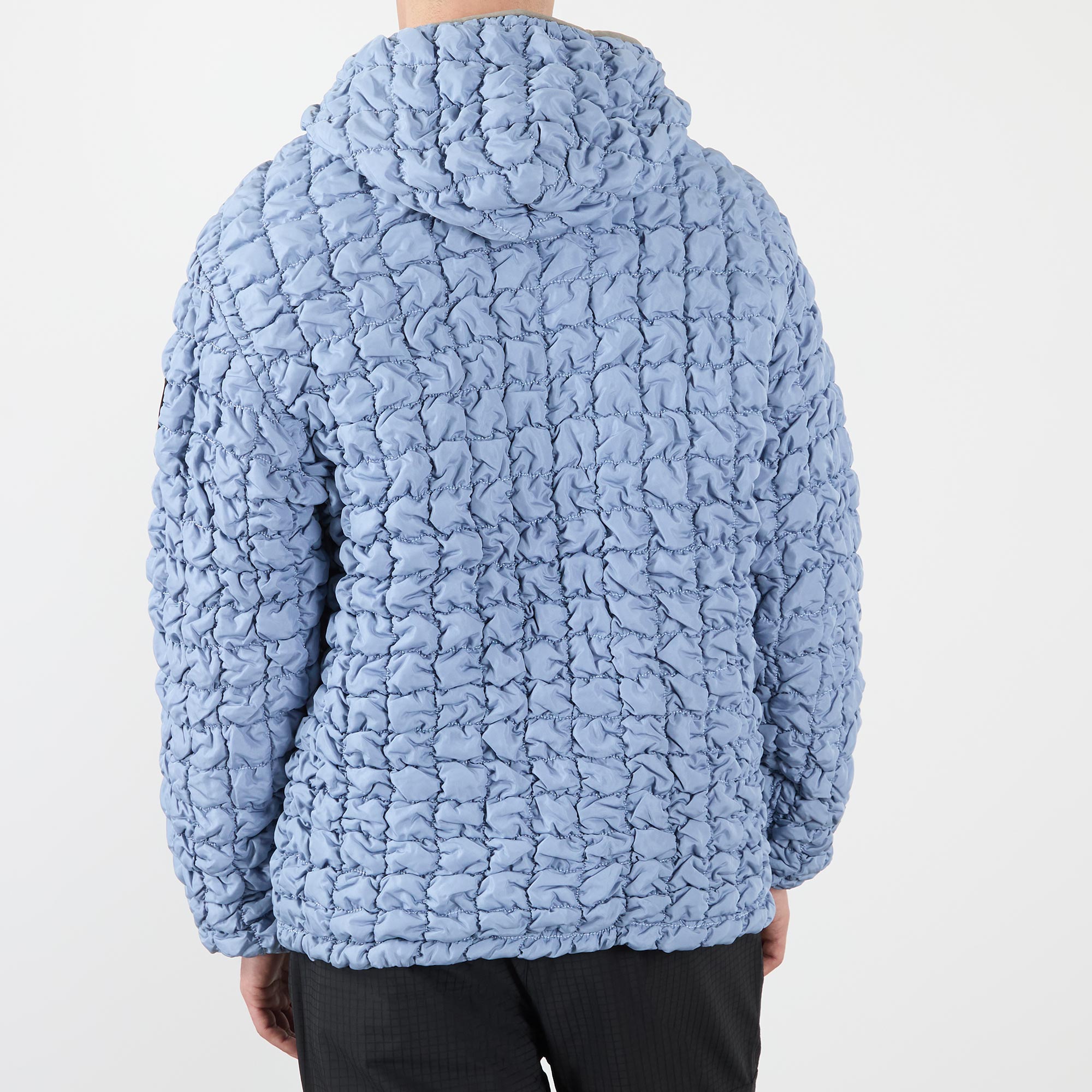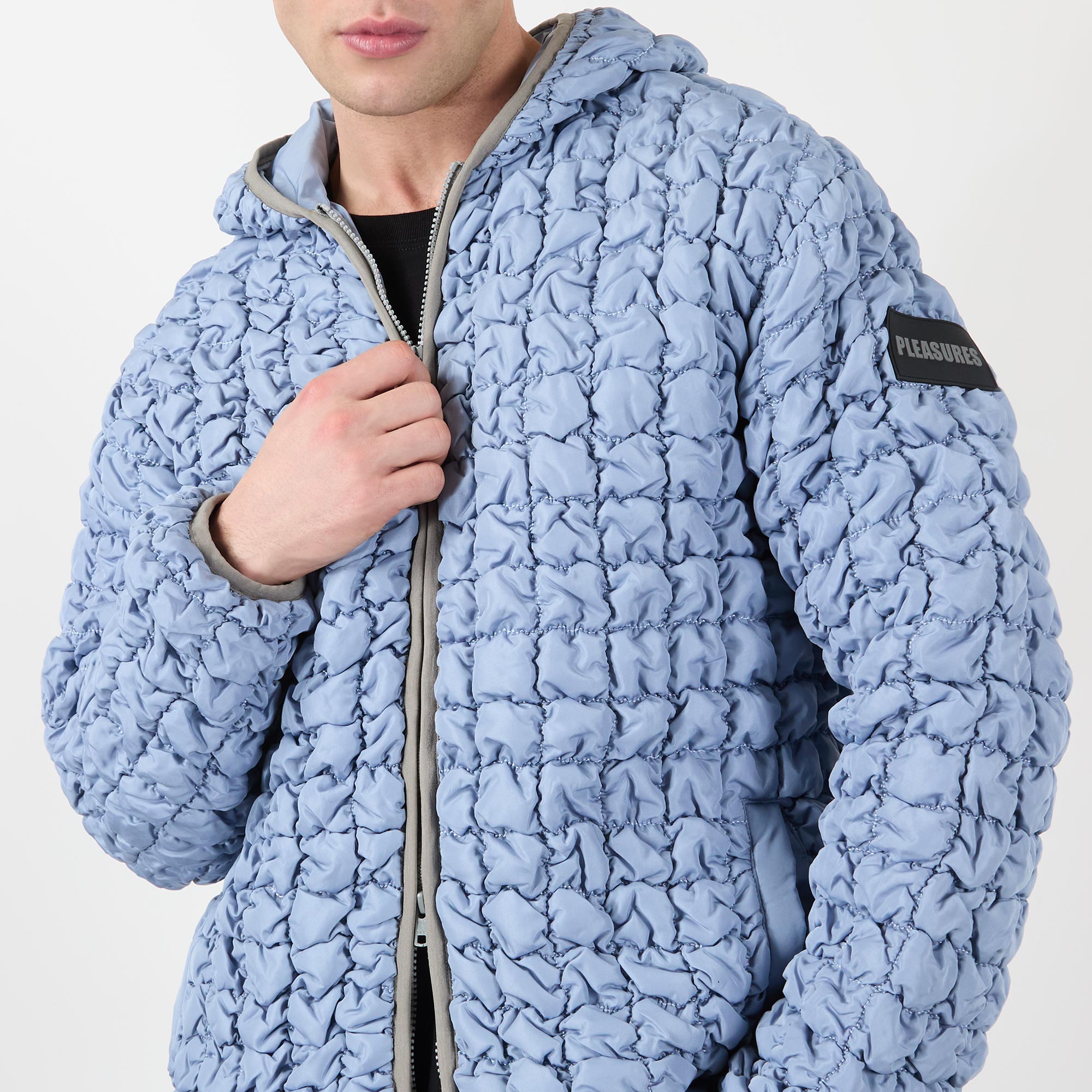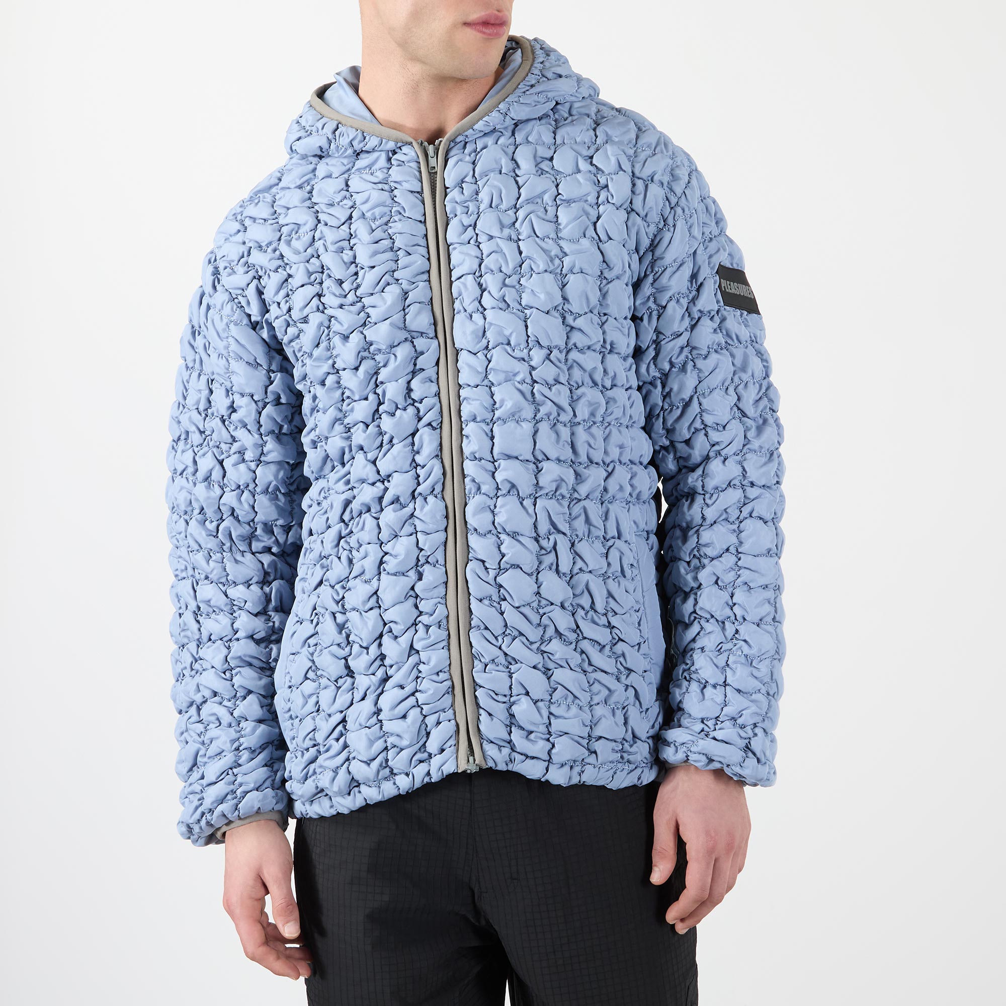 - Hood, dropped shoulders, long sleeves, two-way front zip fastening, two side entry pockets, straight hem, bound trim detailing, logo badge, padded, textured finish