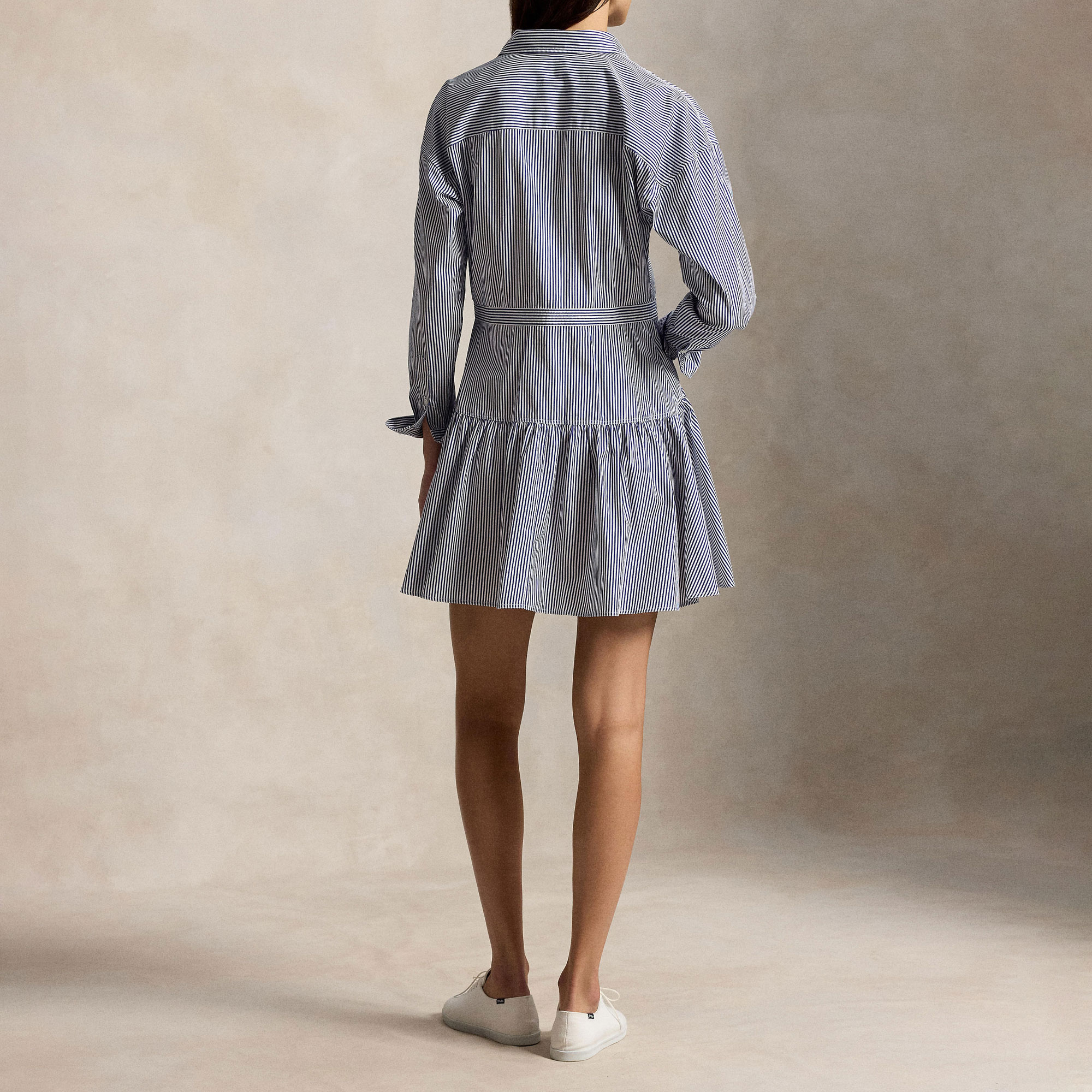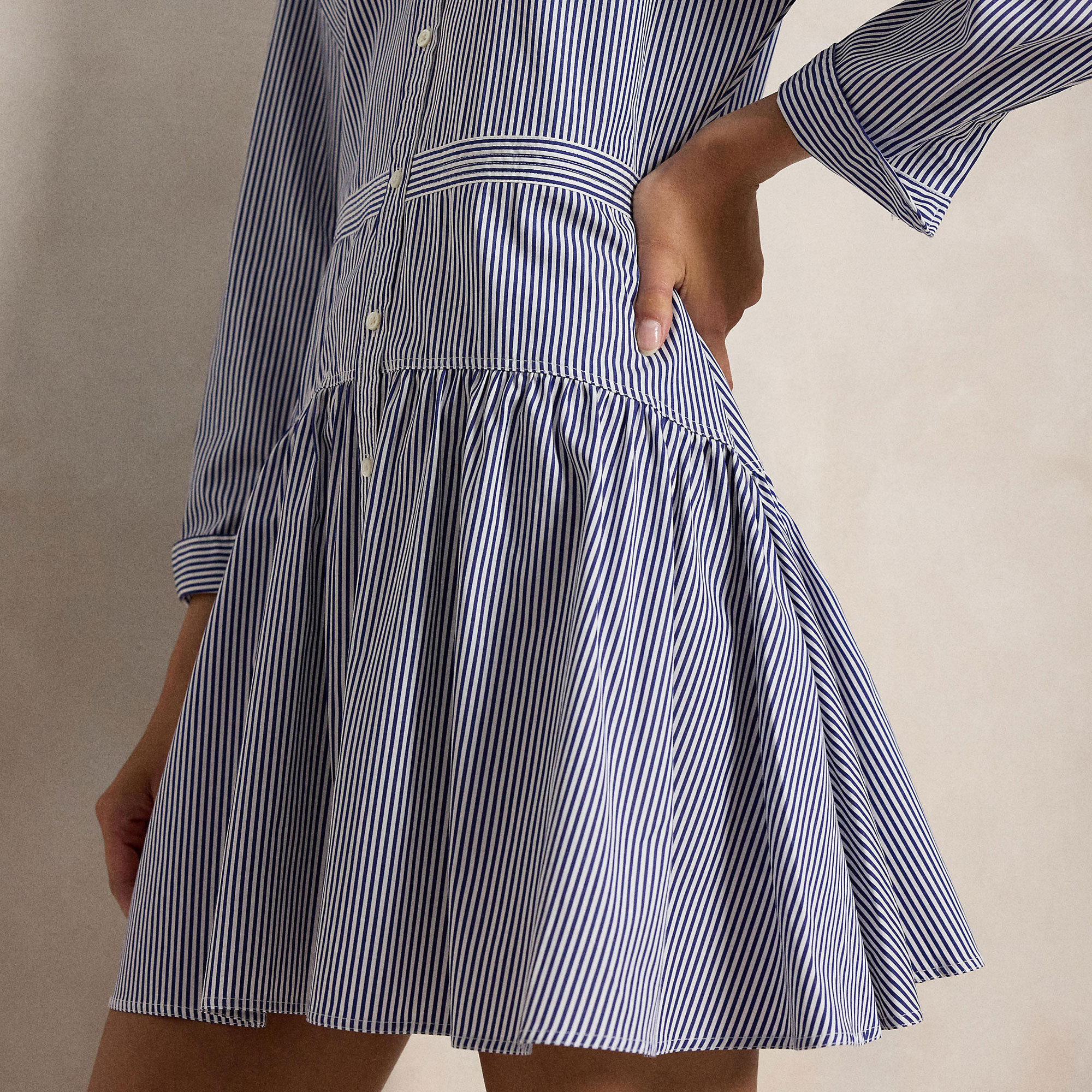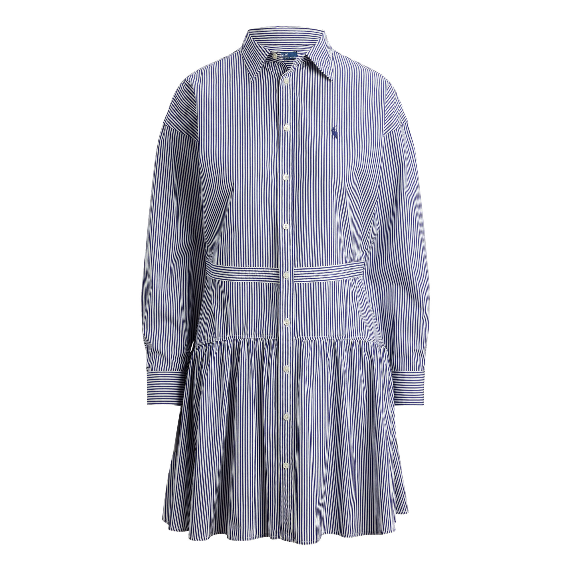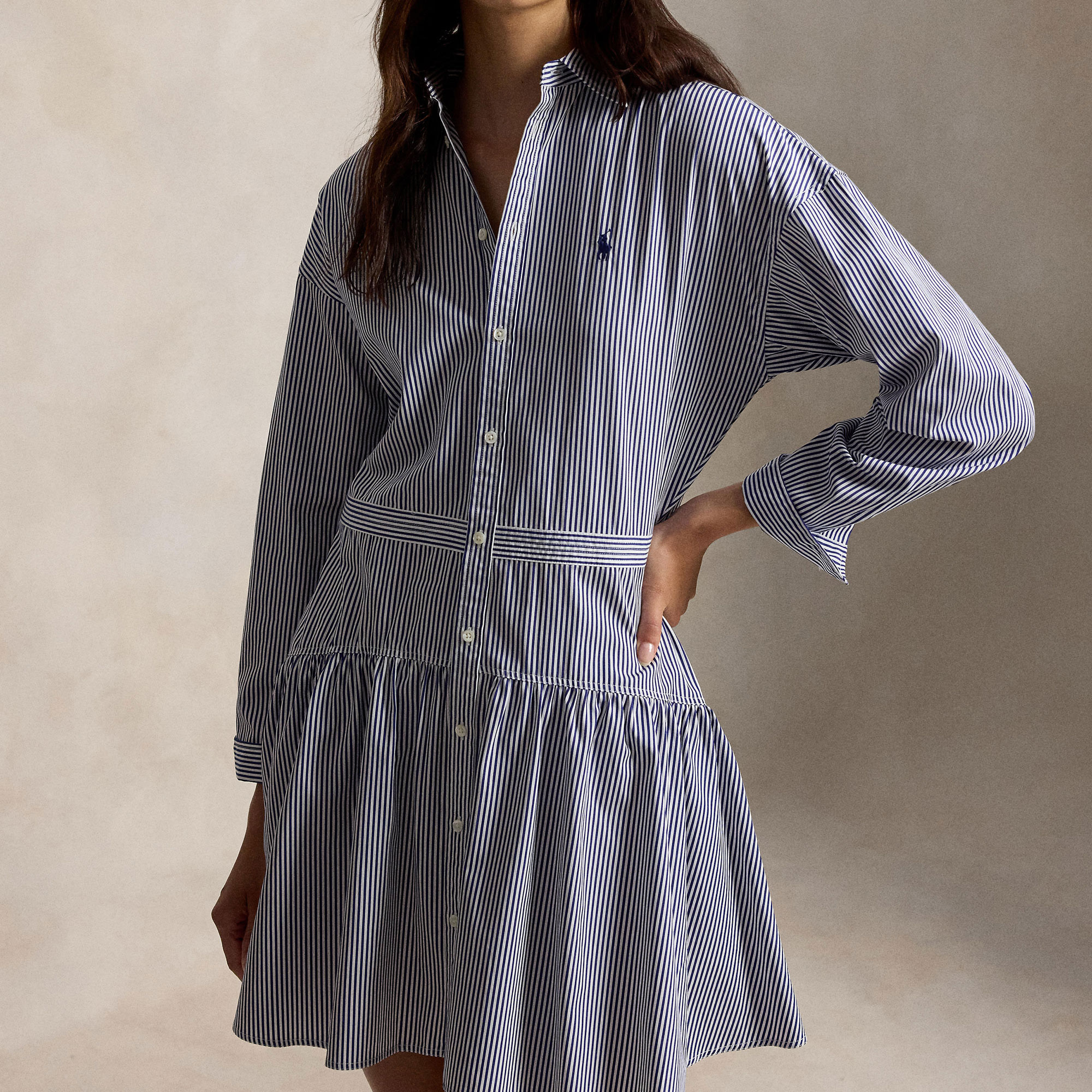 - Panelled construction, shirred skirt, striped, A-line silhouette, shirt style, smooth poplin, signature embroidered Pony logo, shell buttons, mini length, spread collar, front buttoned placket, long sleeves, buttoned barrel cuffs, dropped shoulders, waistband, front and back waist yoke, pleated back yoke