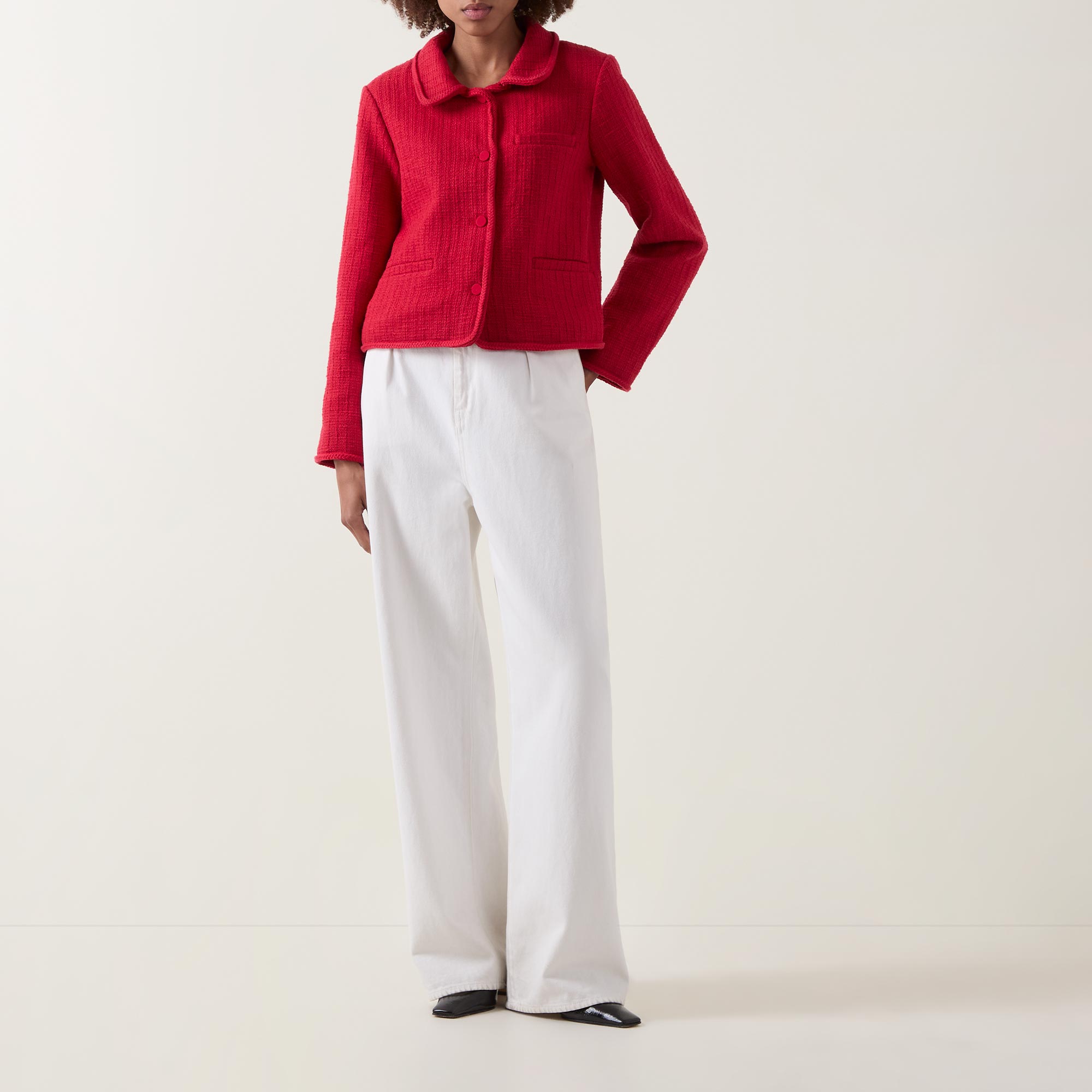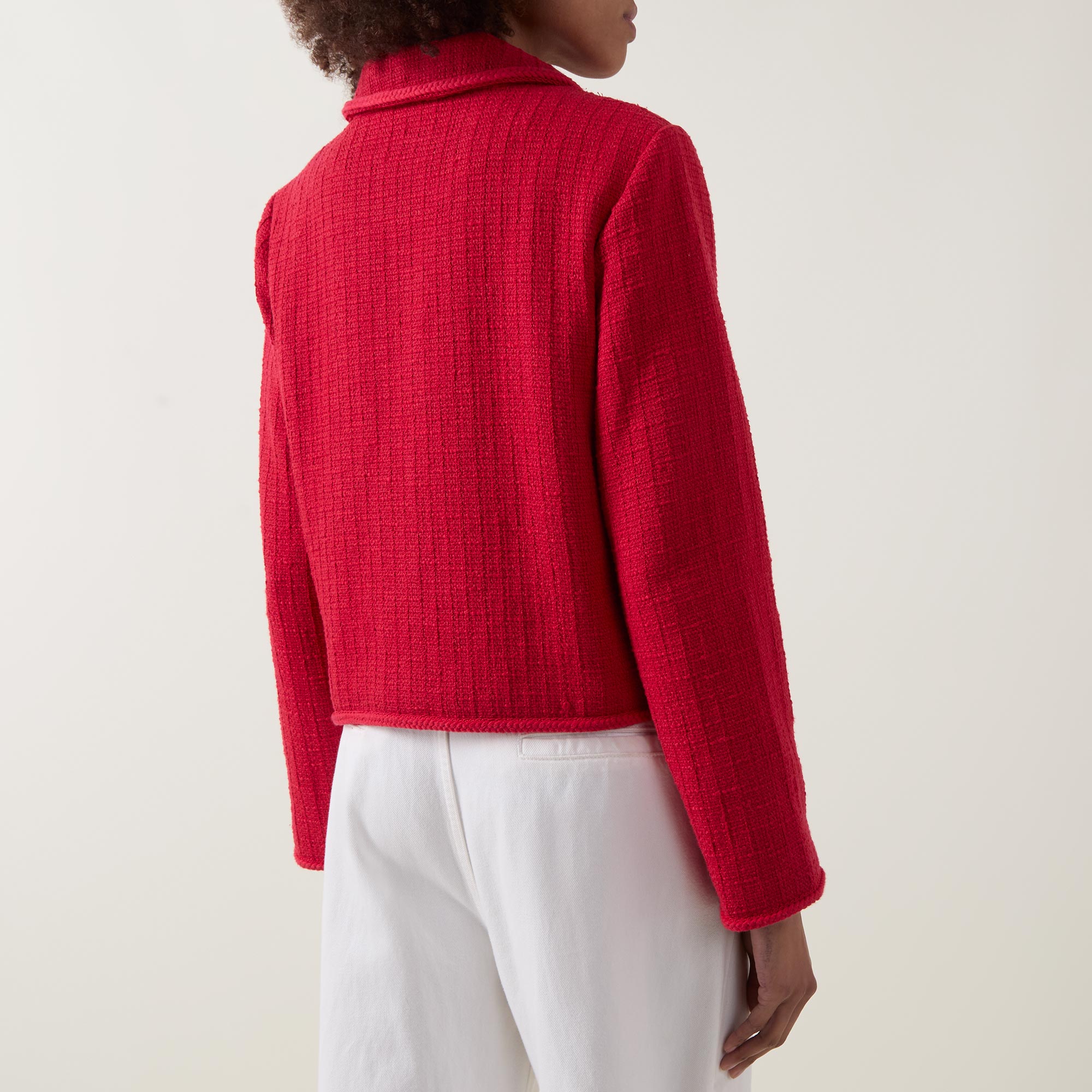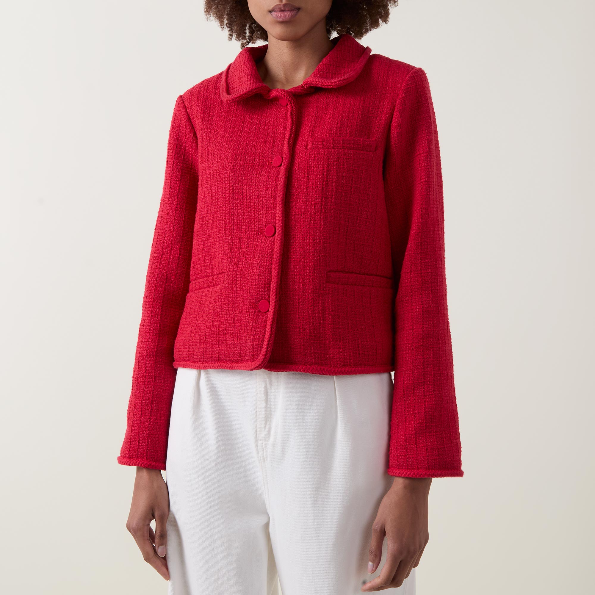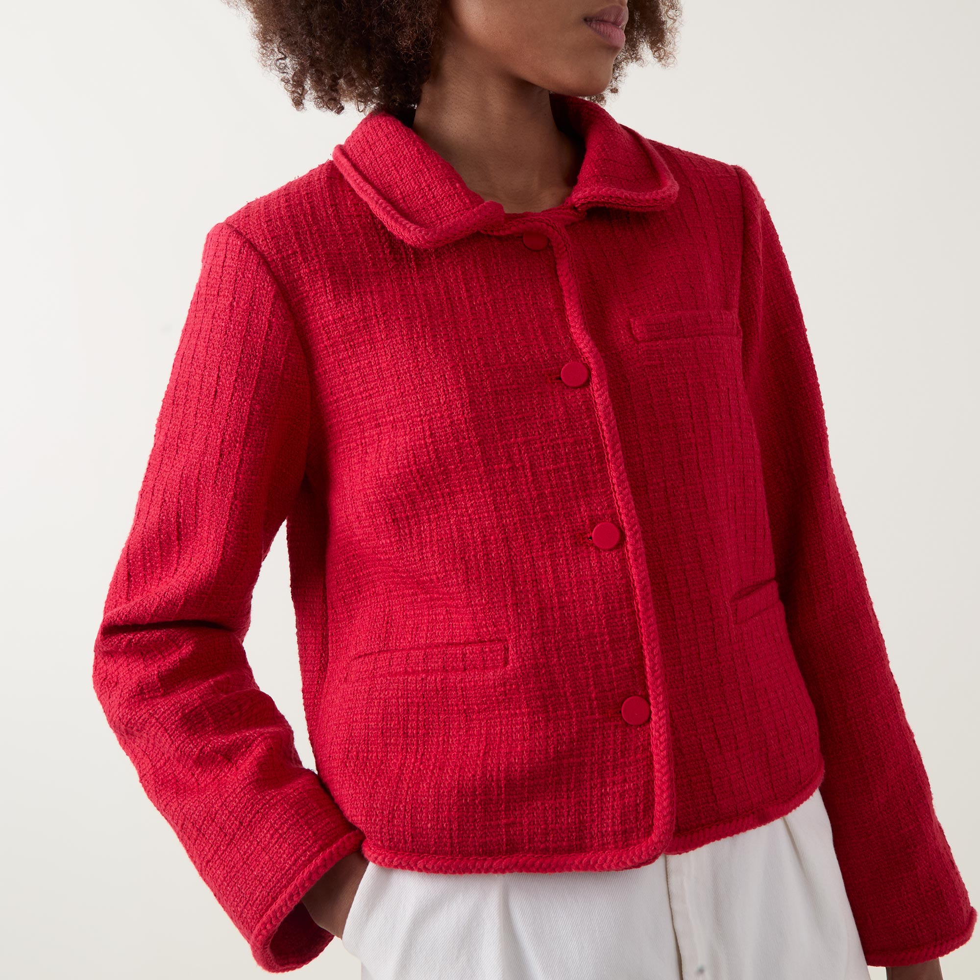 - Flat collar, long sleeves, plaited trims, button fastening, chest pocket, patch pockets, bouclé fabric, boxy silhouette