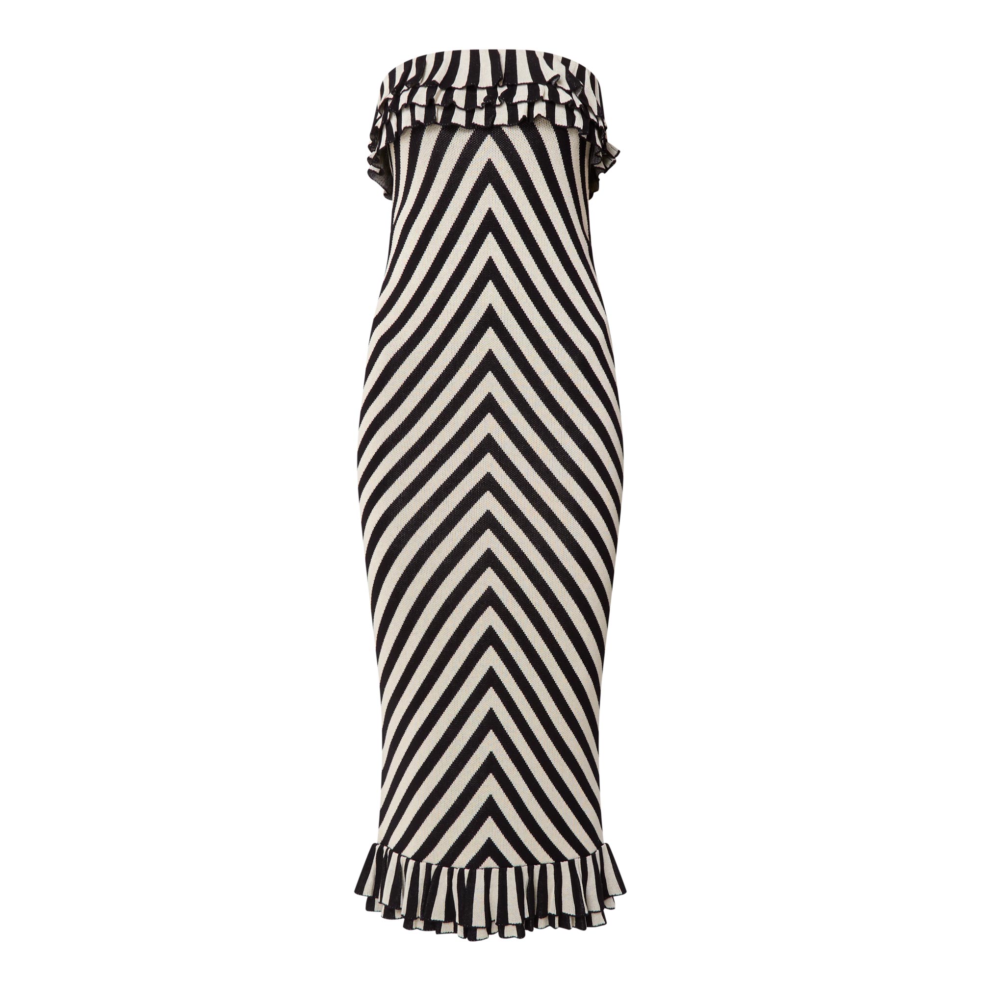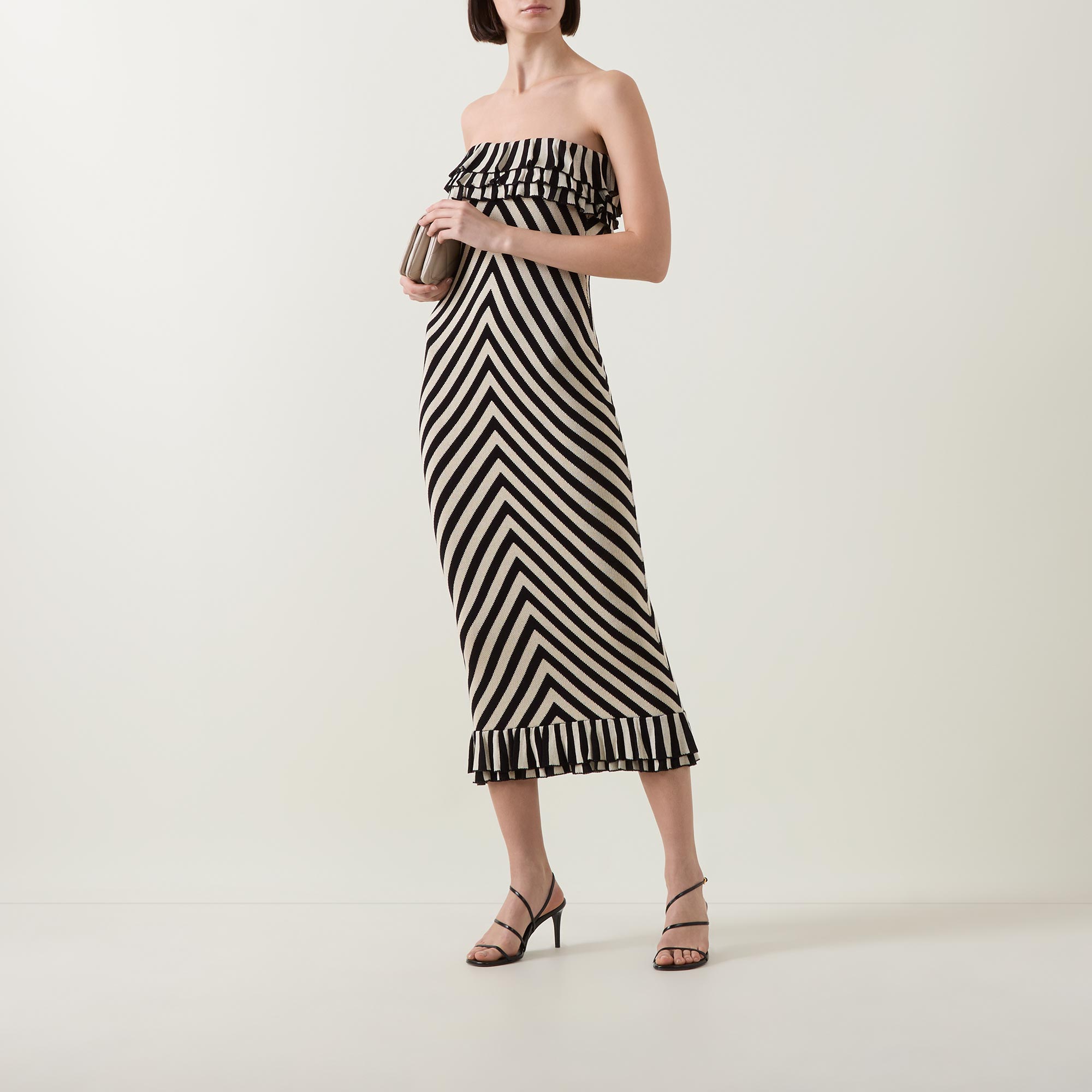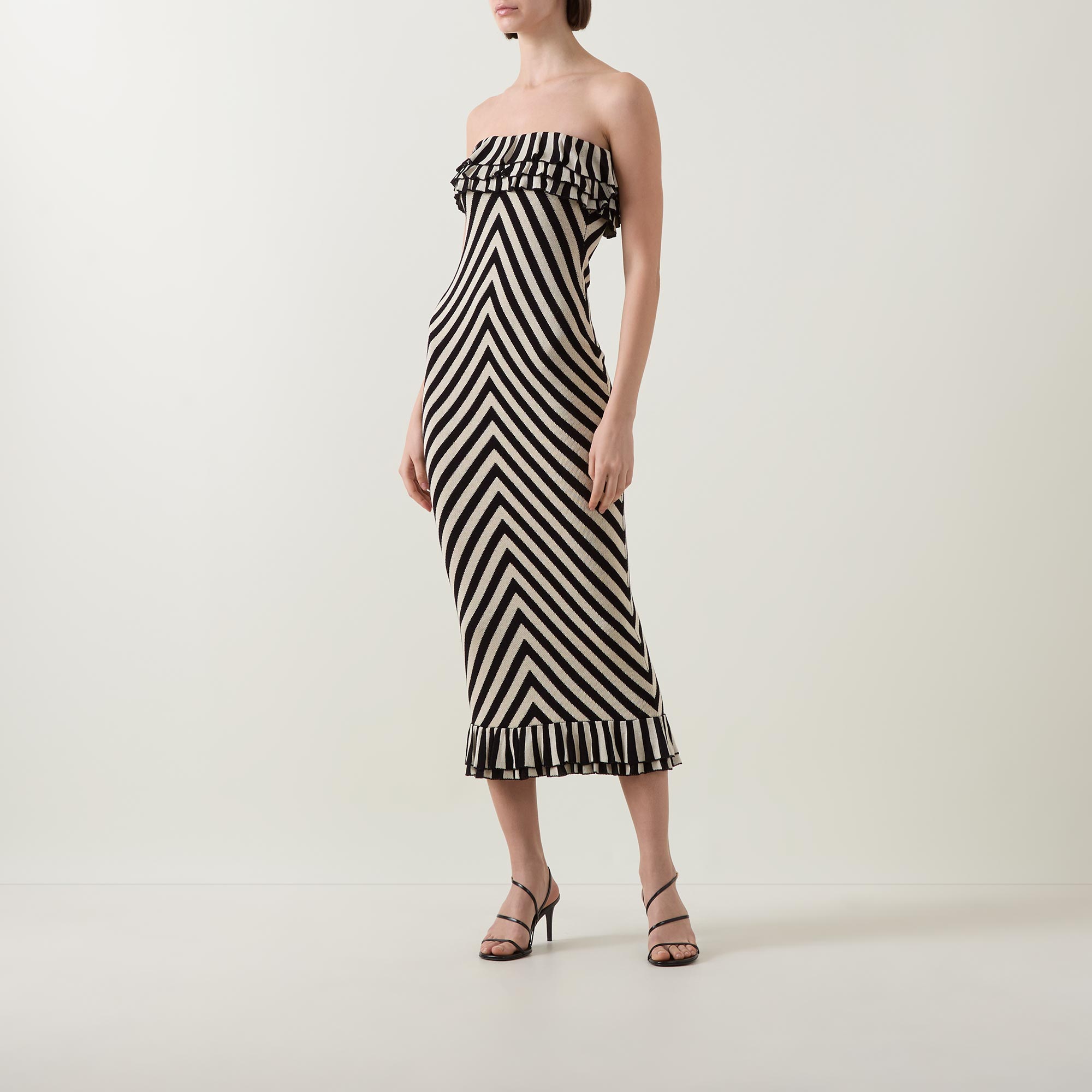 - Off-the-shoulder neckline, strapless, ruffle detailing, fitted through the waist and hips, straight hem with additional ruffle detailing, chevron striped design, midi length, smooth finish