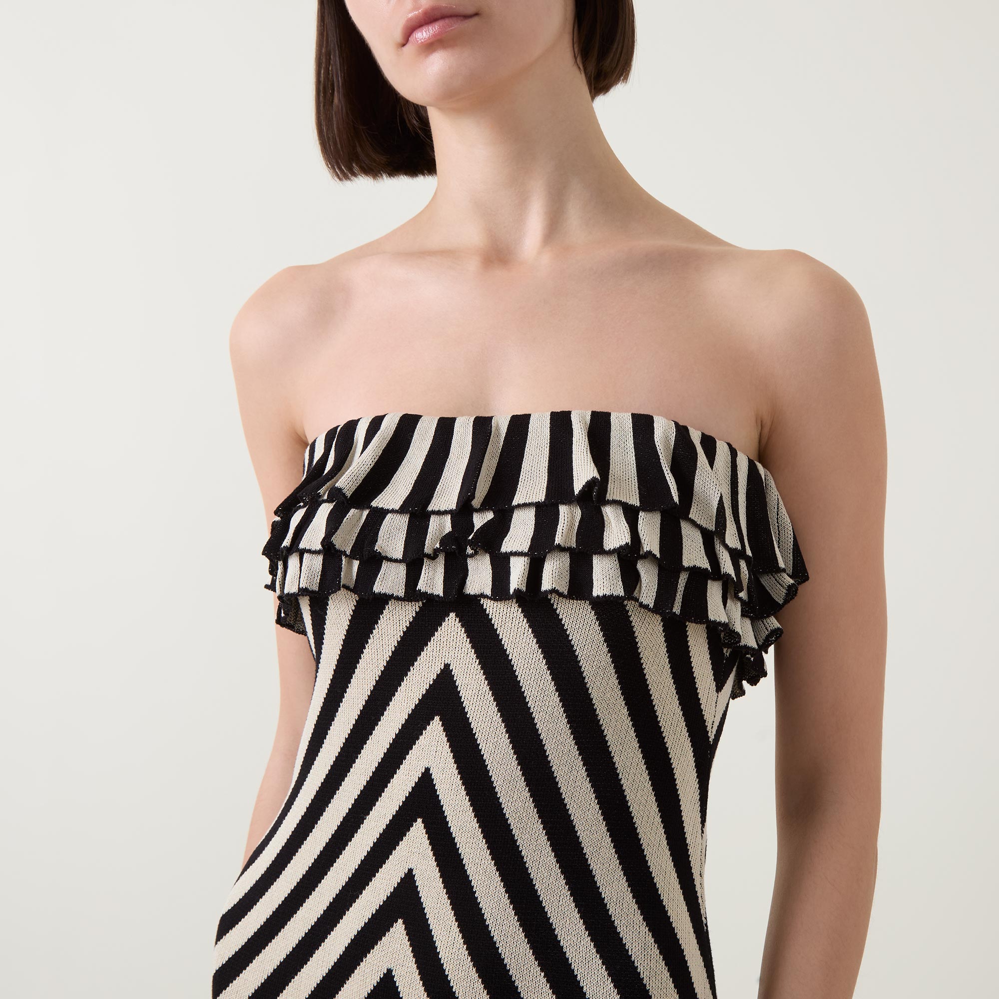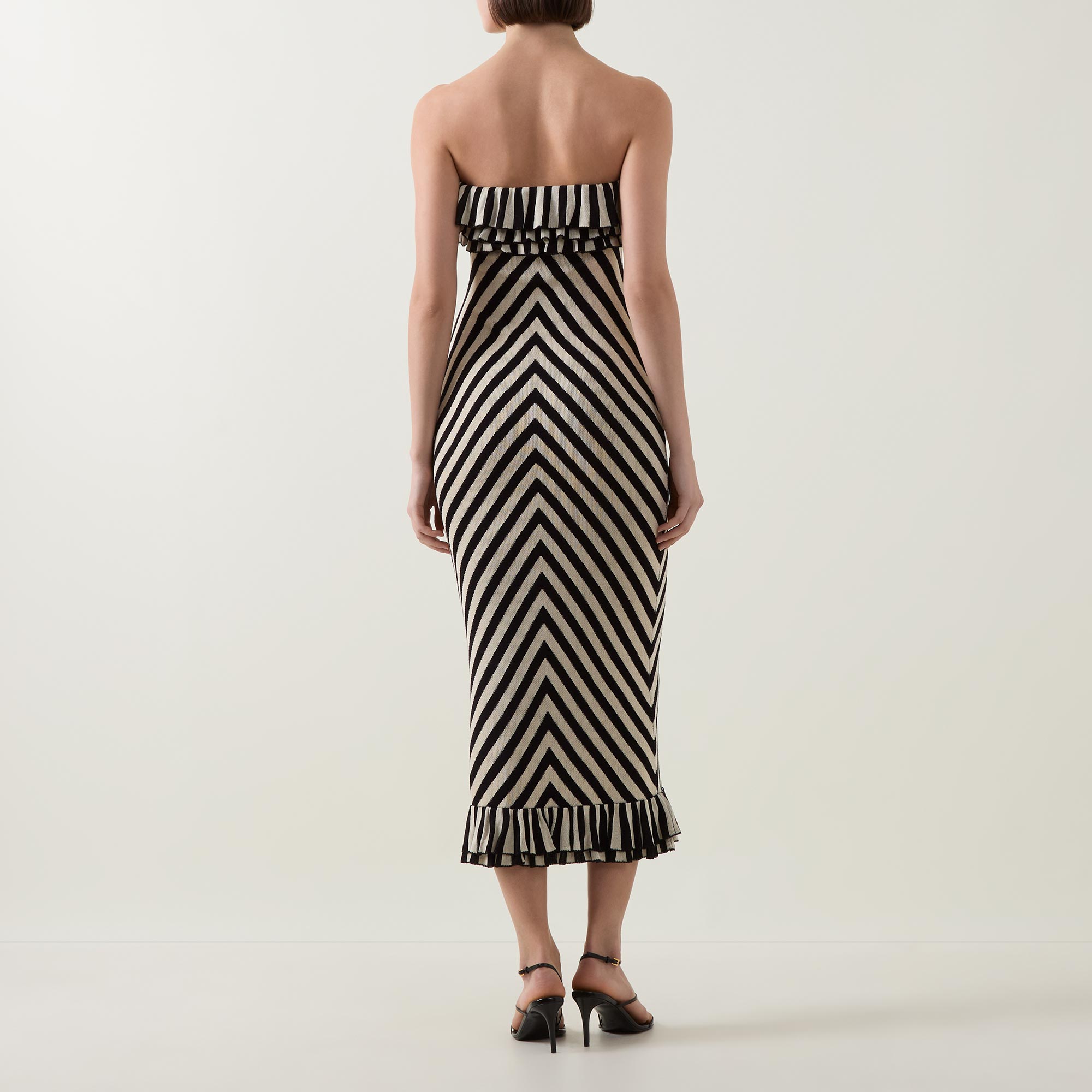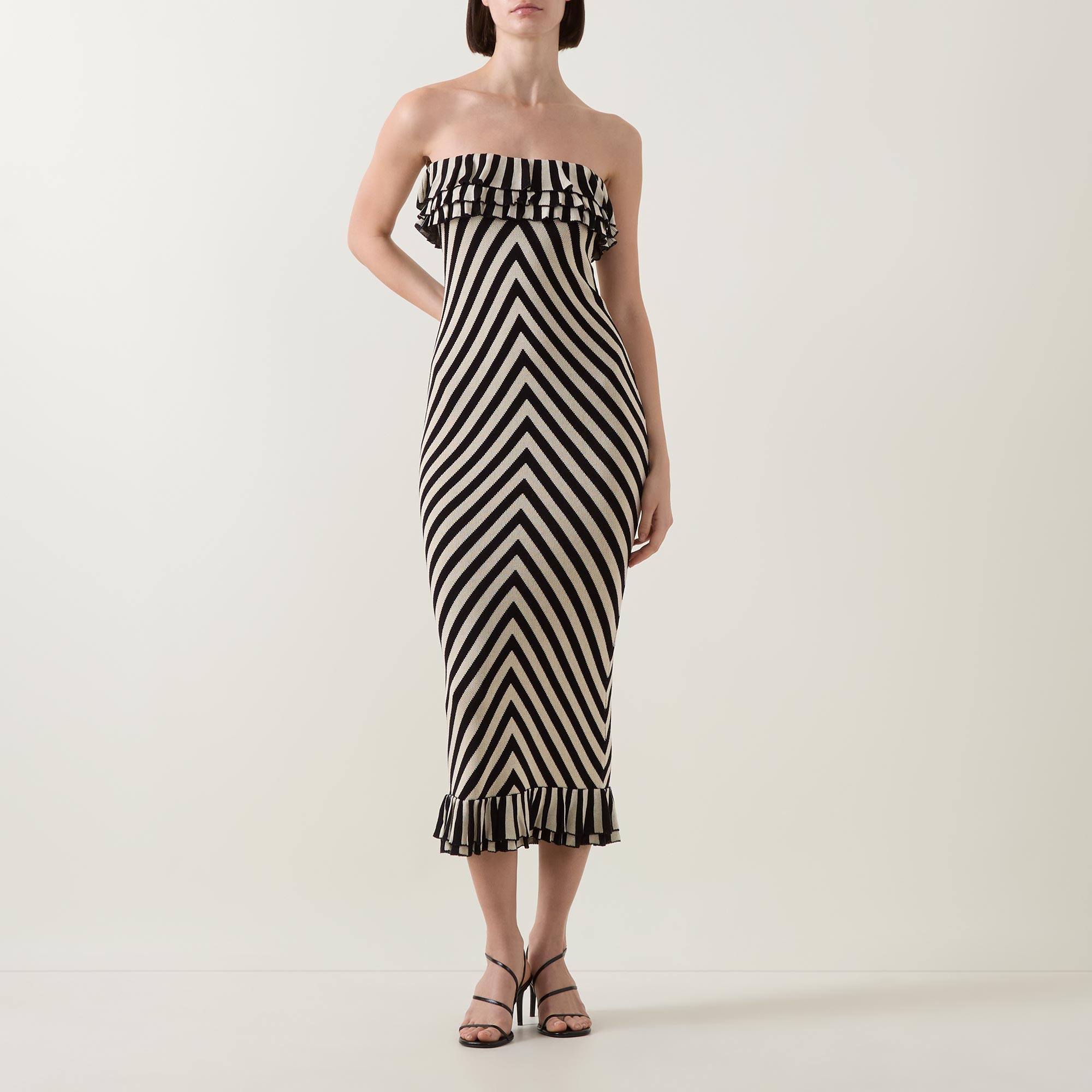 - Off-the-shoulder neckline, strapless, ruffle detailing, fitted through the waist and hips, straight hem with additional ruffle detailing, chevron striped design, midi length, smooth finish