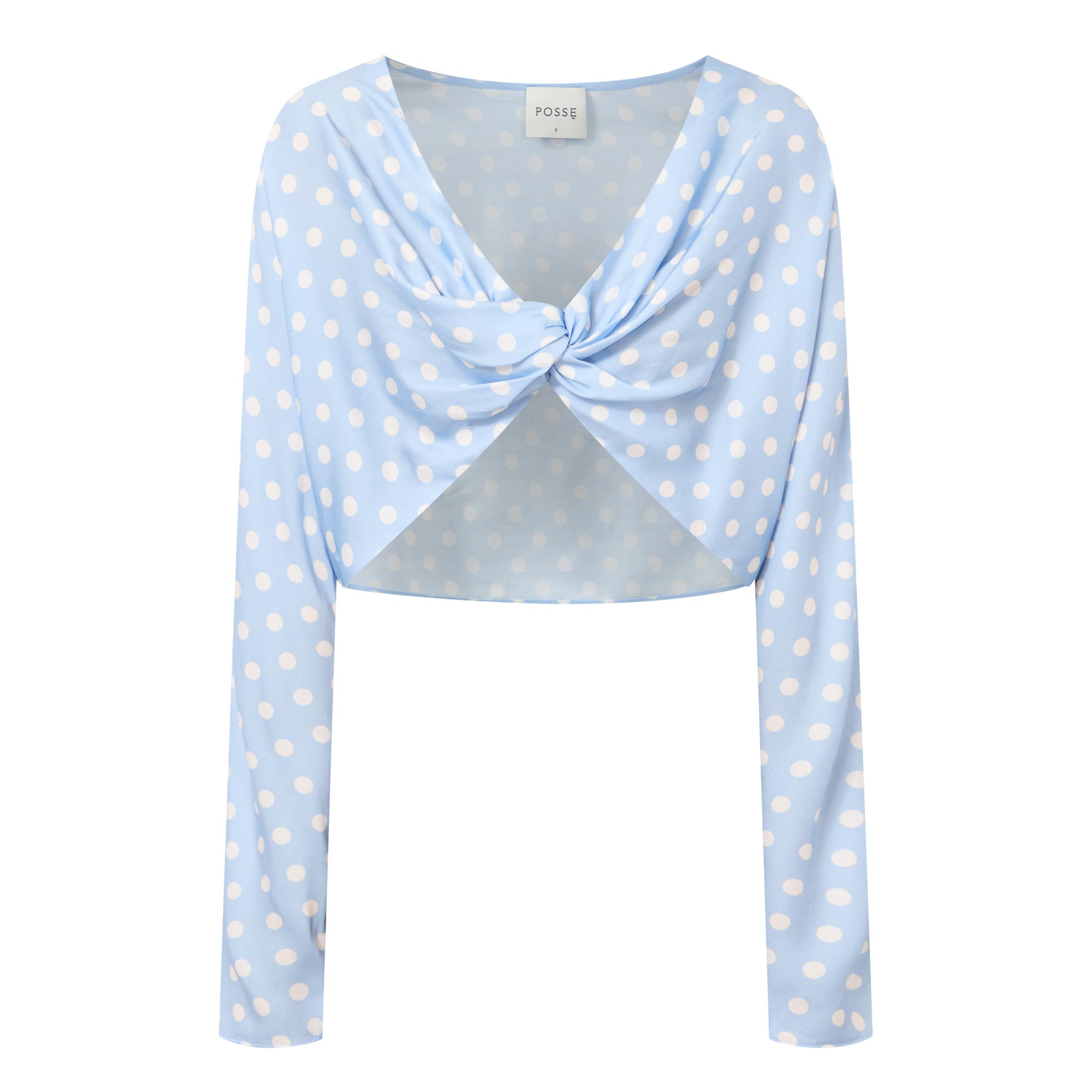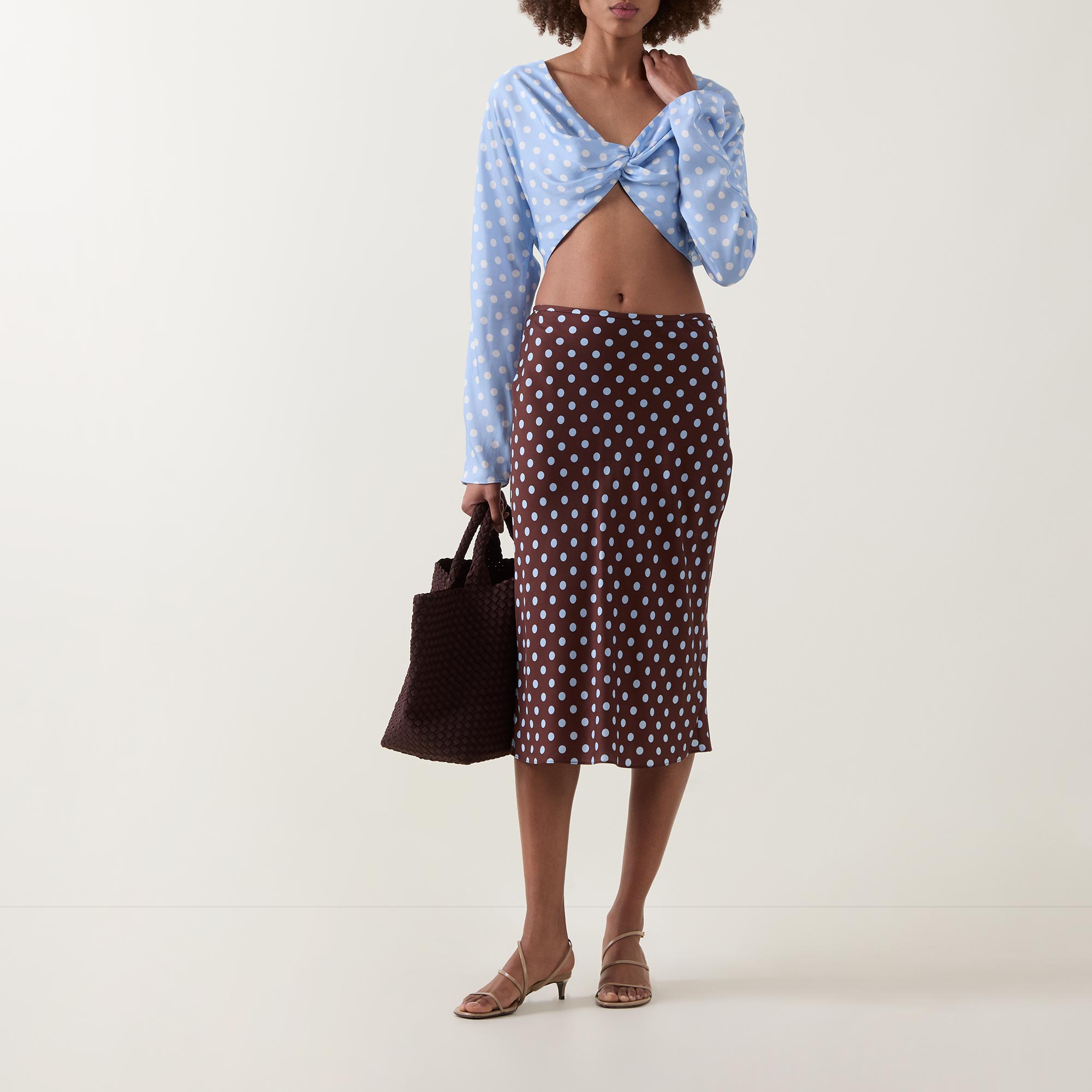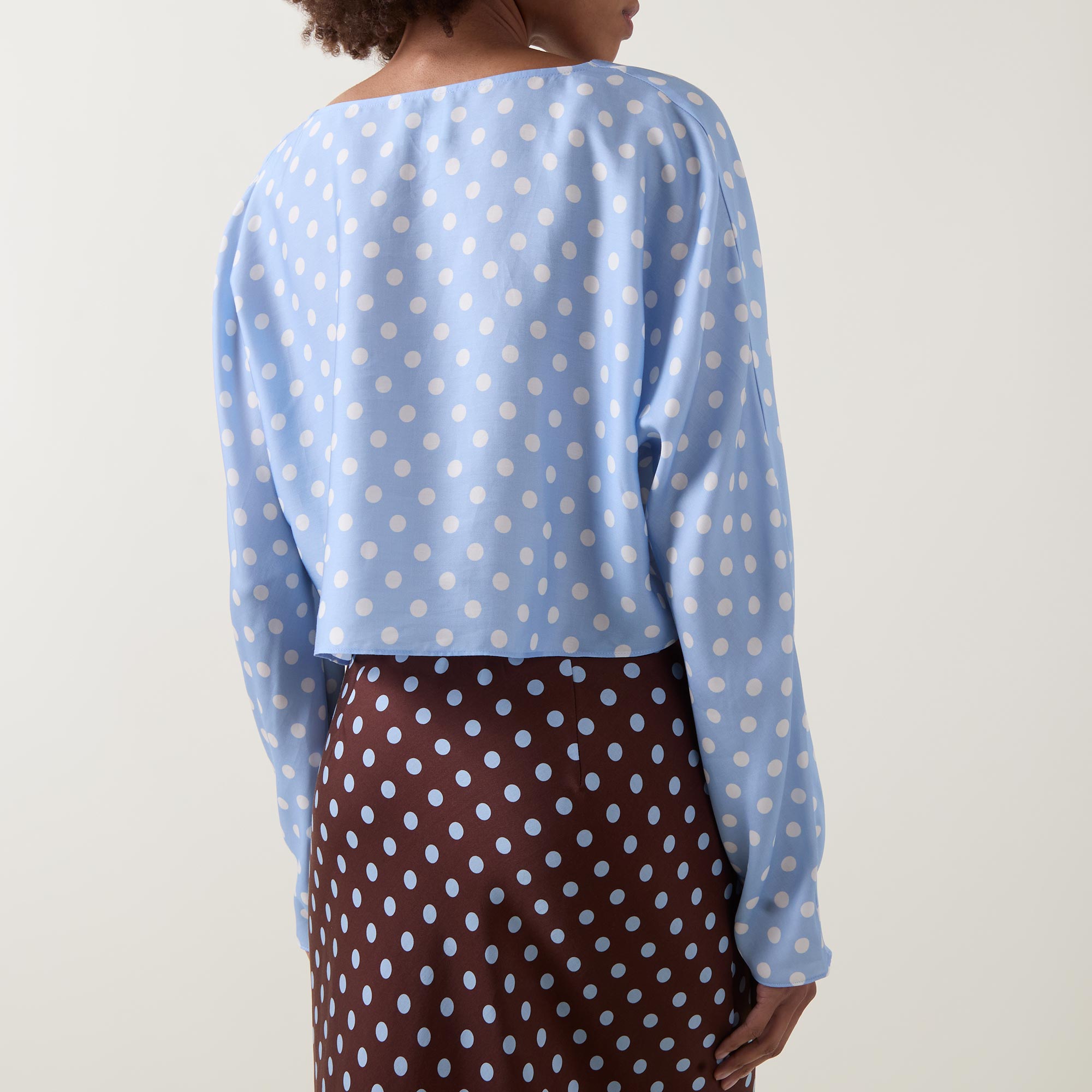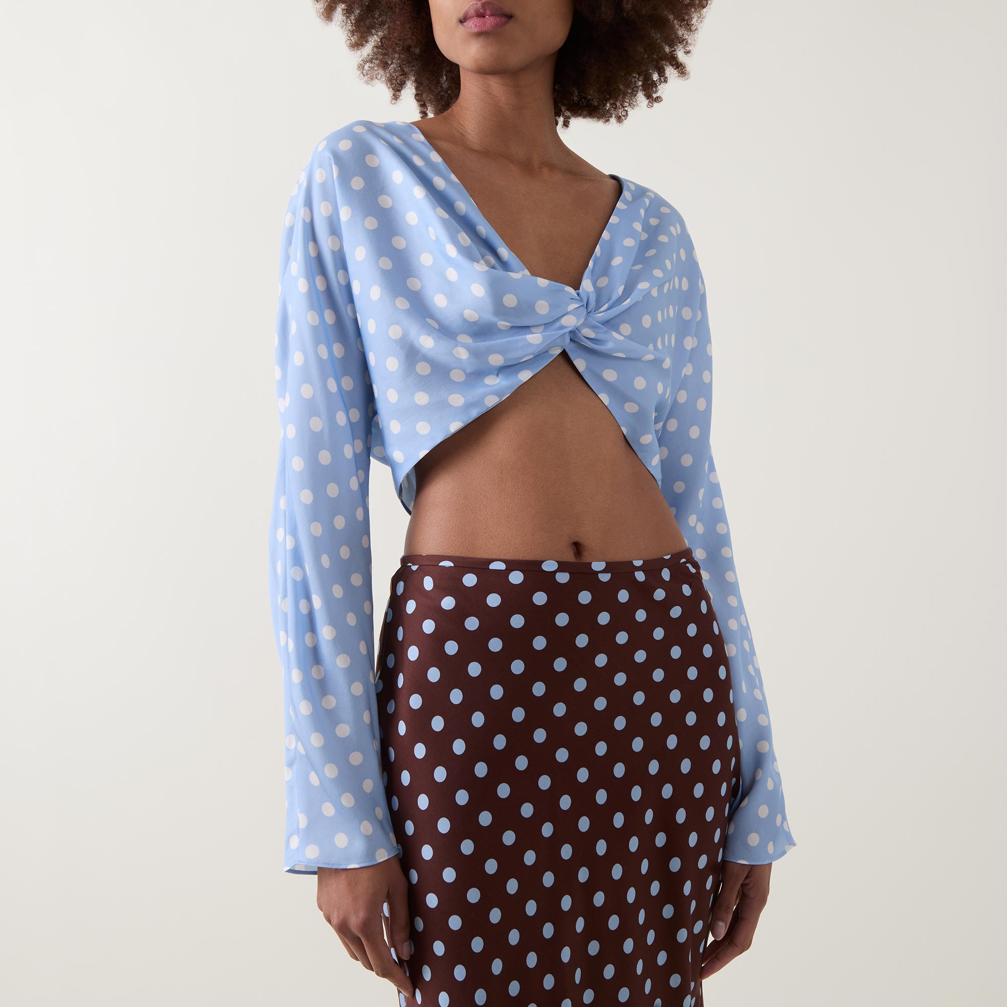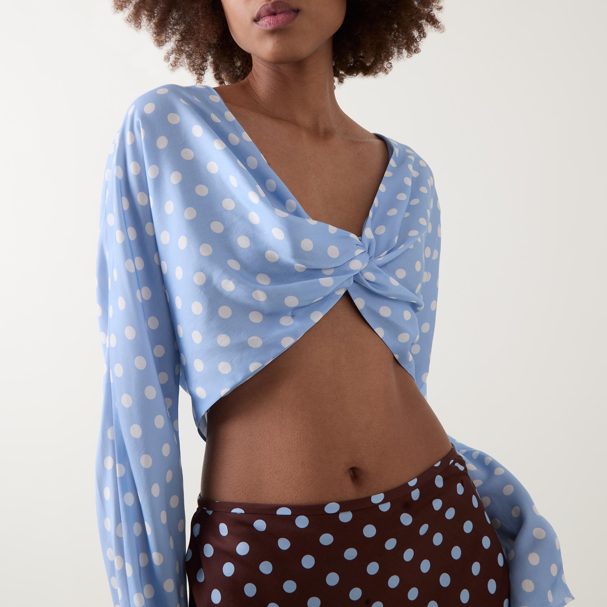 - V-neckline, twist detail, cropped length, long sleeves, polka dot pattern, smooth satin fabric