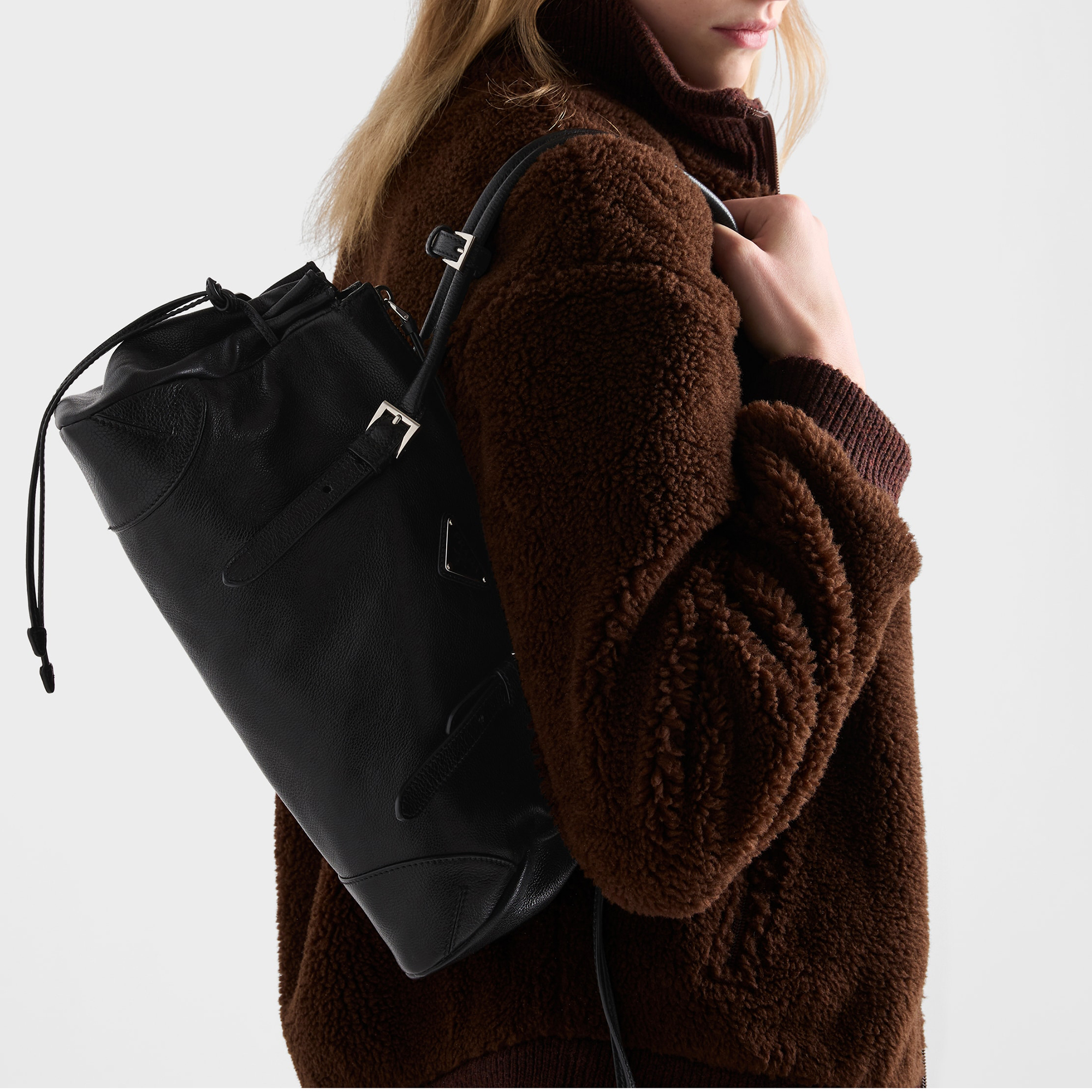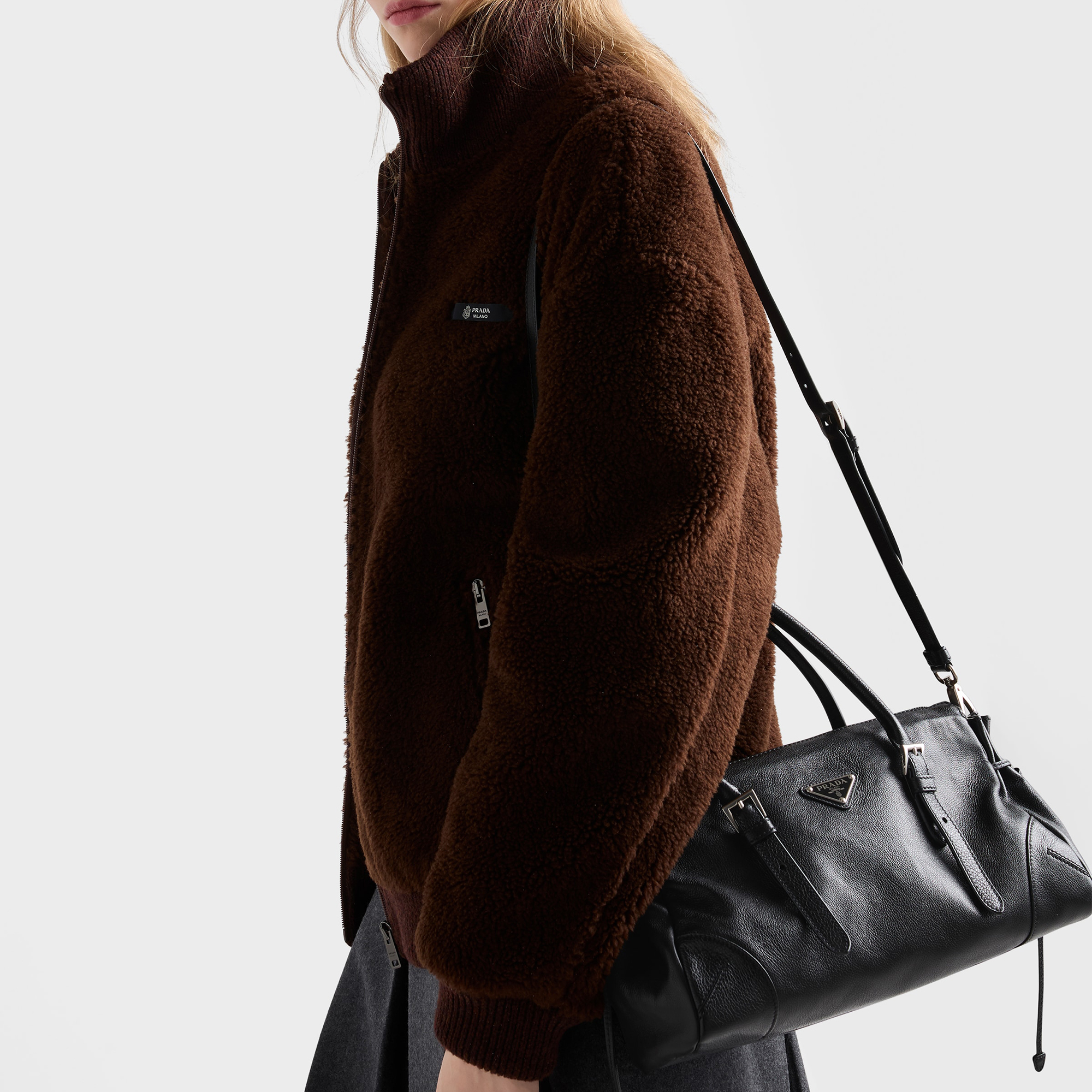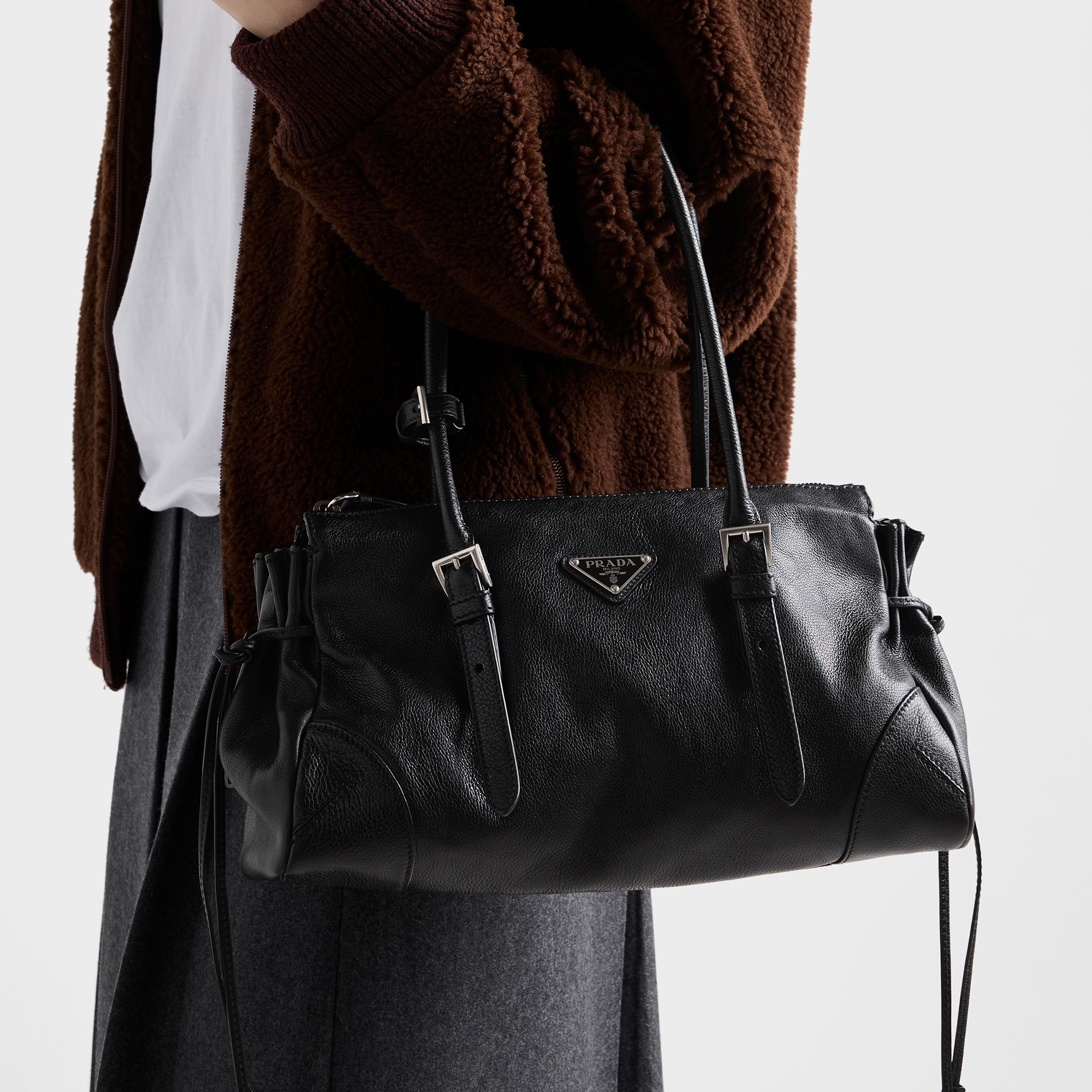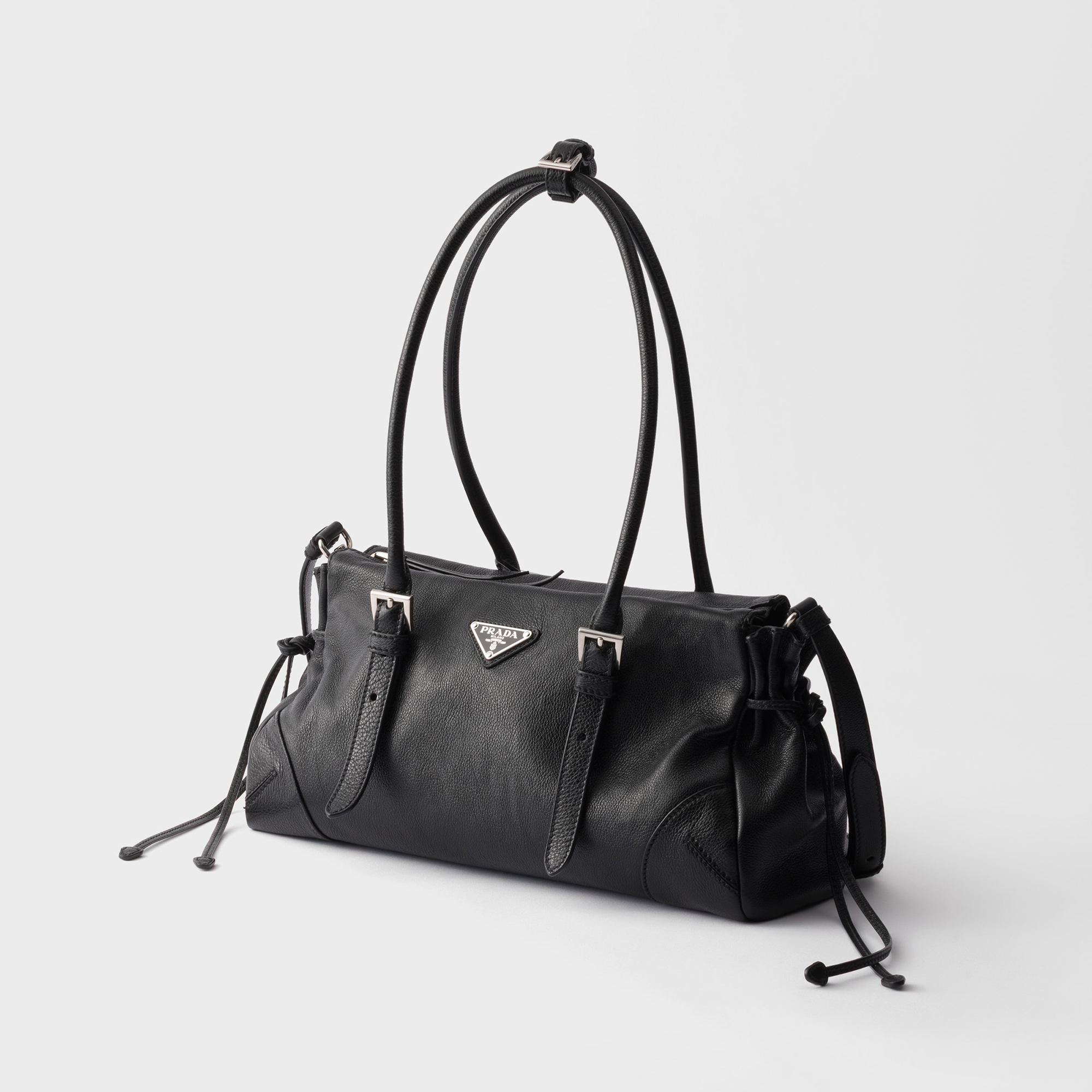 • Leather handles drop, detachable and adjustable shoulder strap, metal hardware, enamelled metal triangle logo on the front, zipper closure