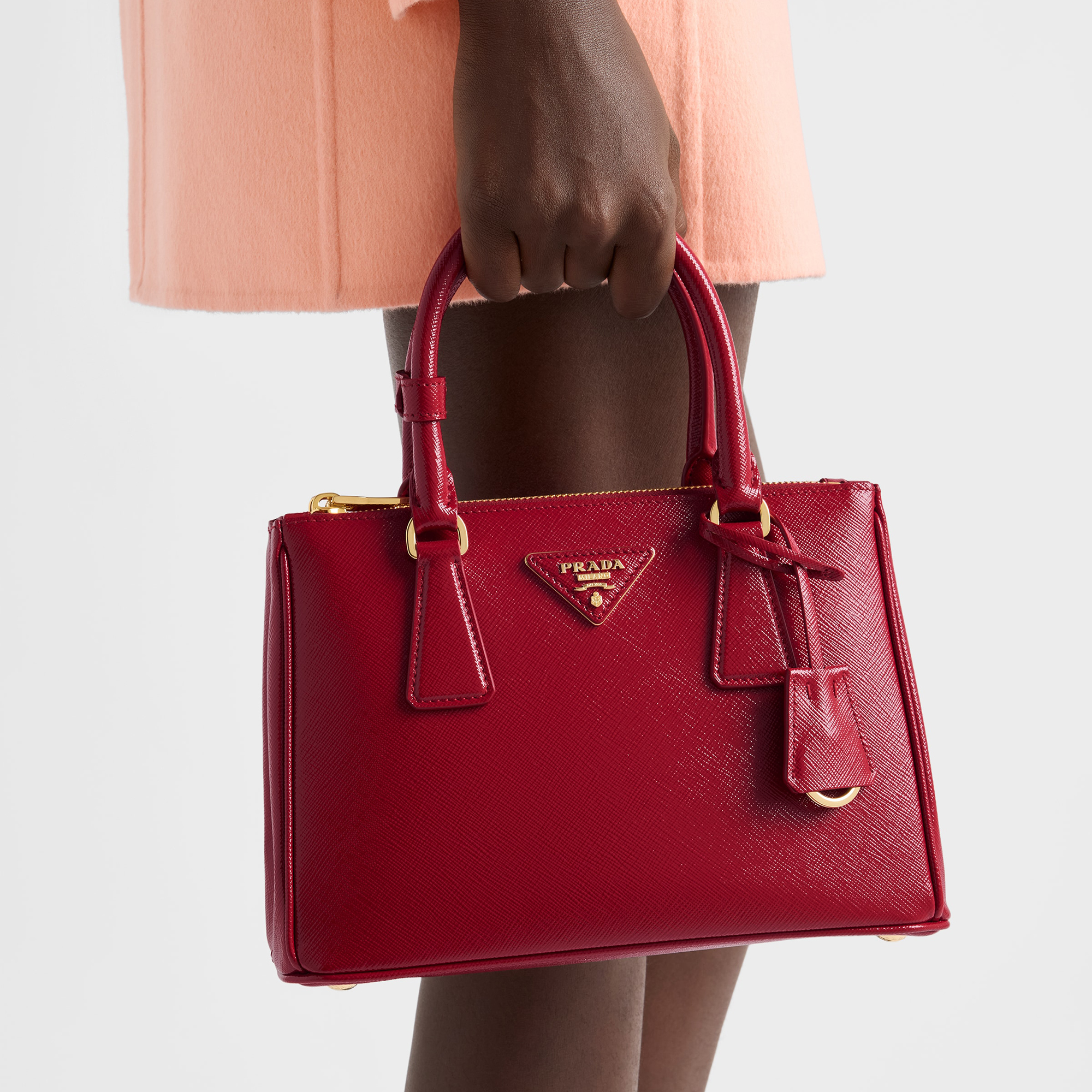 • Patent Saffiano leather, carry handles, detachable and adjustable leather shoulder strap, removable key ring, external zipper pockets, metal hardware, leather triangle with metal lettering logo, snap closure on the sides, protective purse feet