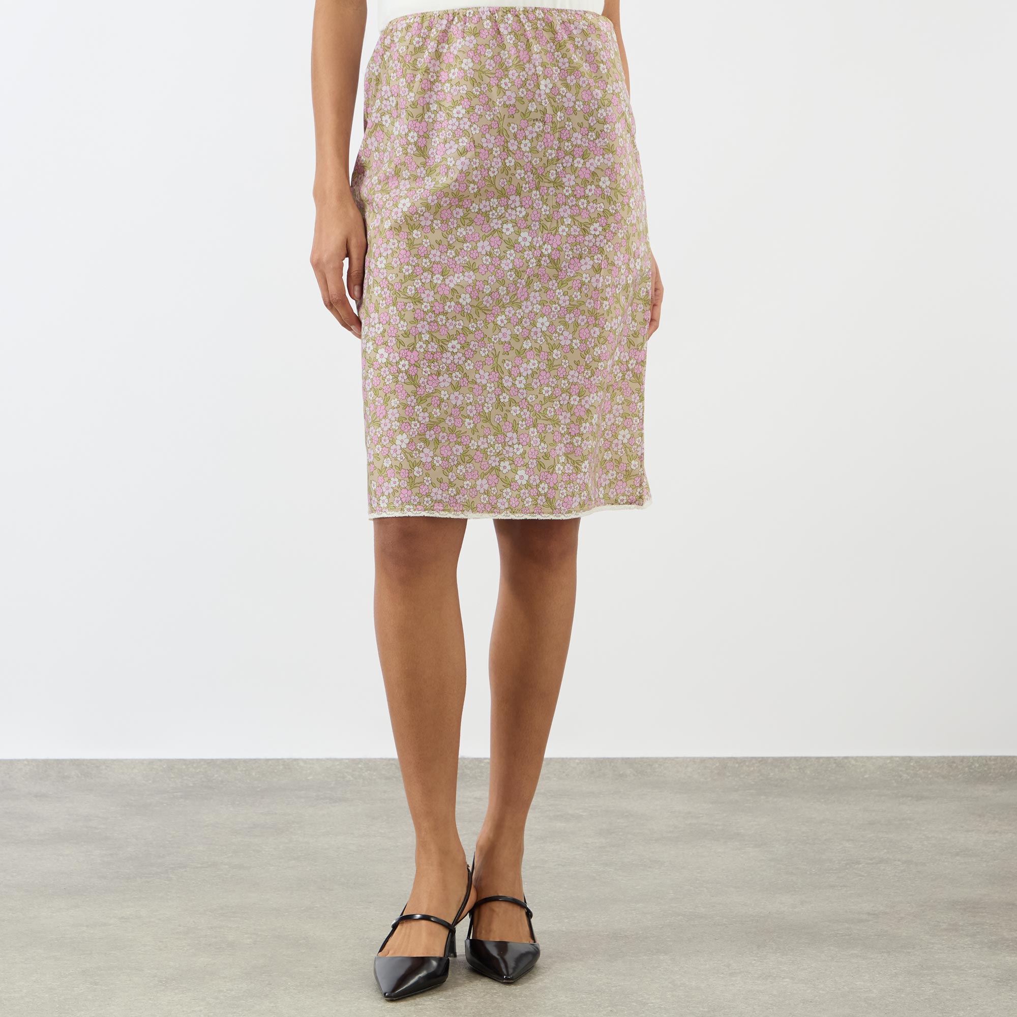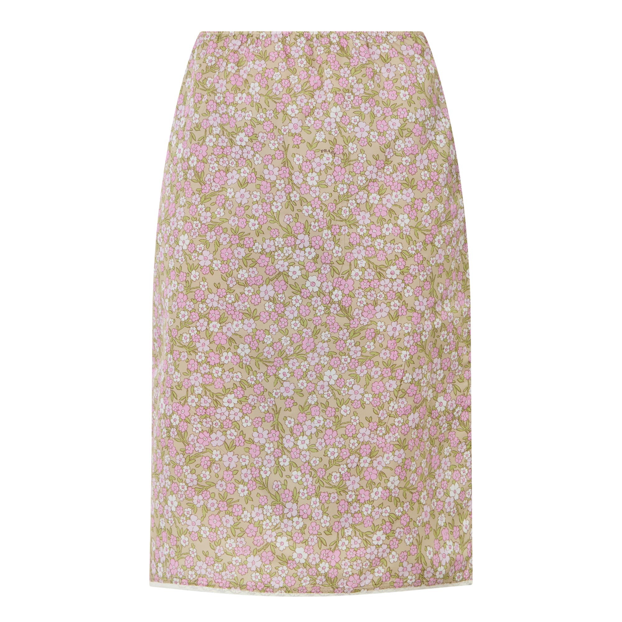 Soft pastels meet earthy neutrals throughout Prada's SS26 collection, creating a fresh yet grounded colour palette — take this skirt. Sitting high on the waist and cut to a pencil silhouette, it features an elasticated waistband for a comfortable fit and an all over ditsy floral print with micro logo lettering, before falling to a midi length.