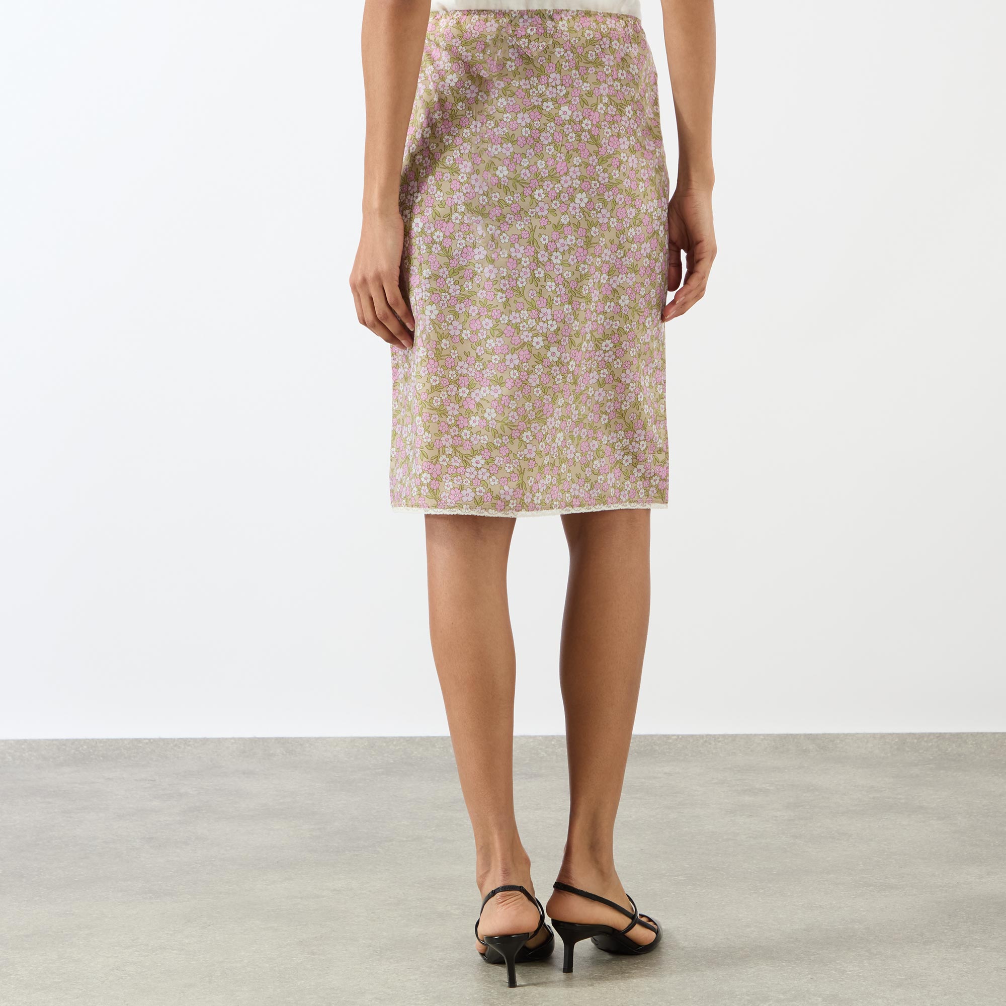 - High rise, pencil silhouette, elasticated waistband, straight hem, all over ditsy floral print, micro logo detailing, midi length