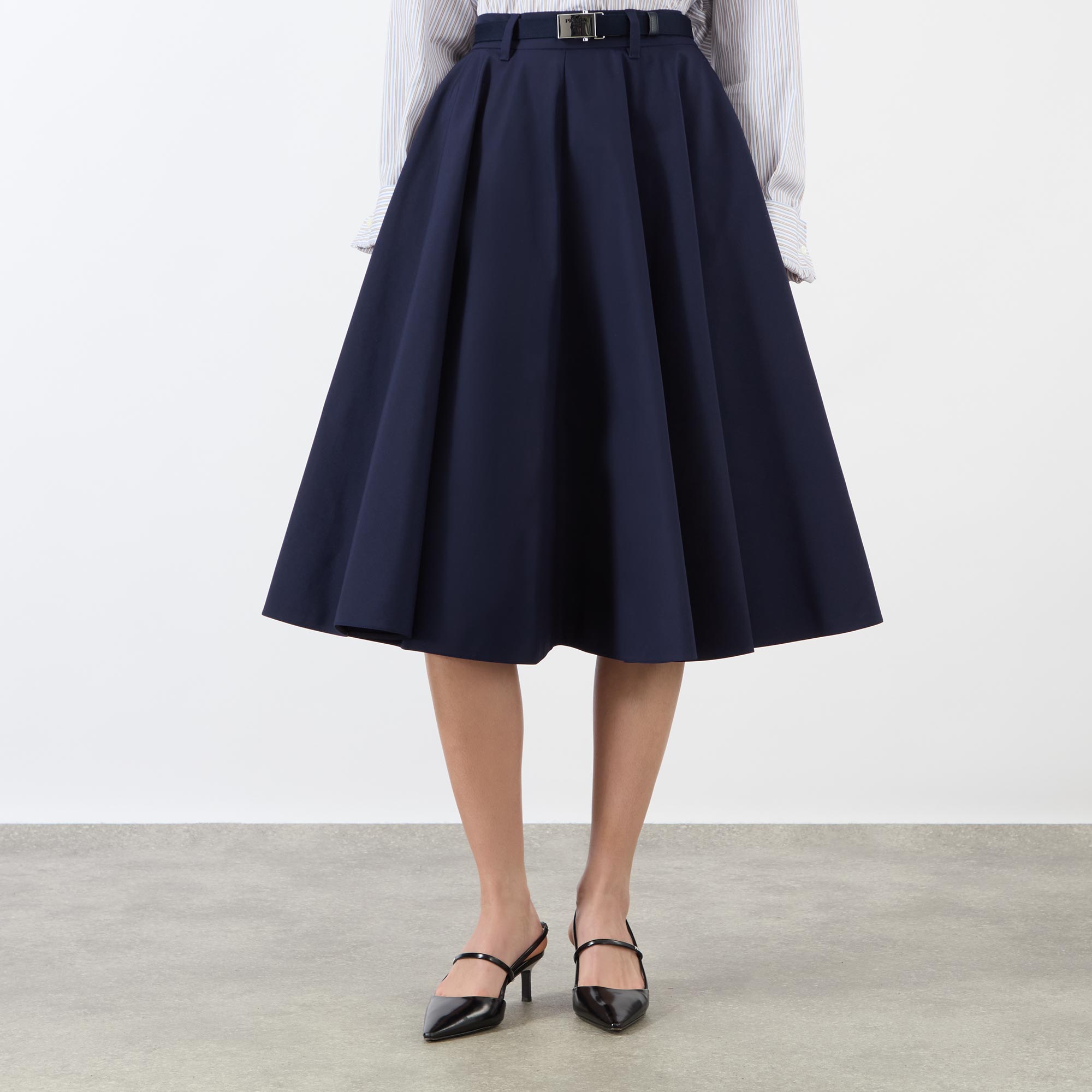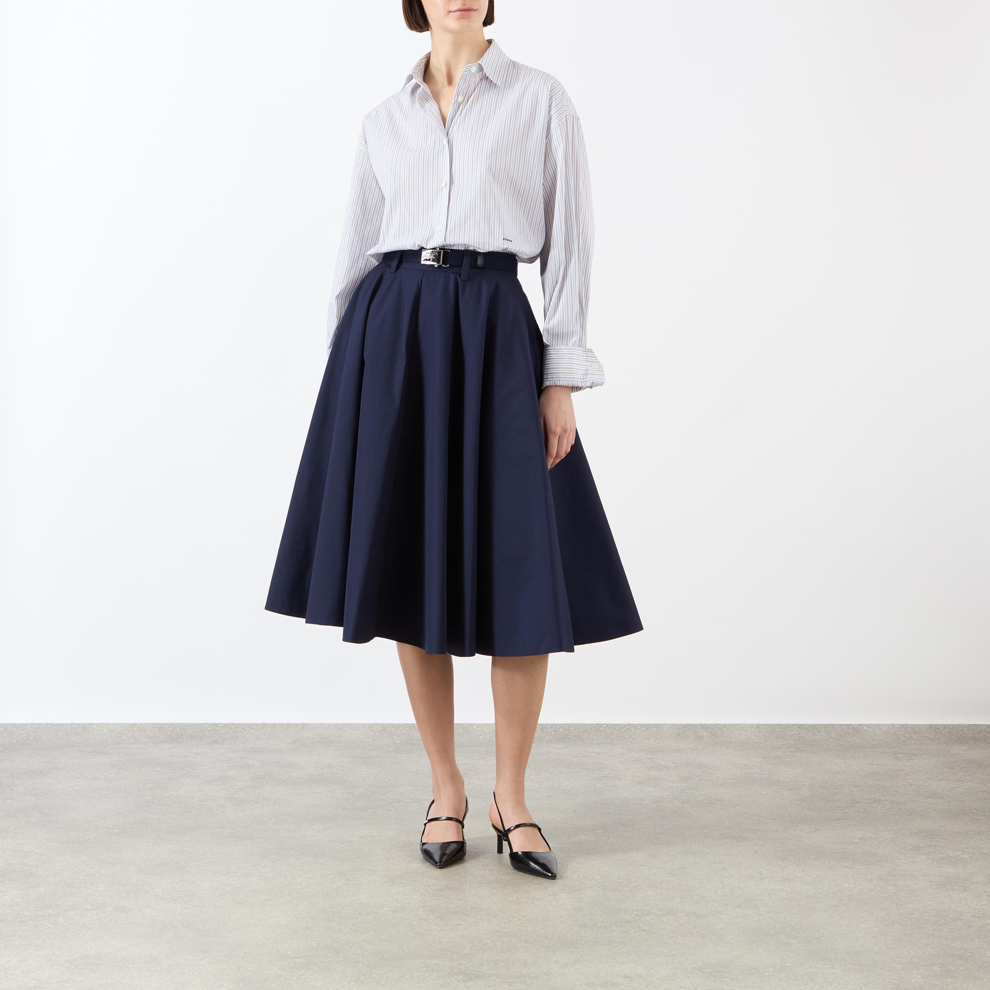 Some of the standout womenswear pieces from Prada this season embrace structured yet fluid shapes, as seen in the design of this skirt. Crafted from a soft cotton blend, it sits high on the waist, features two practical in-seam pockets and is cut with precise, crisp pleats. Cinched with a belt engraved with the label’s logo on the buckle, it elegantly flares to a fluid midi-length finish. Tuck in a shirt and team with pumps for a sleek, stylish edit.