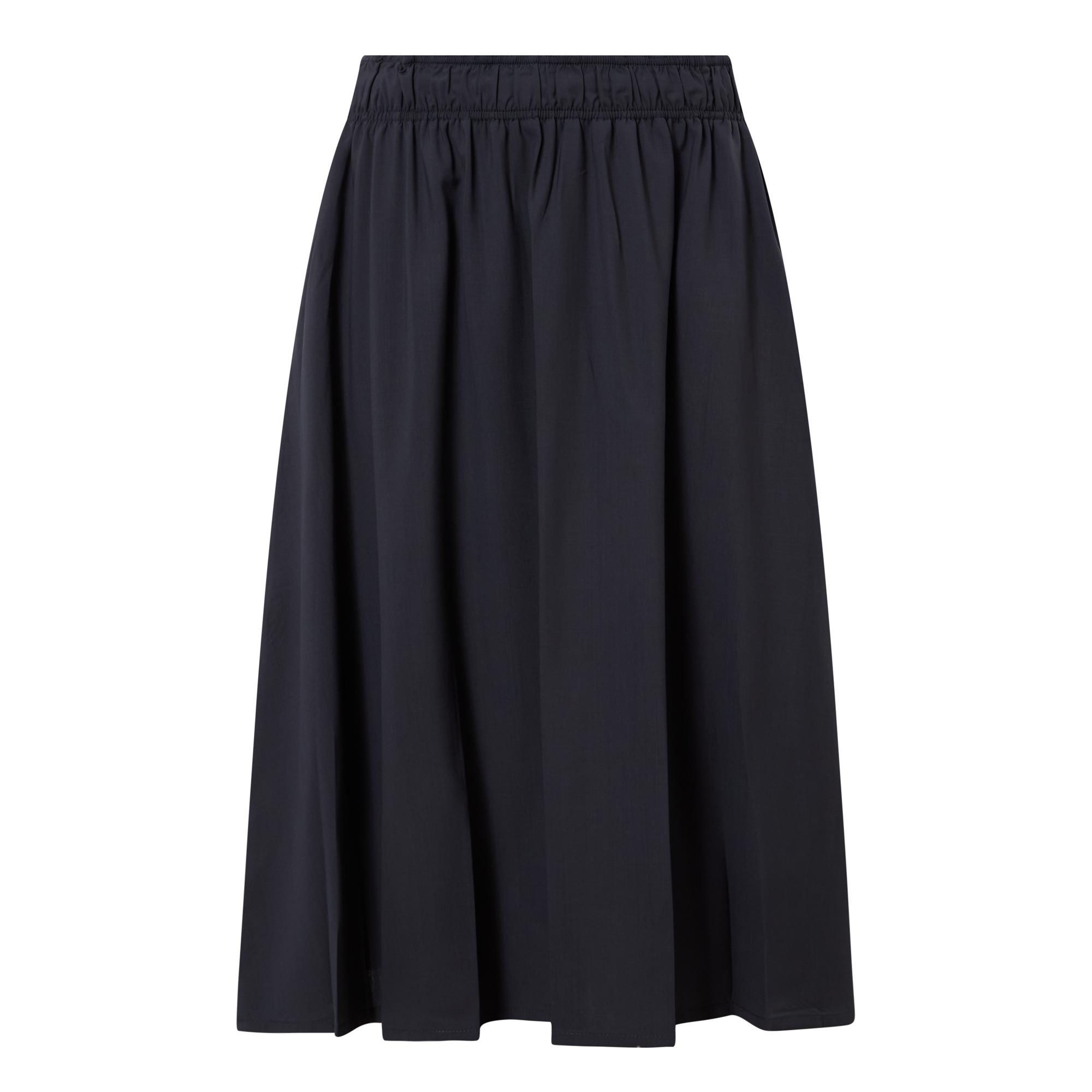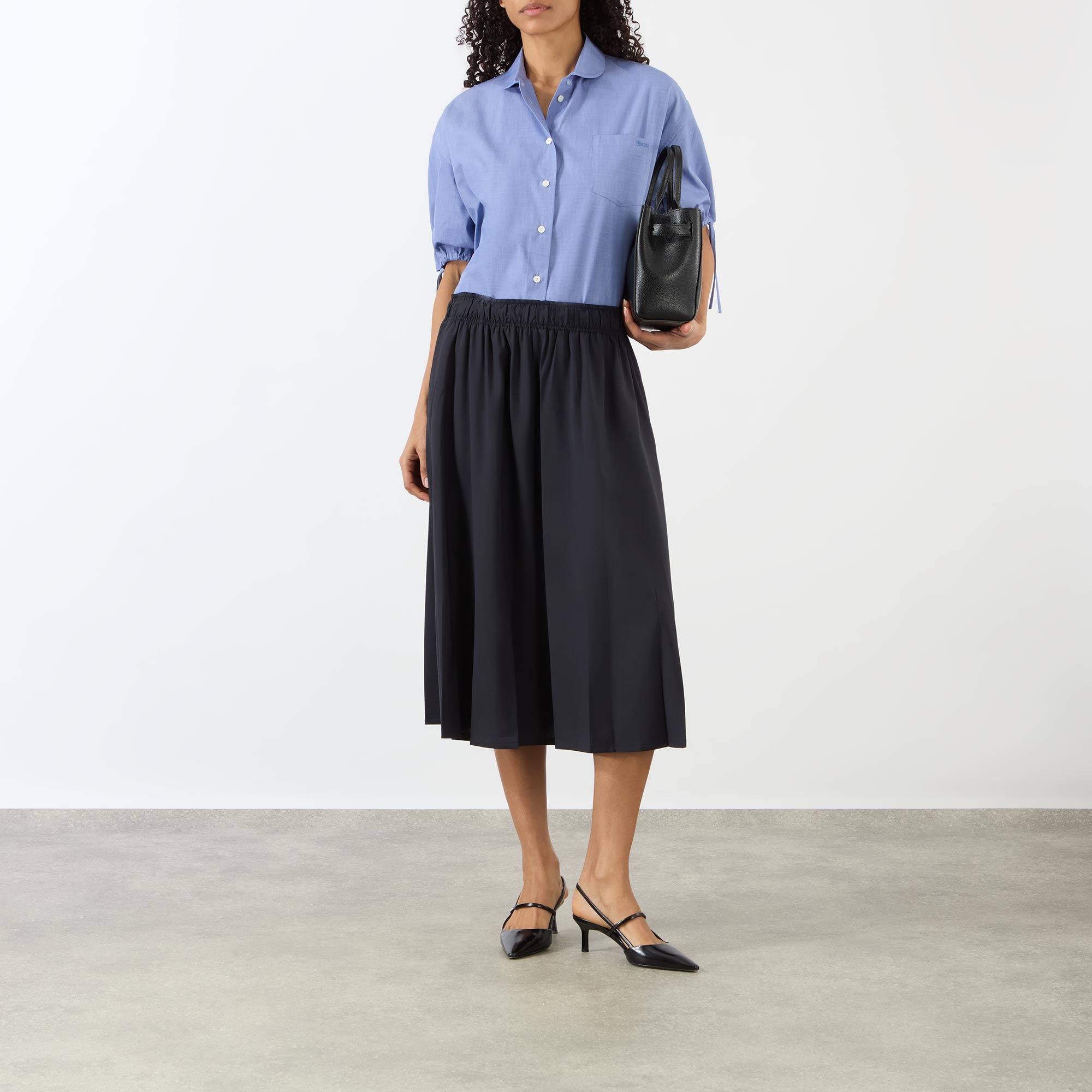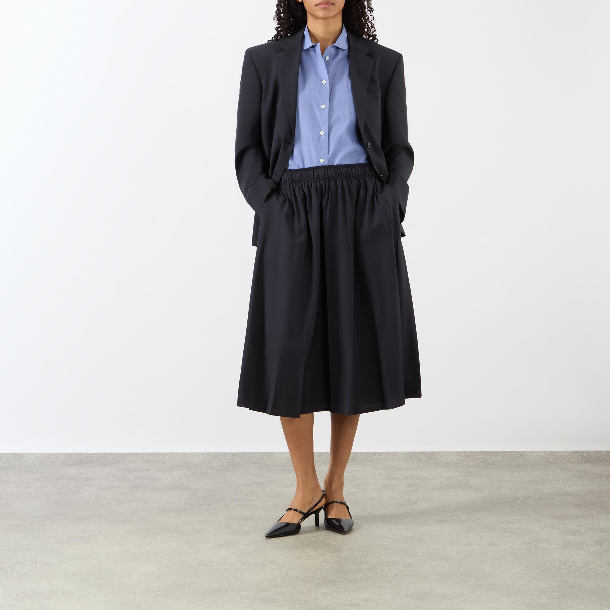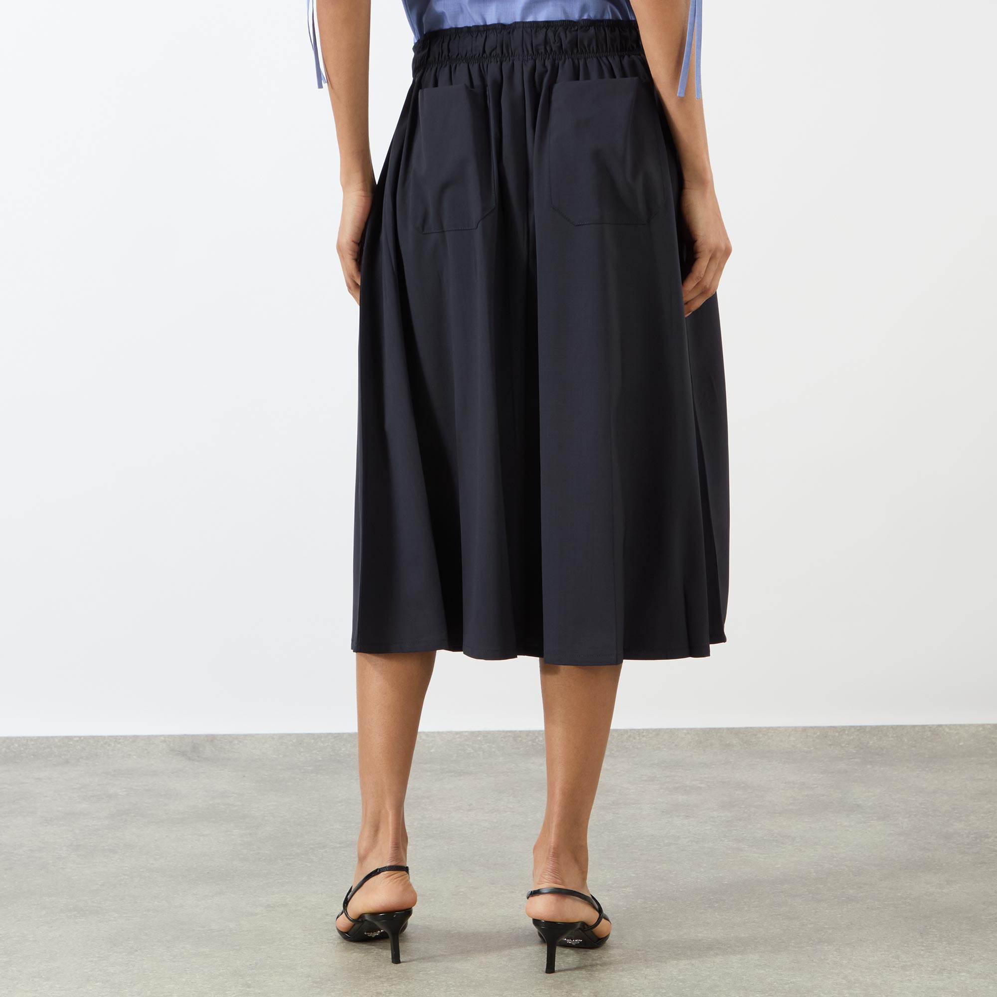 - Mid rise, flared silhouette, elasticated waistband, two side entry pockets, two rear patch pockets, tonal logo label to one side, pleating throughout, midi length