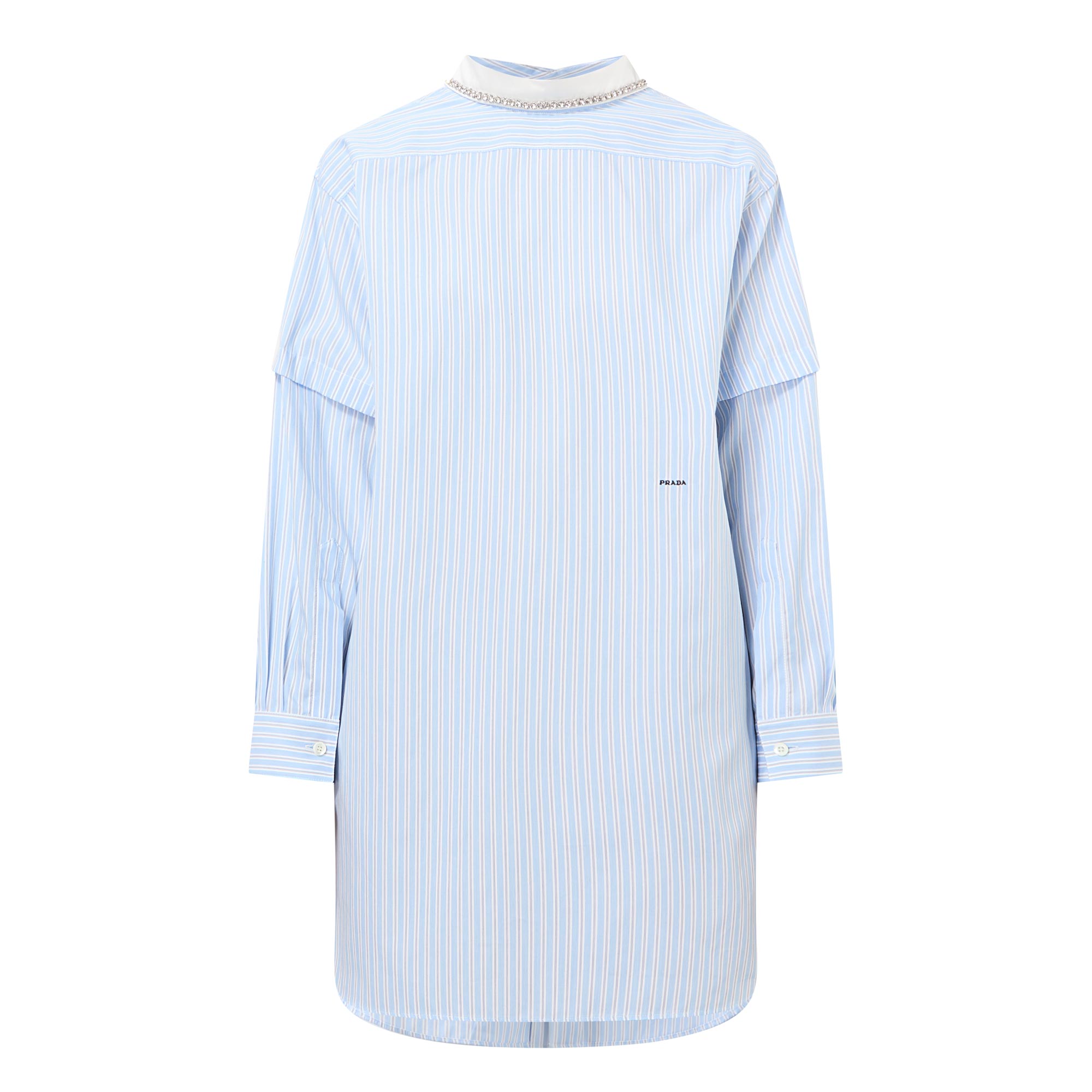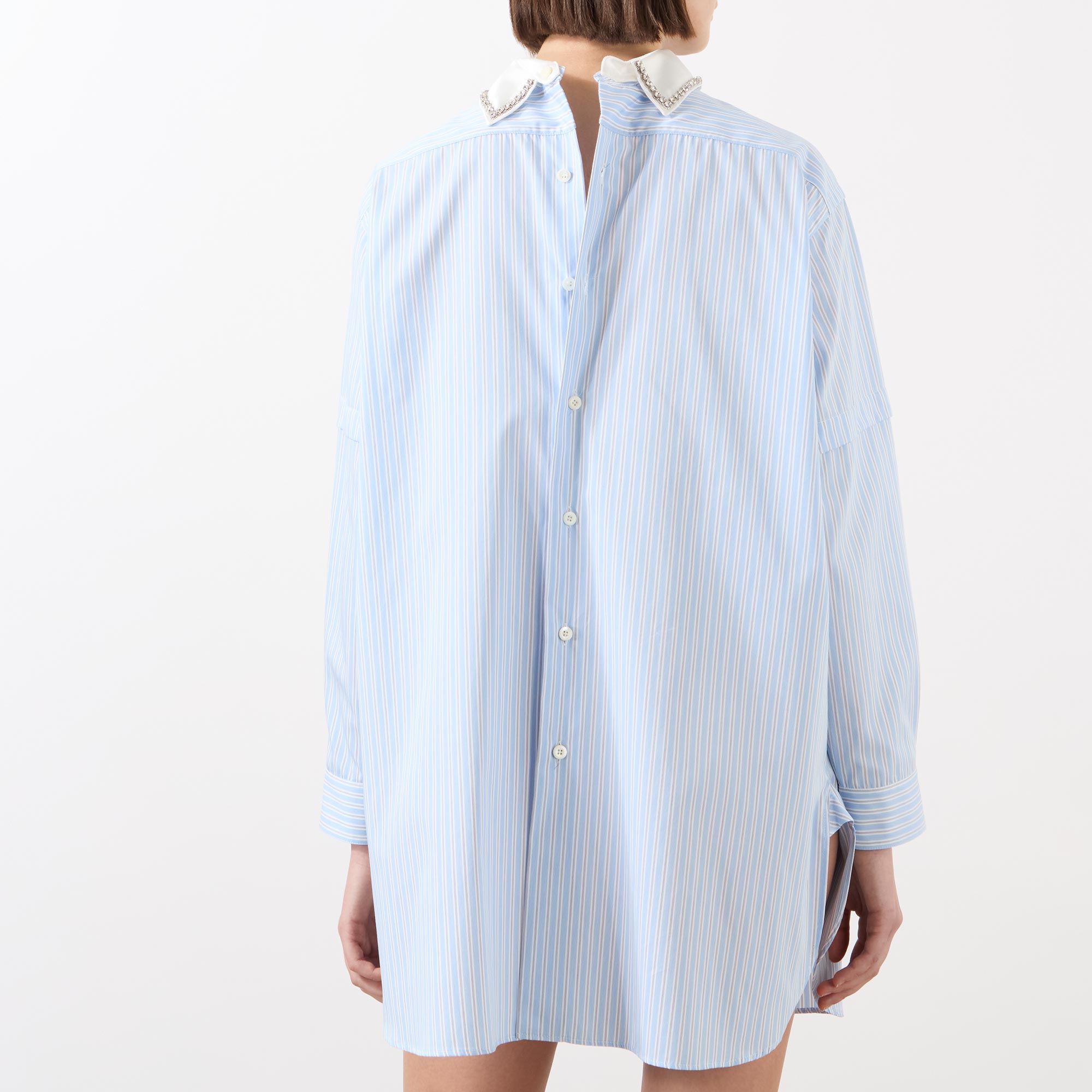 - Detachable collar with beaded embellishment, pinstripe pattern, long sleeves, dropped shoulders, mini length, single-cuffs, button fastening to the rear, embroidered logo details