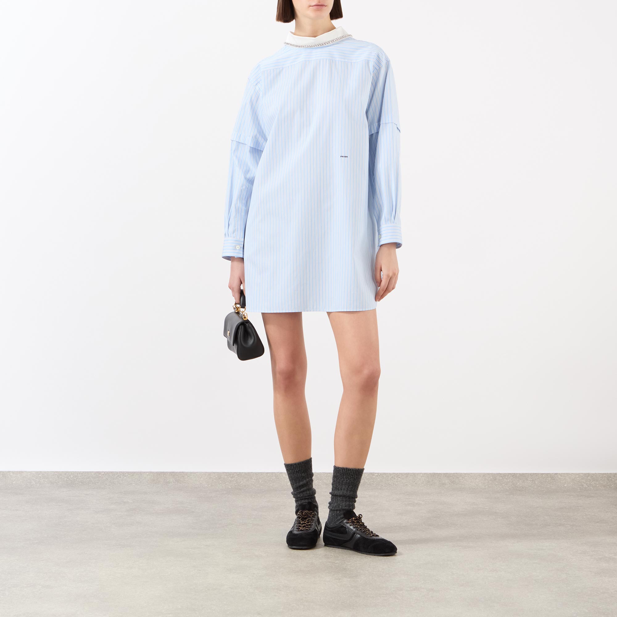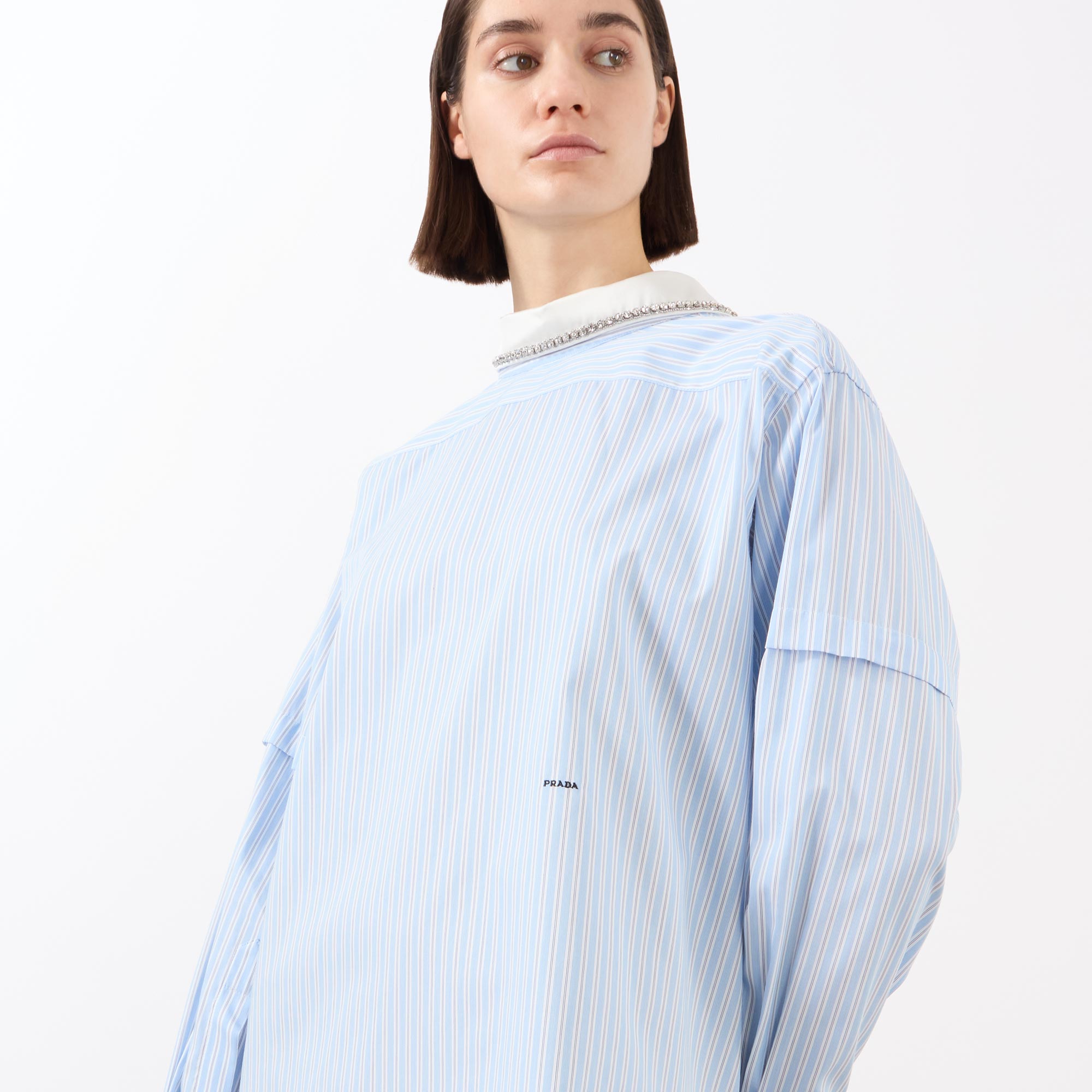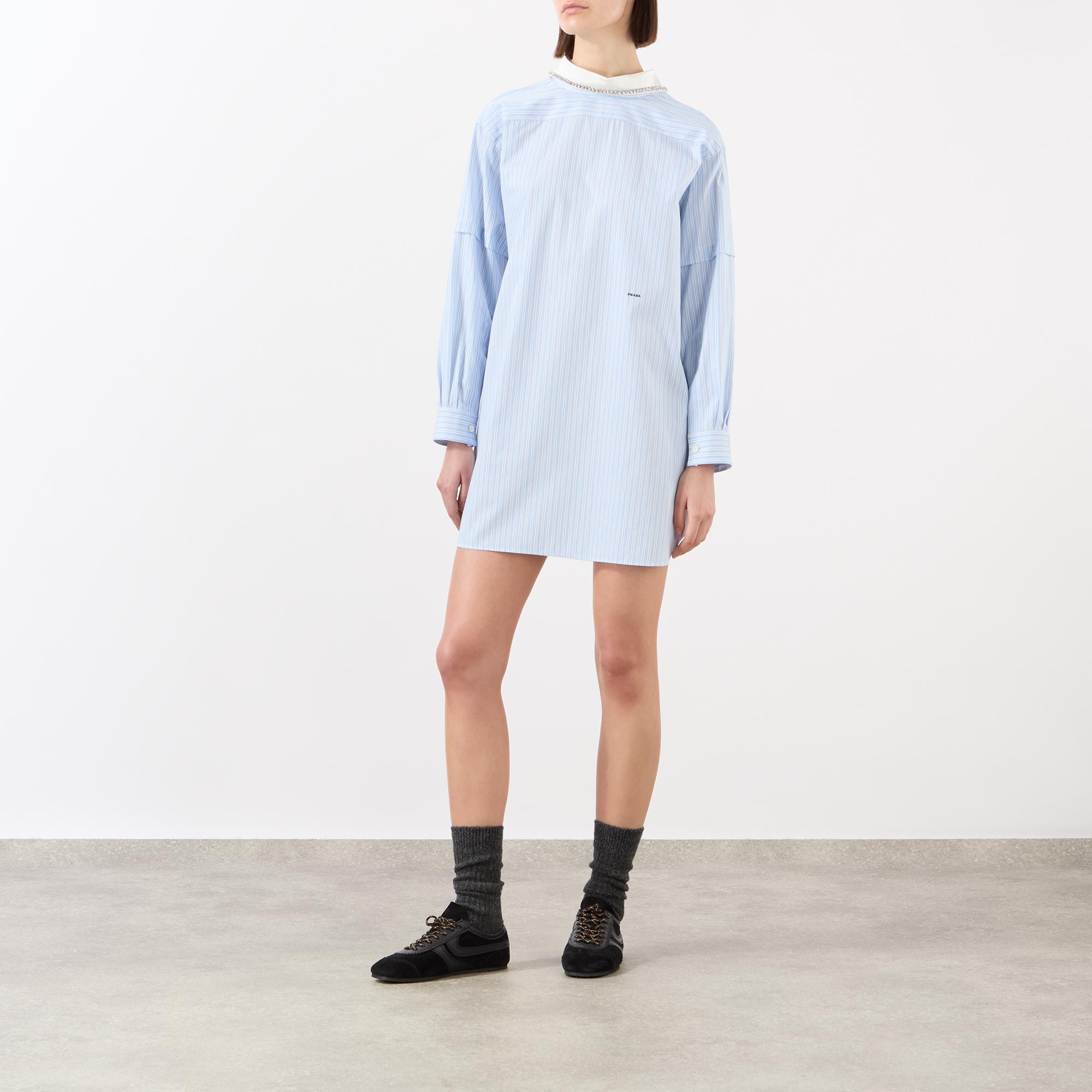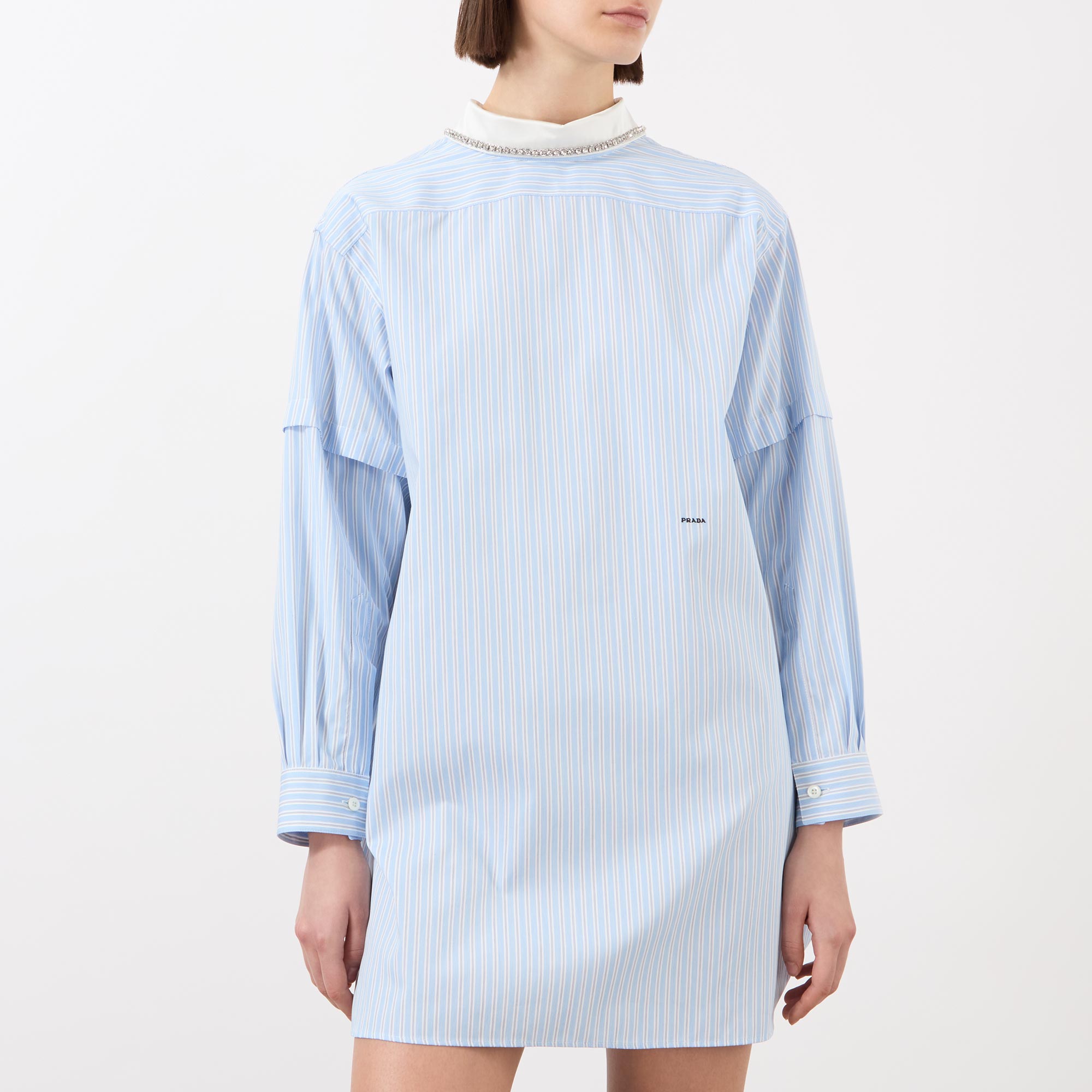Prada offer a playful approach to taut tailoring in the design of this dress from the SS26 collection. Cut from a pinstripe poplin fabric to a mini length, it is framed with a detachable collar with beaded trims and double-layered sleeves, finished with embroidered logo details.