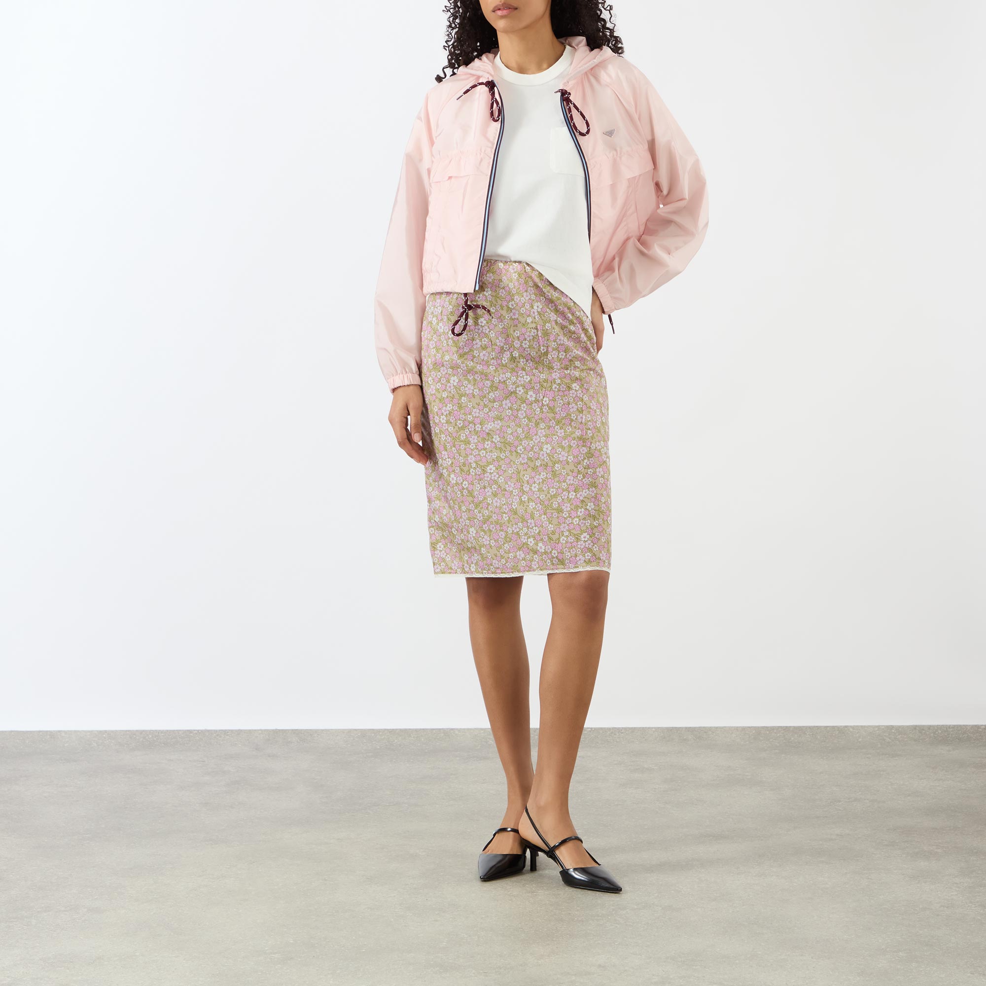 In Prada's new SS26 line, utility pieces carry weight, as seen in the design of this practical rain coat. Fitted with two handy in-seam pockets, it features an adjustable drawstring hood to keep the rain at bay, while it's equipped with an adjustable drawstring hem and elasticated cuffs for all-day comfort.