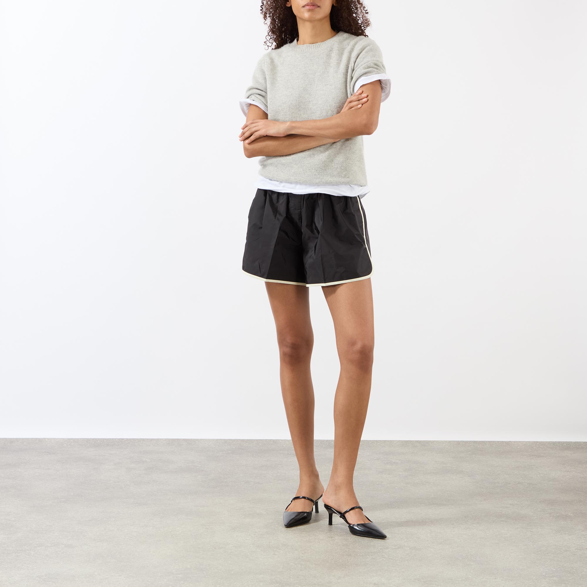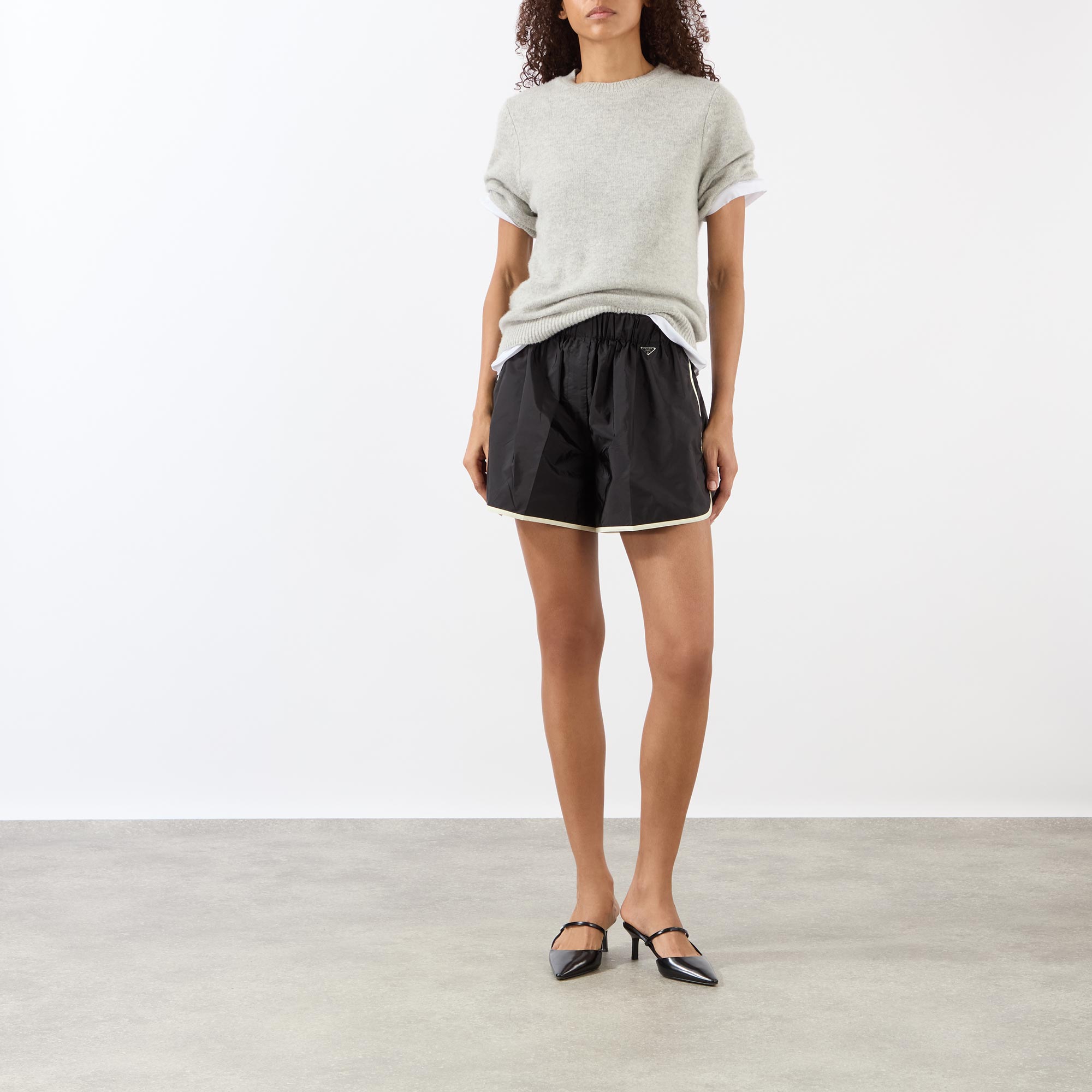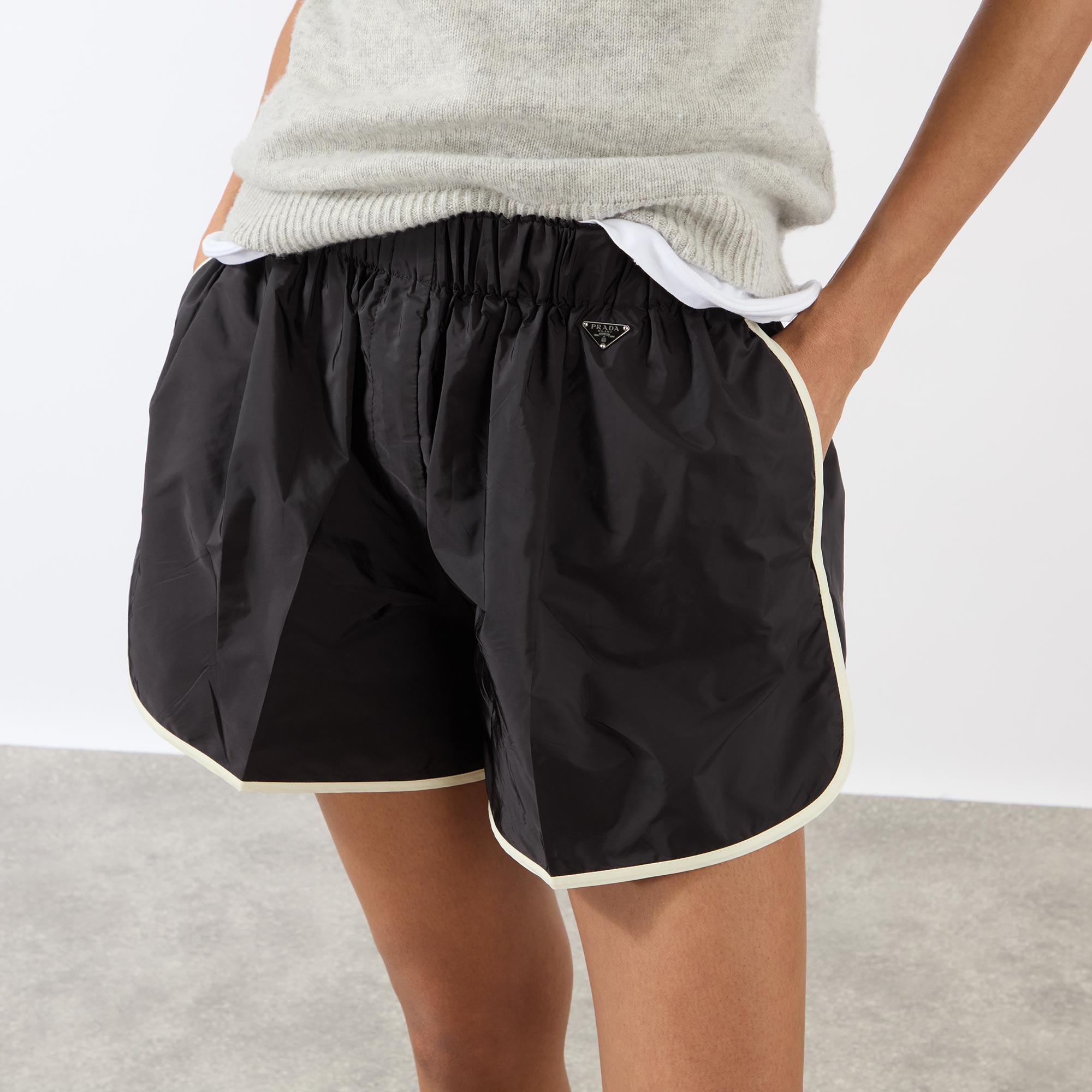 Prada’s SS26 line signals a deliberate move away from traditional power dressing, favouring more relaxed, casual styles, such as these shorts. Sitting high on the waist with an elasticated waistband, they feature two practical in-seam pockets, contrasting trim for a playful touch, and are finished with the brand’s signature metal triangle logo plaque.