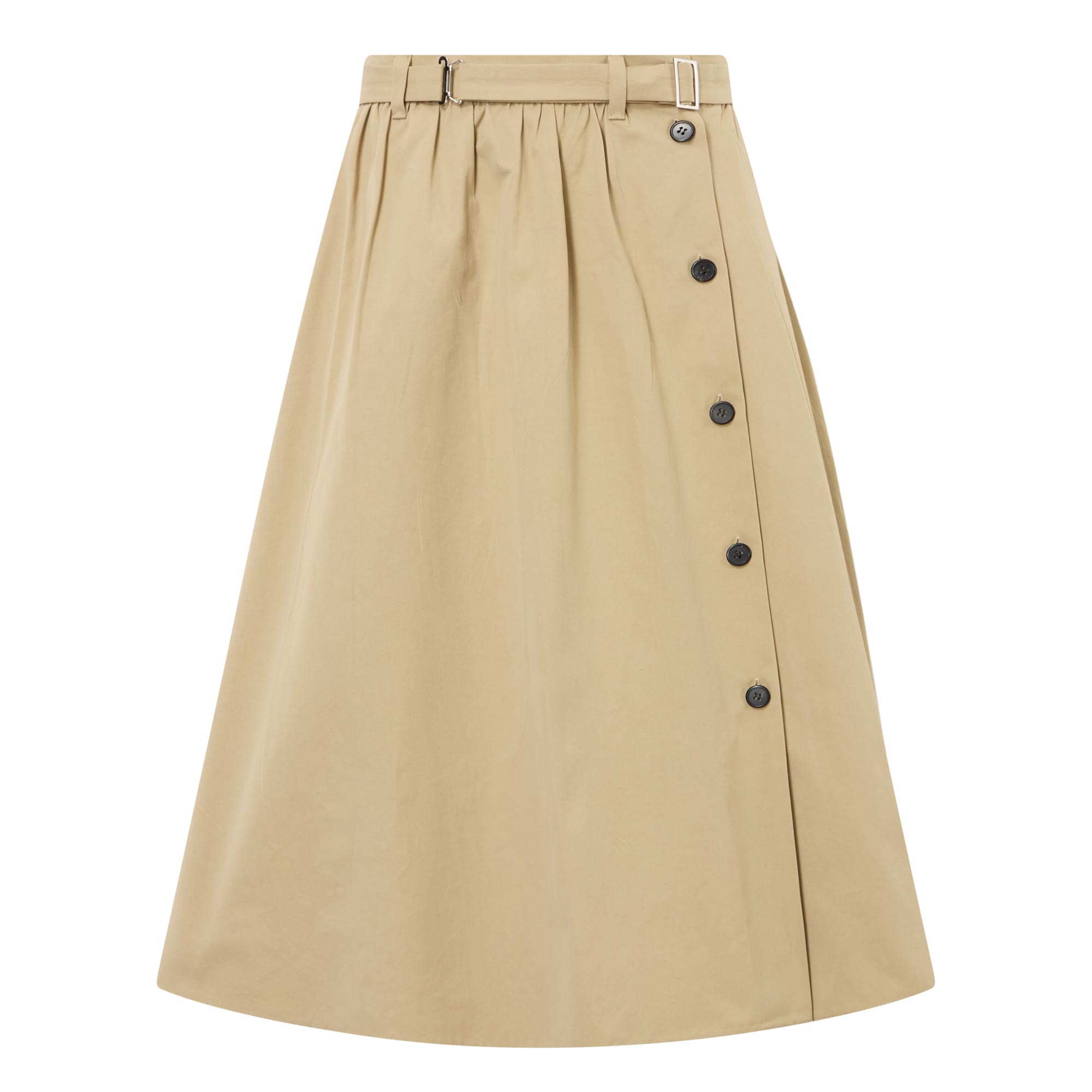 - Mid rise, flared silhouette, belt loops, matching belt with buckle fastening, side button placket, two side entry pockets, two rear patch pockets, silver-tone hardware, triangle logo detail, midi length