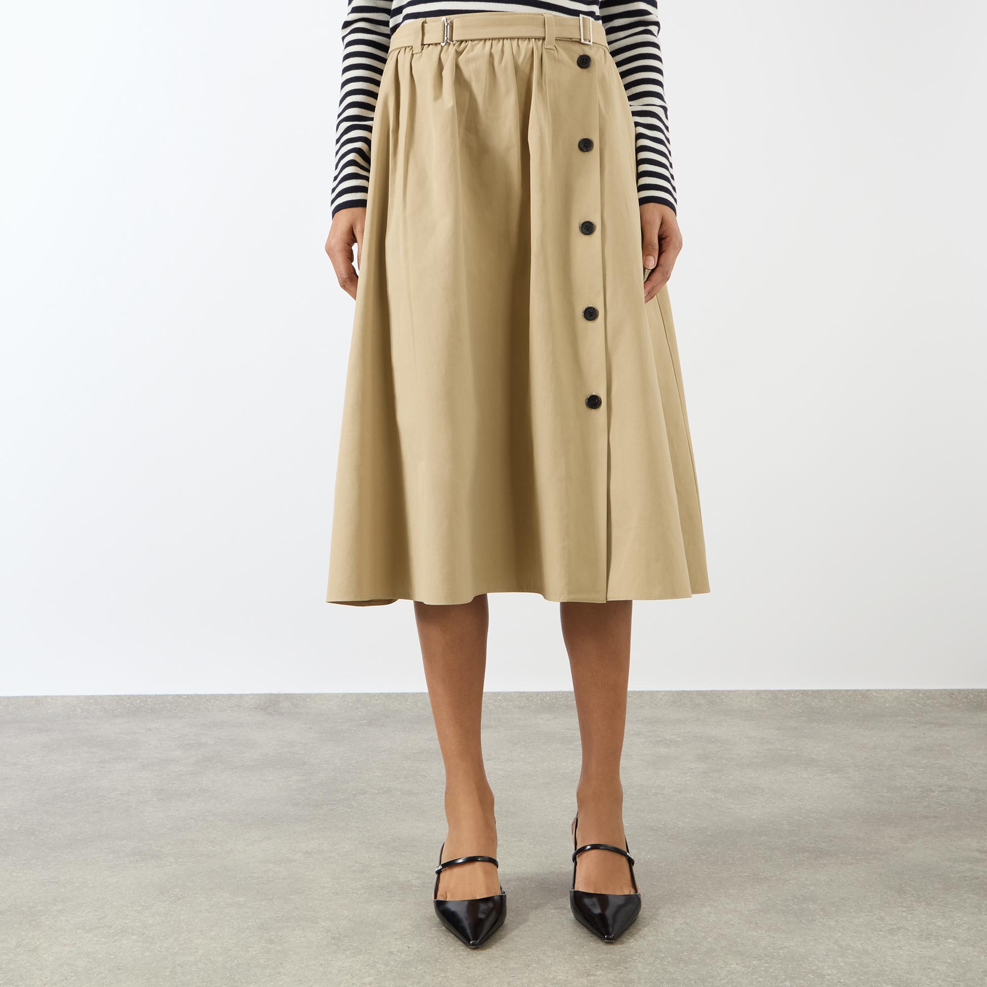 Prada's SS26 collection from Prada blends utility and elegance with clean lines and functional silhouettes — take this skirt. Cut to a flared, midi length, it sits mid rise on the waist and secures with a buckle fastening and side button placket, while boasting a selection of pockets to store your essentials and stamped with a triangle logo detail on the back for an unmistakable edit.