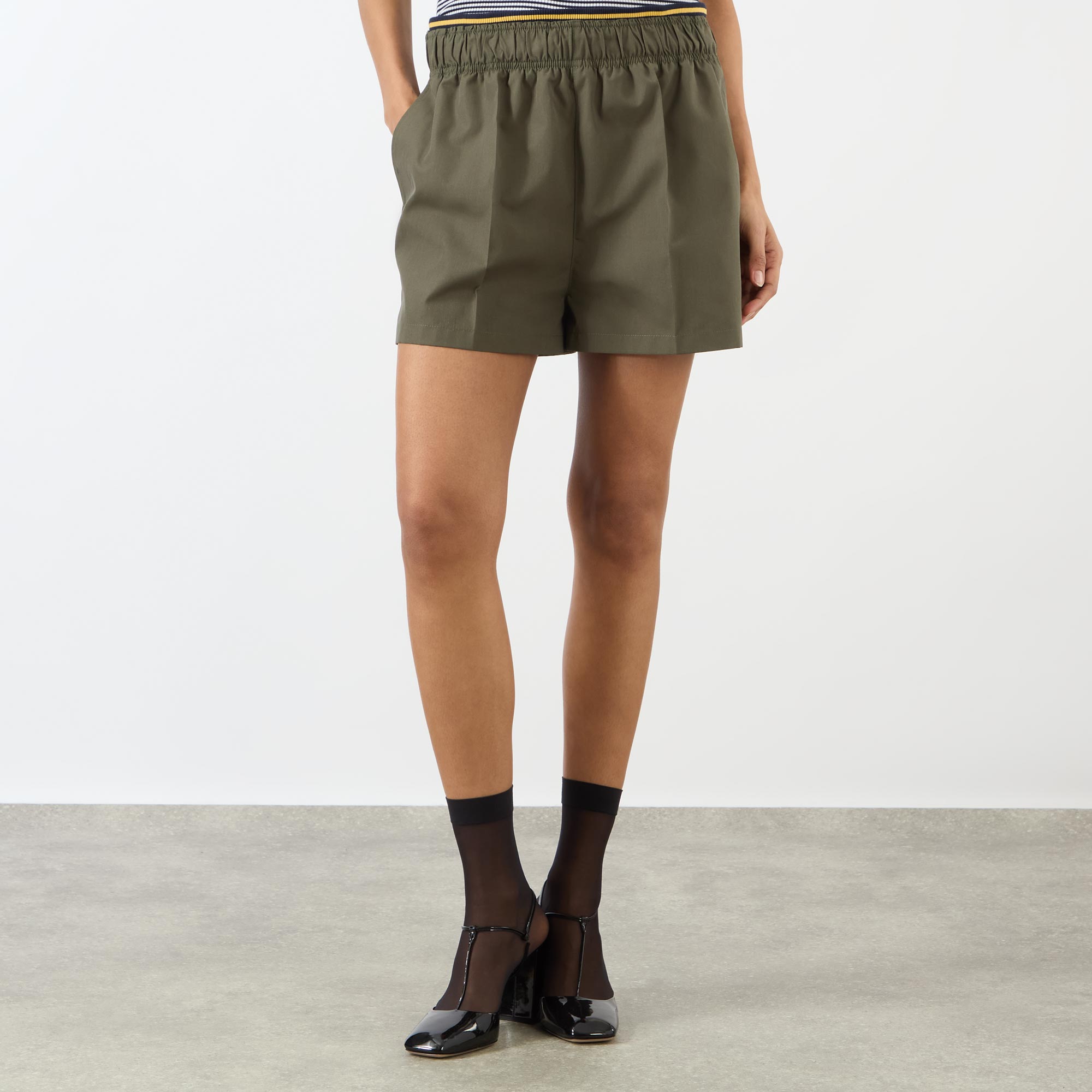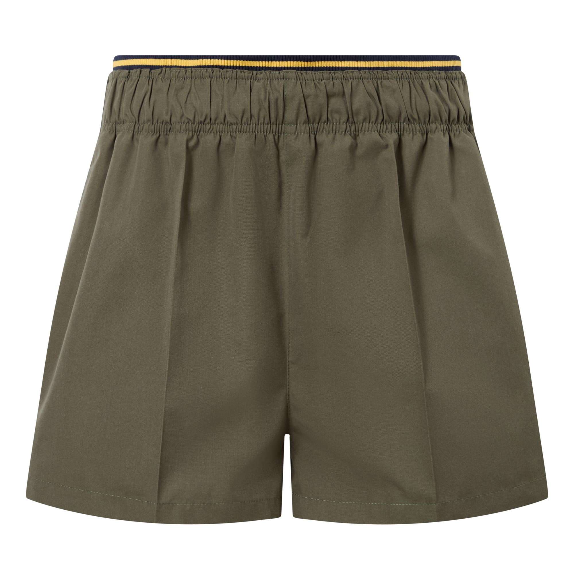 - Mid rise, straight leg, elasticated waistband, contrast stripe tipping, two side entry pockets, two rear patch pockets, clean hems, pressed creases, above-the-knee length, crisp finish