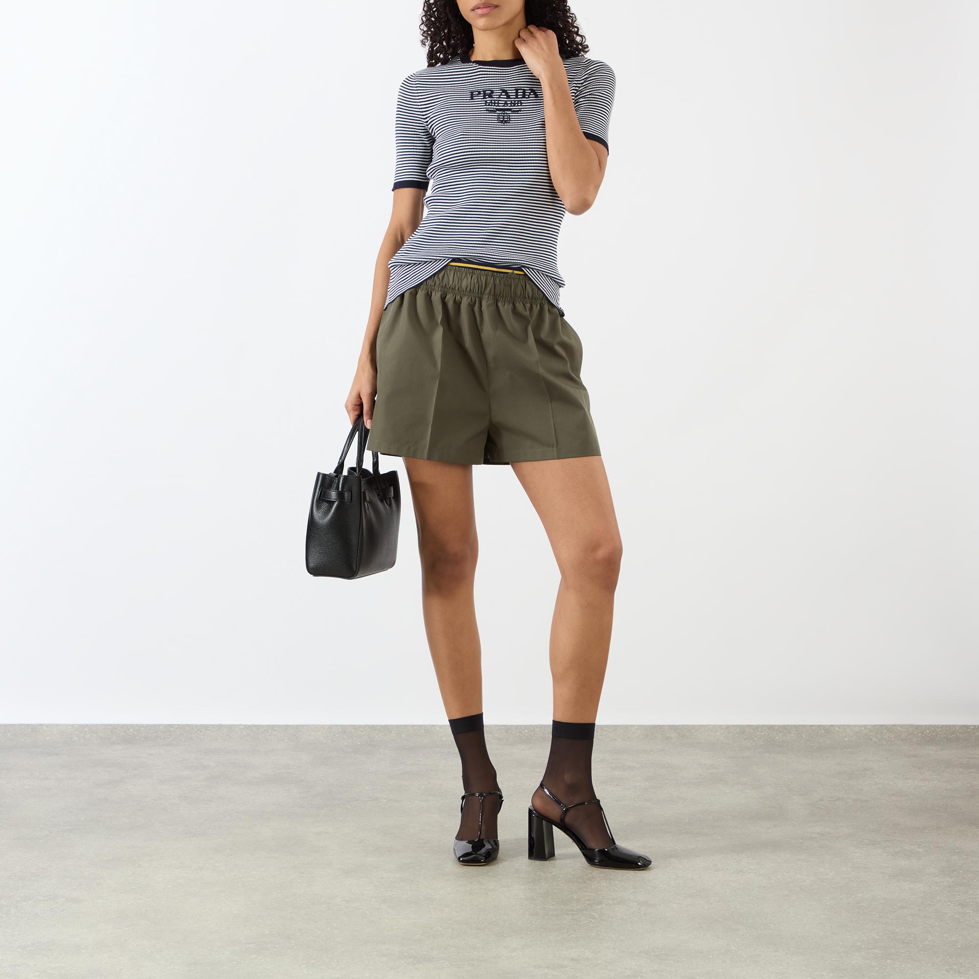 Prada's SS26 collection blends utility and elegance with clean lines and functional silhouettes — take these shorts. Sitting mid rise on the waist and cut to a straight leg silhouette, they feature a double elasticated waistband with a contrast tipped design and a selection of pockets to store your essentials, finished with pressed creases for a polished edge.
