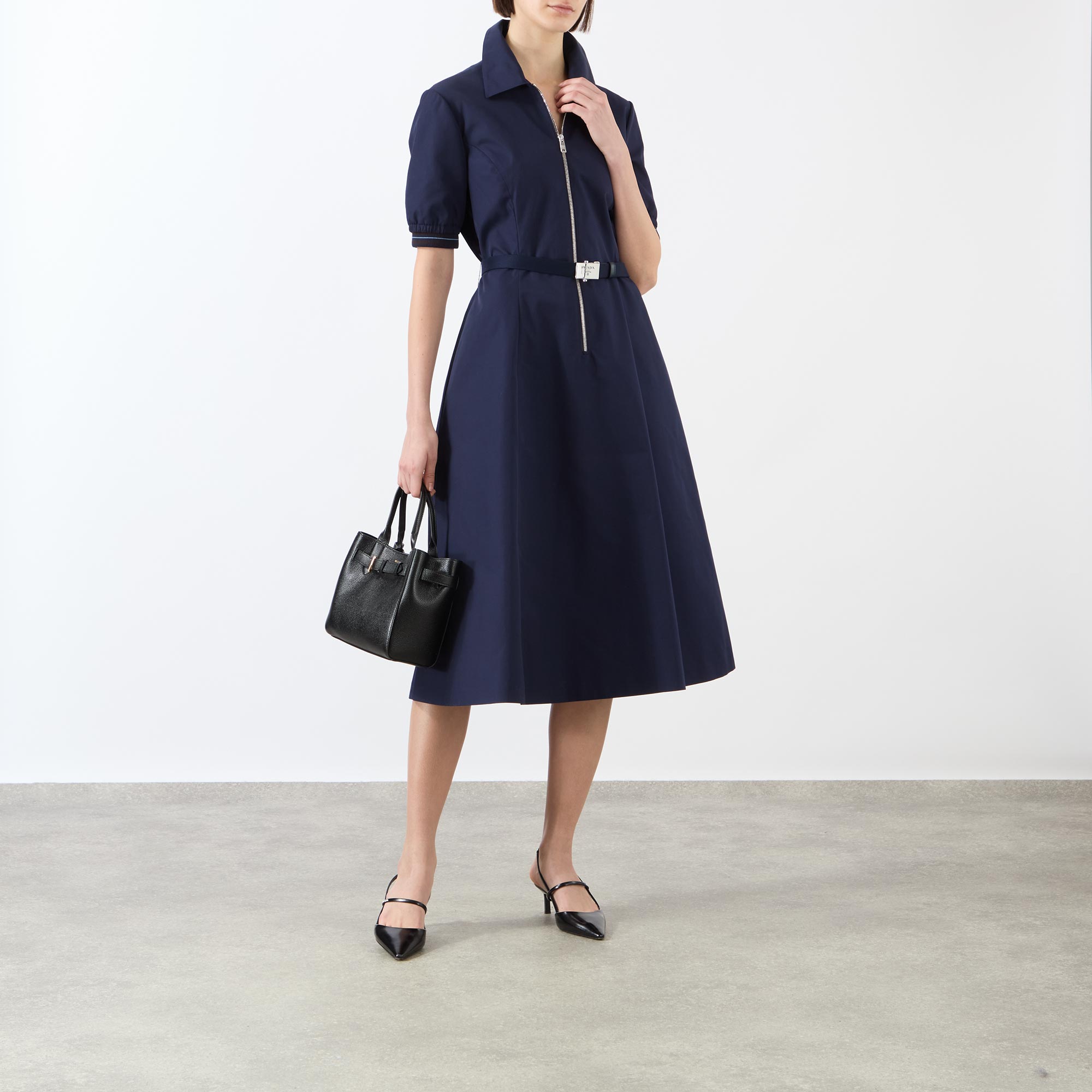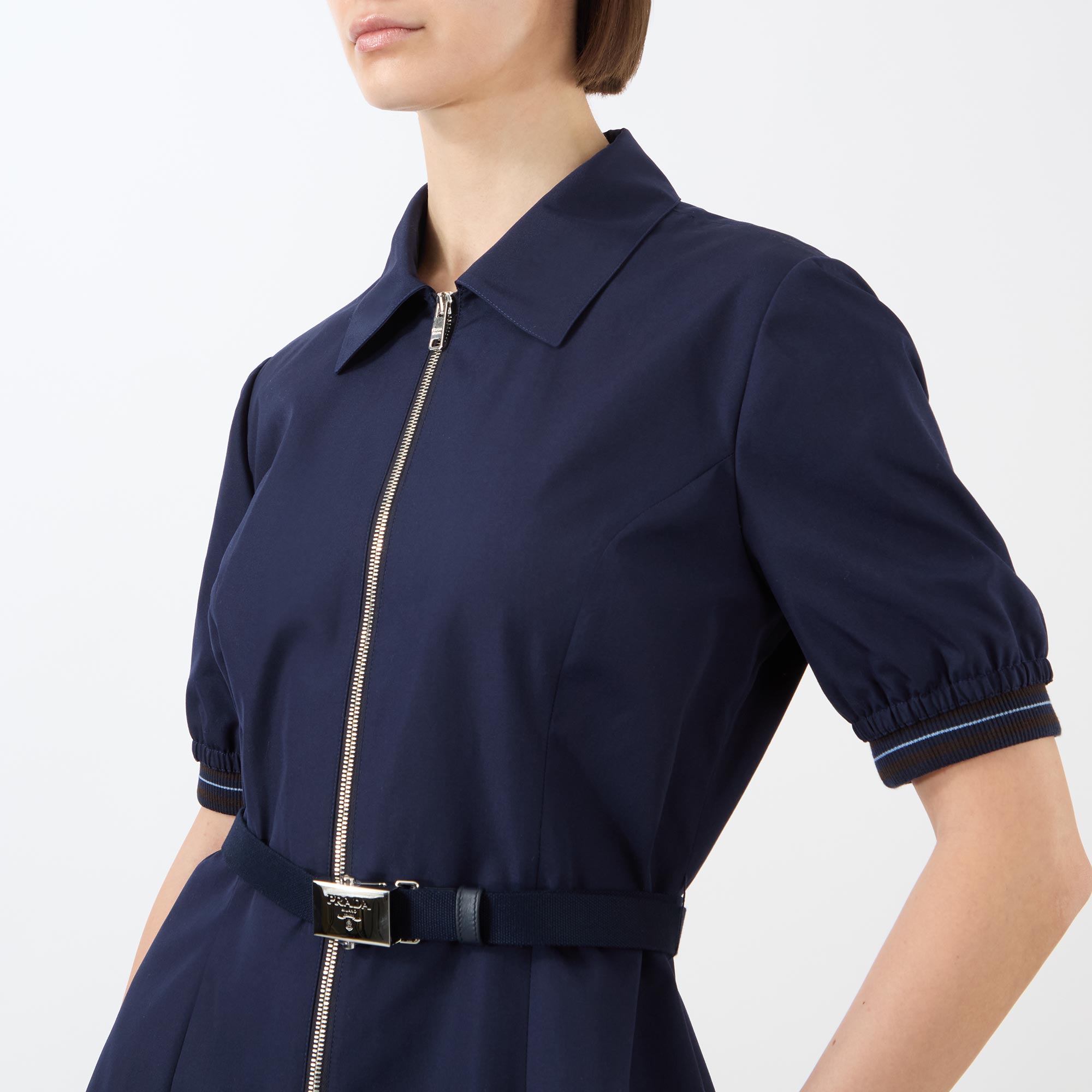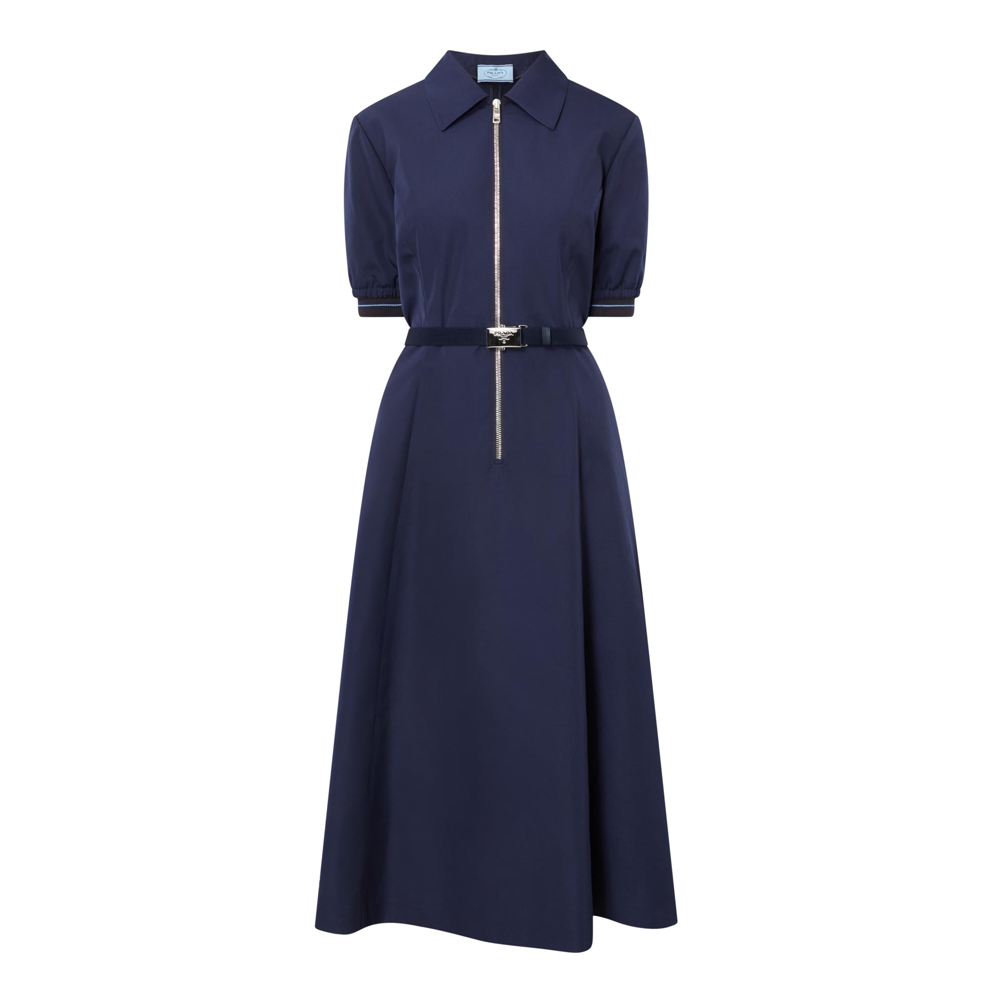Some of the standout womenswear pieces from Prada this season embrace structured yet fluid shapes, as seen in the design of this dress. Crafted from a soft cotton blend, it’s framed by a sharp point collar and short elasticated sleeves, and fitted with a zip fastening placket, alongside two practical in-seam pockets. Cinched at the waist with a belt engraved with the label’s logo on the buckle, it elegantly flares to a fluid midi-length finish.