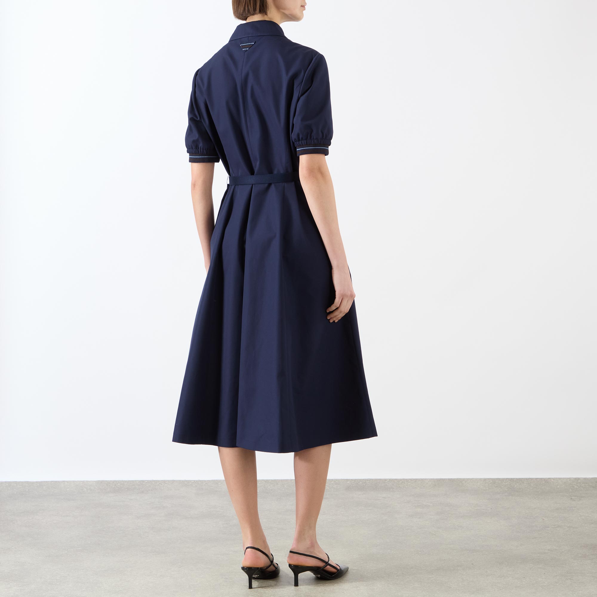 - Point collar, short sleeves, elasticated cuffs, front zip-fastening placket, two side in-seam pockets, adjustable belt with engraved buckle clasp, flared silhouette, midi length, smooth fabric