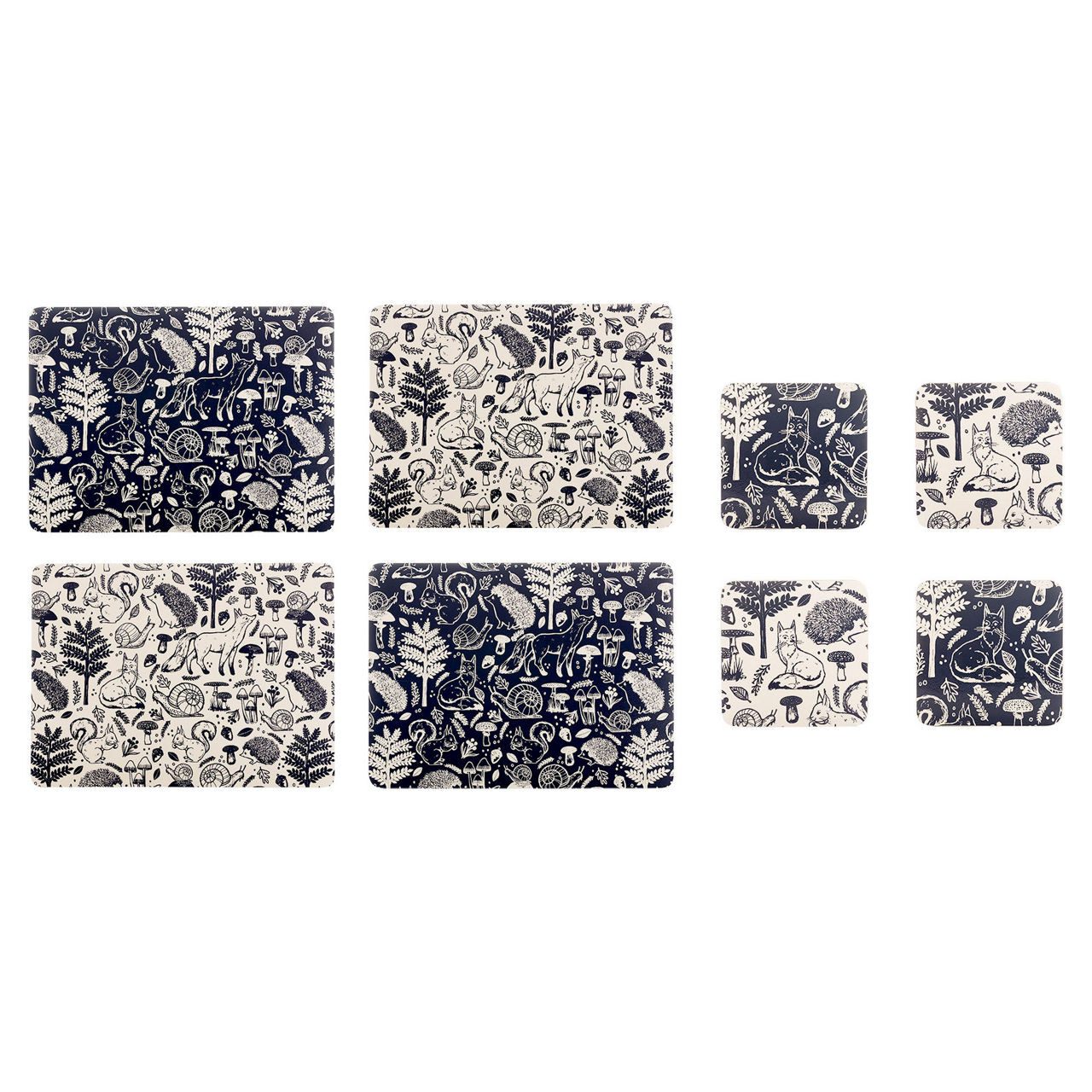 The Price & Kensington Woodland set of 8 placemats & coasters features novelty woodland illustrations in a hand drawn style inspired by nature. The set contains 2 placemats & coasters in a midnight shade along with 2 placemats & coasters in a fresh cream shade, perfectly designed to complement each other. Complete with an easy clean surface and cork back which is sustainably sourced, these placemats are the ideal solution to protect table tops and have a heat resistant laminated surface.