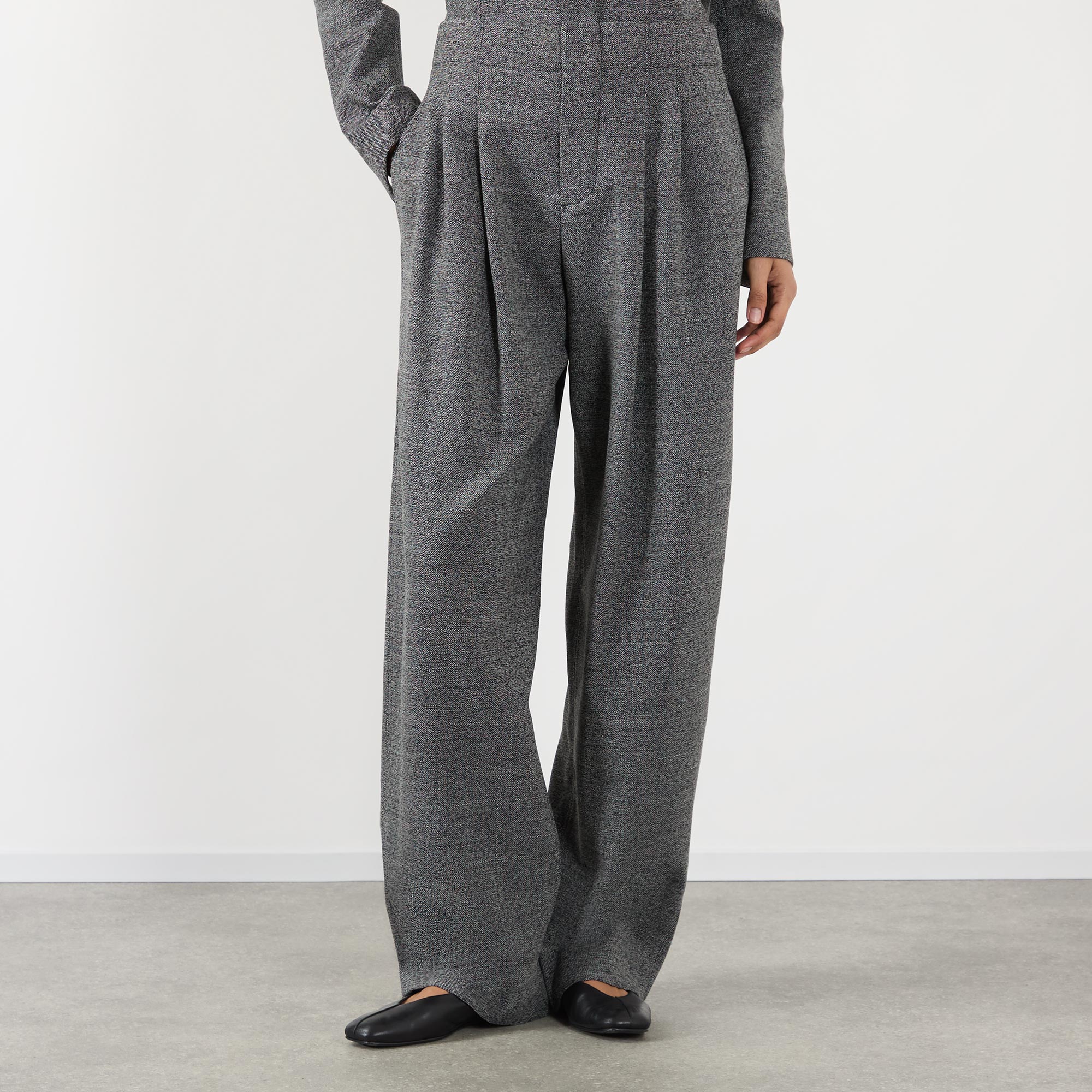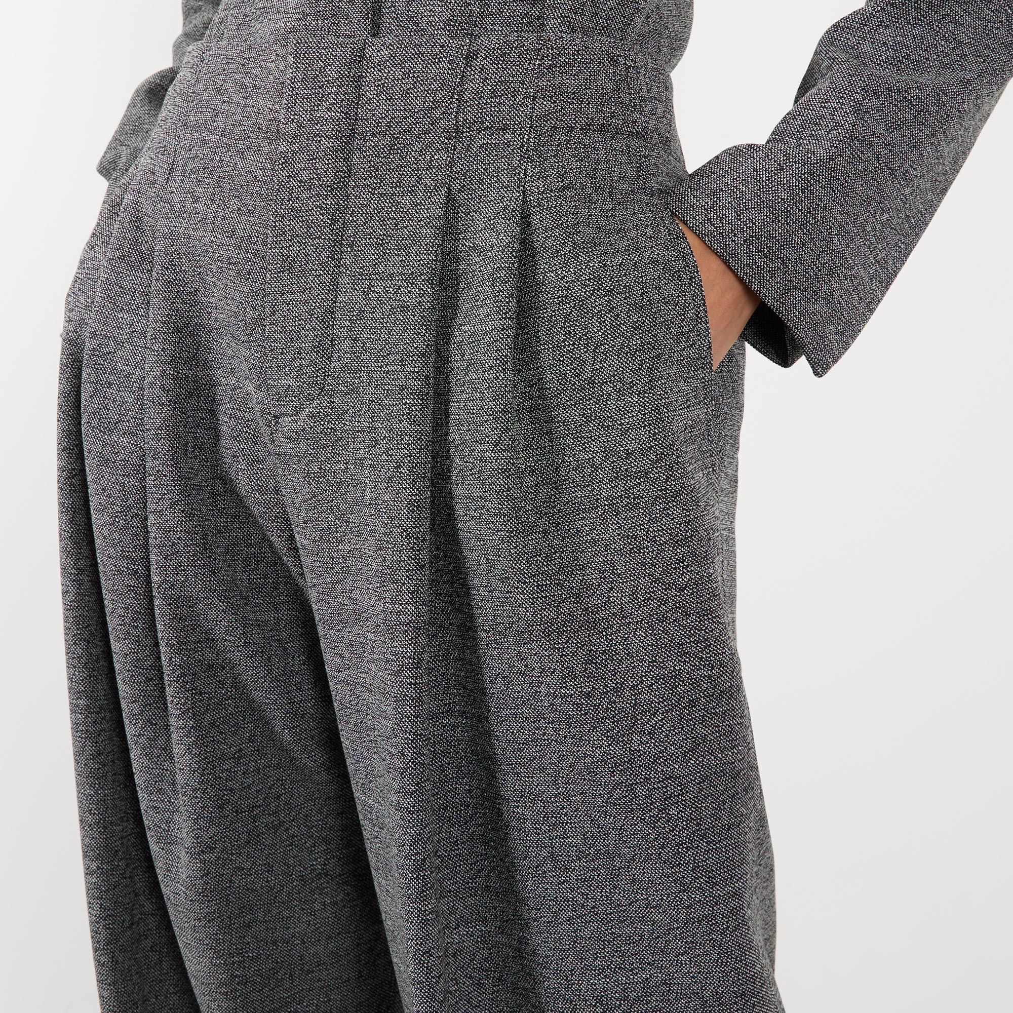 - Pleat detailing, wide-leg silhouette, front side pockets, welt pockets