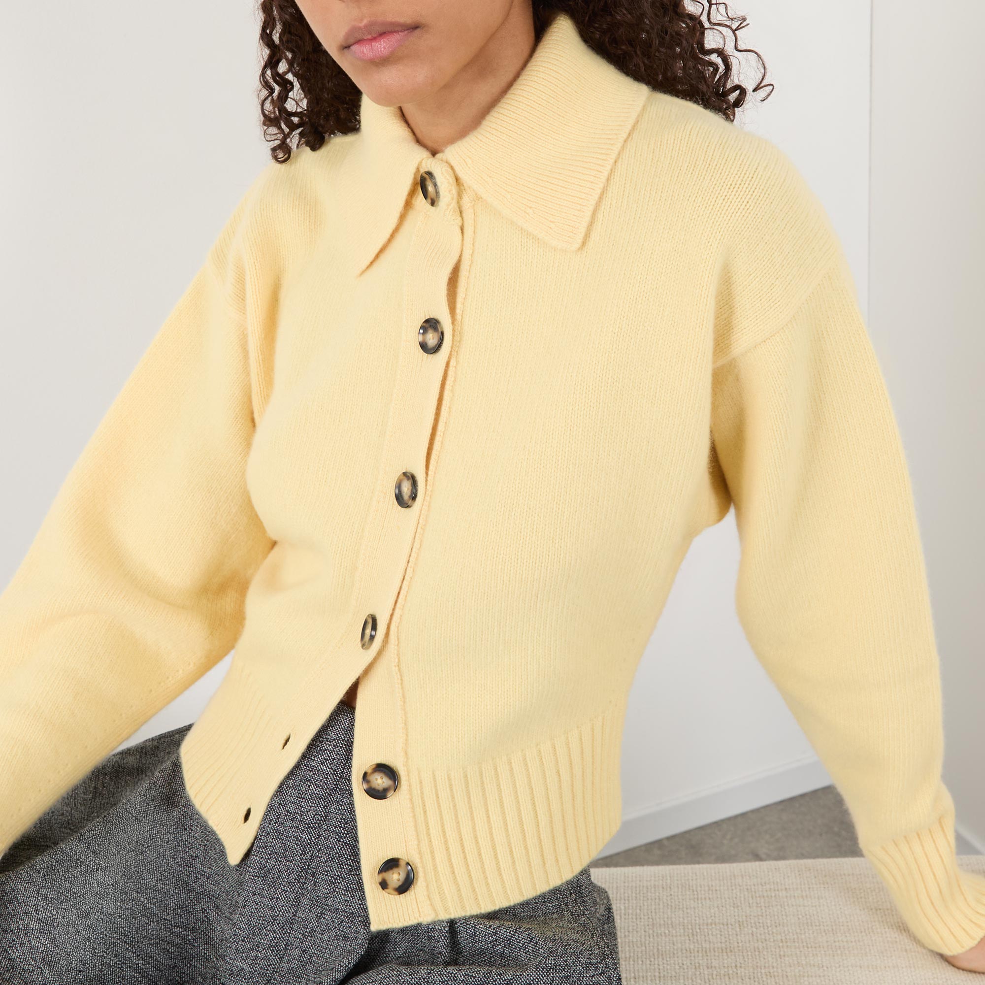 • Point collar, long sleeves, front button fastenings, straight hem, cashmere construction, ribbed trims