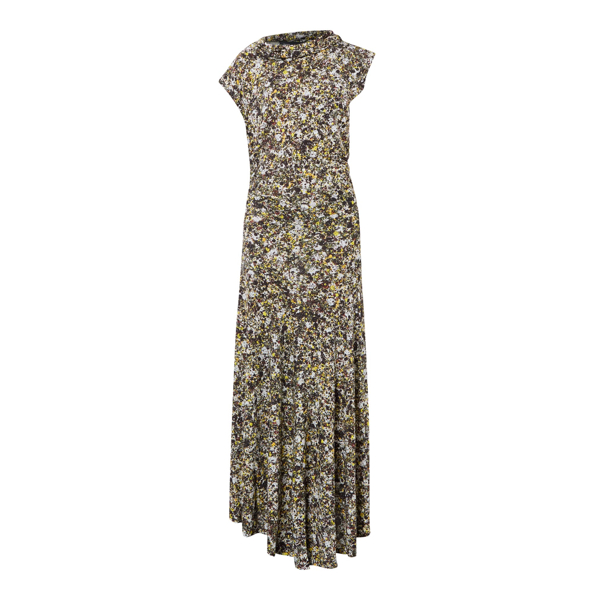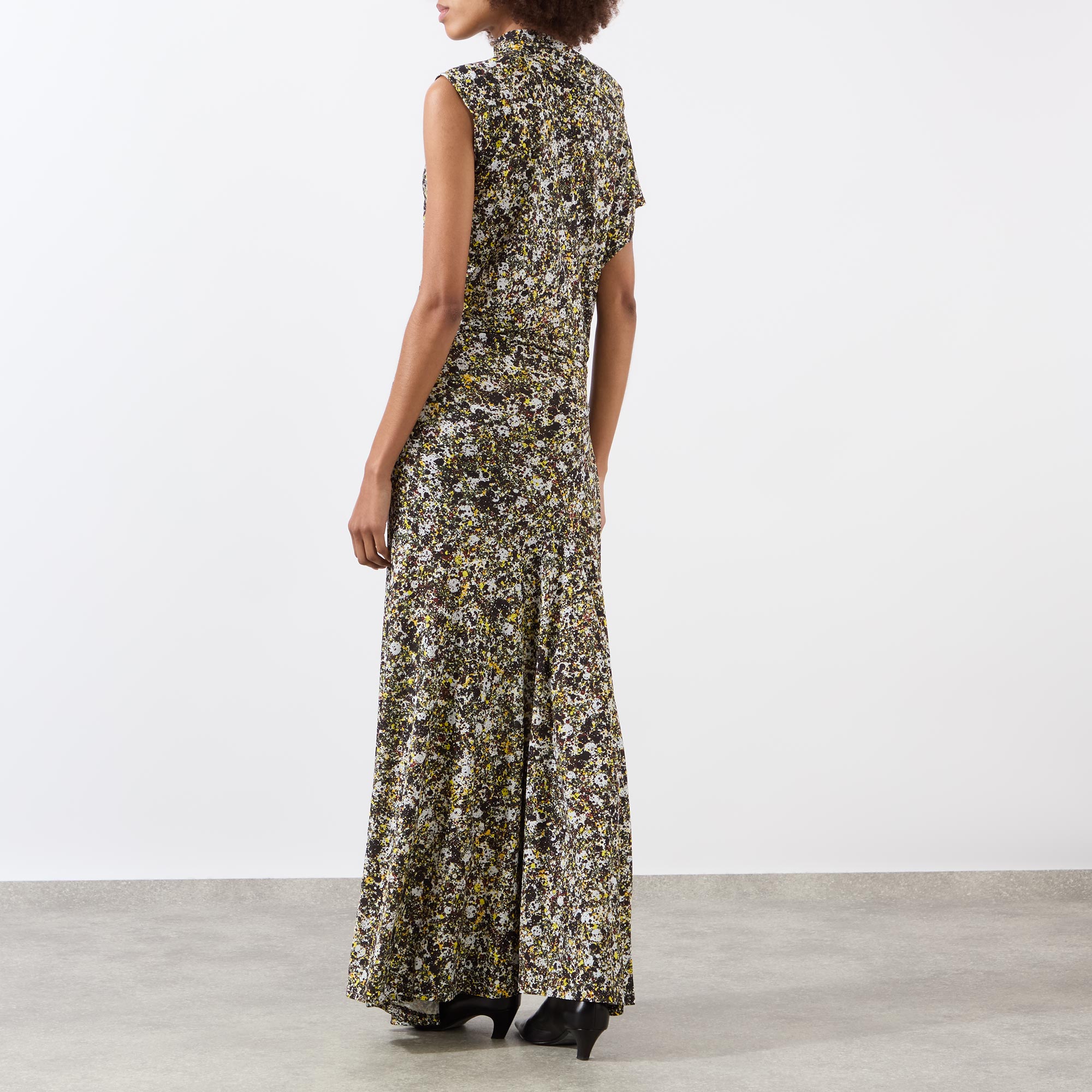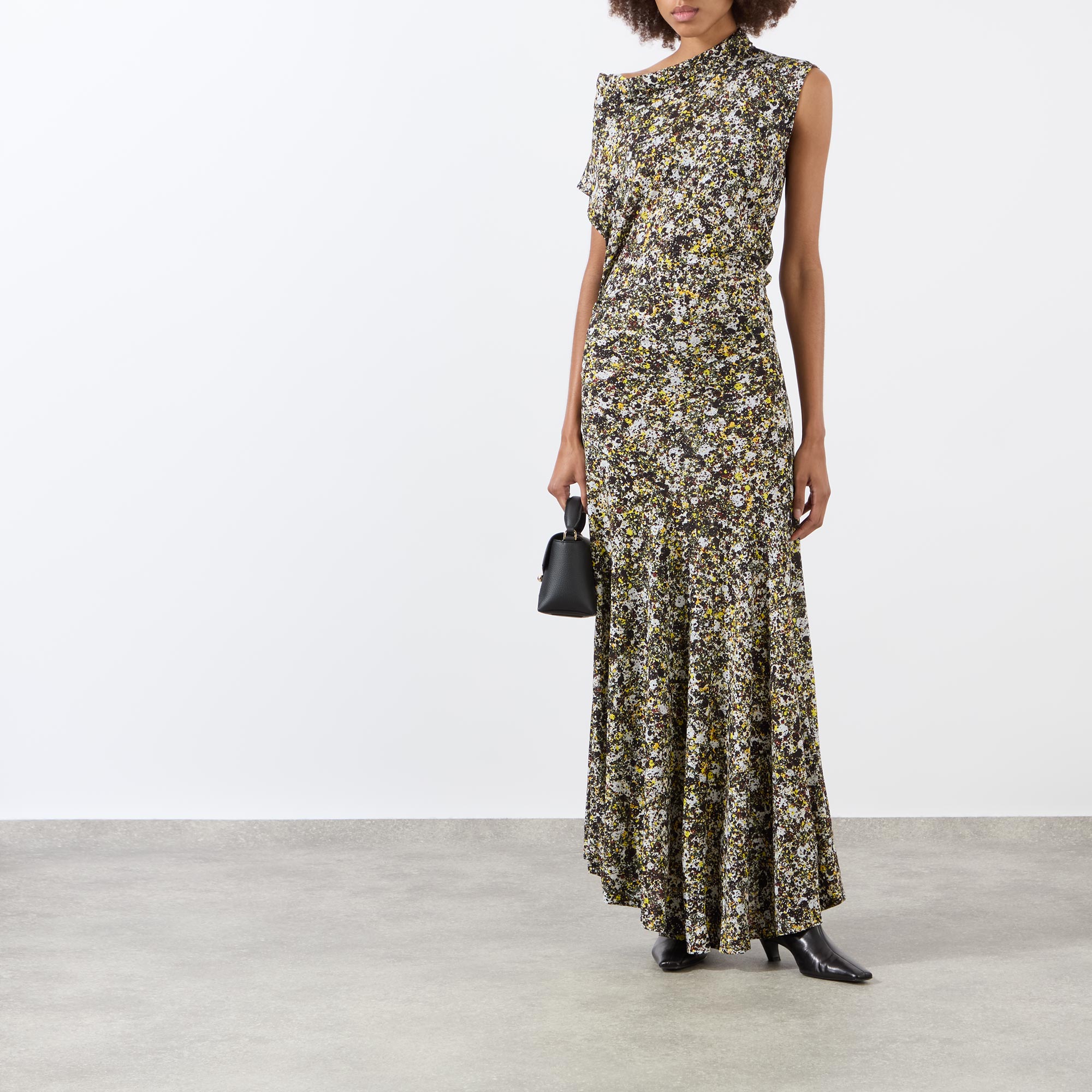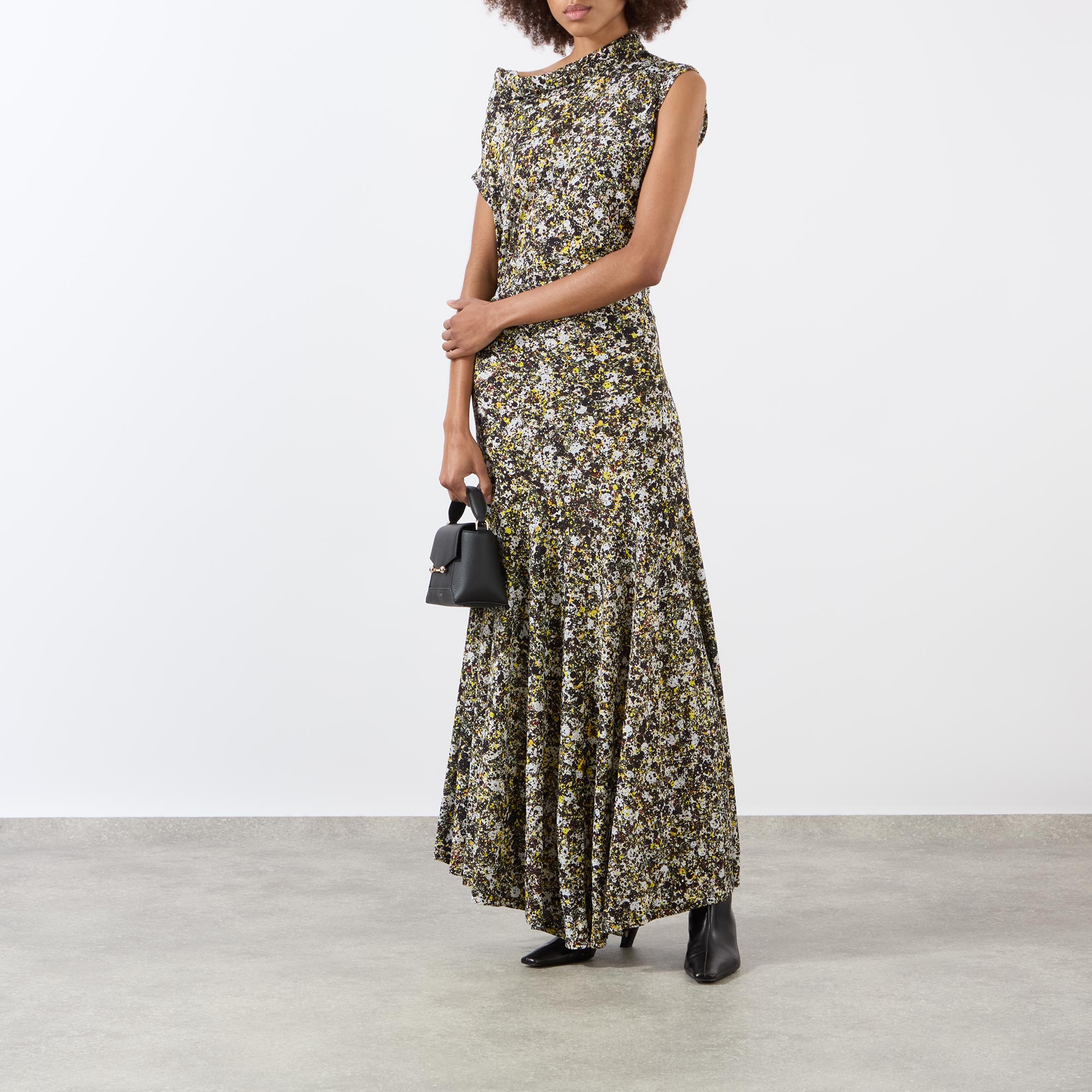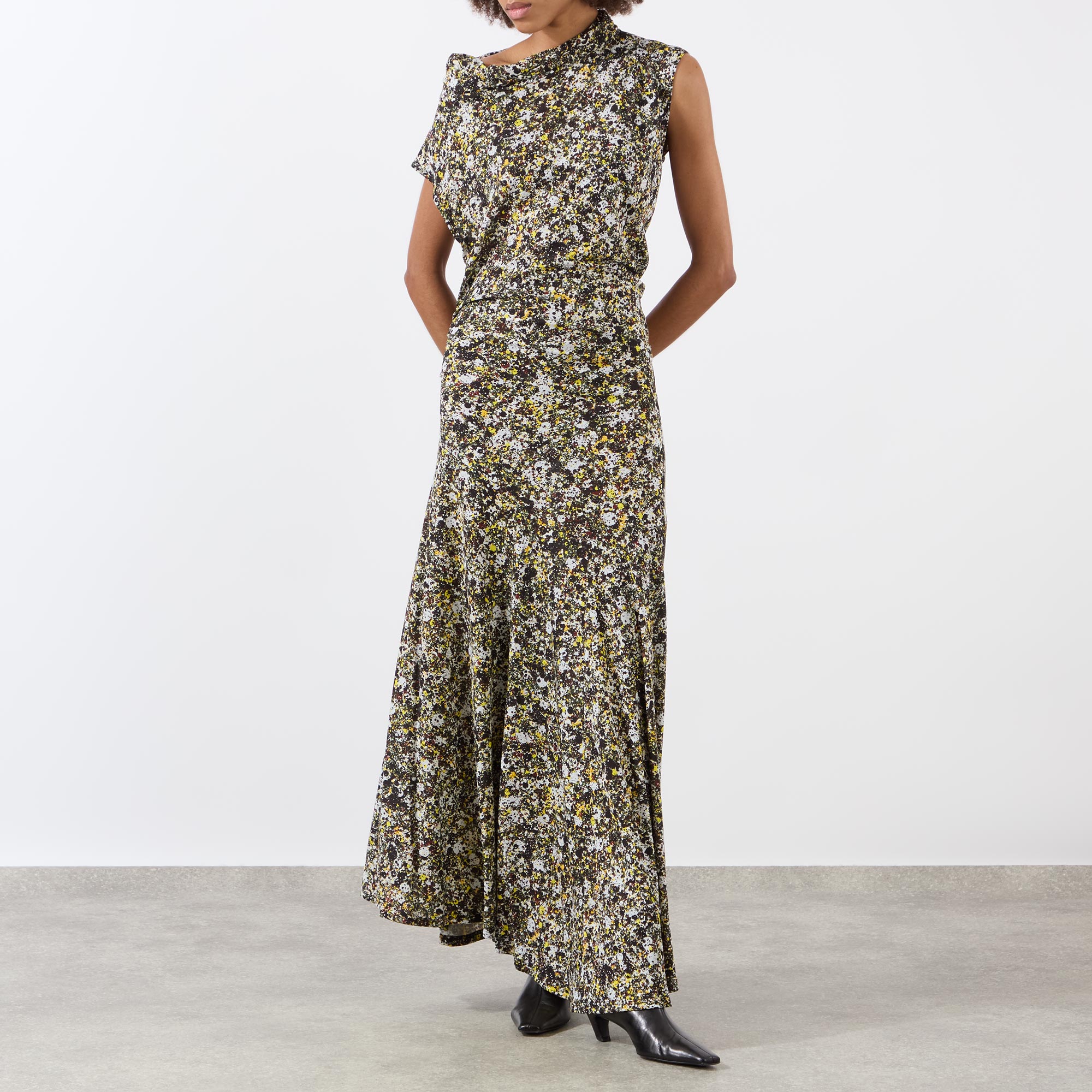 Proenza Schouler unveils its SS26 collection with a deconstructed, deliberately "undone" aesthetic showcasing asymmetric silhouettes and statement prints. The Tamara dress is cut from jersey fabric, detailed with a fine abstract print and the slouchy cowl neckline and maxi skirt offer a relaxed appeal. This versatile piece can be dressed up with statement boots or paired with sandals for daytime occasions.