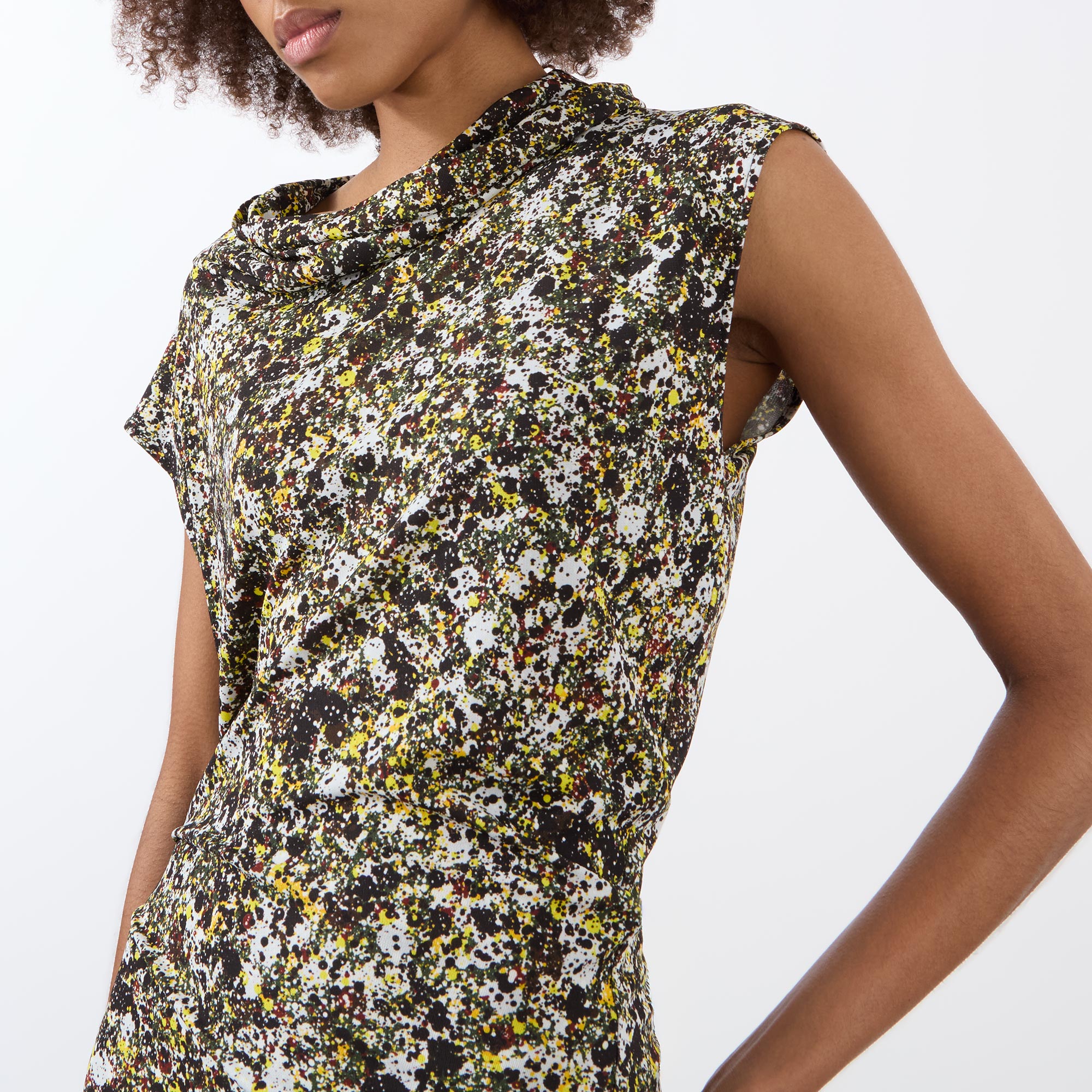 - Graphic print, jersey fabric, draped cowl neckline, asymmetric hem