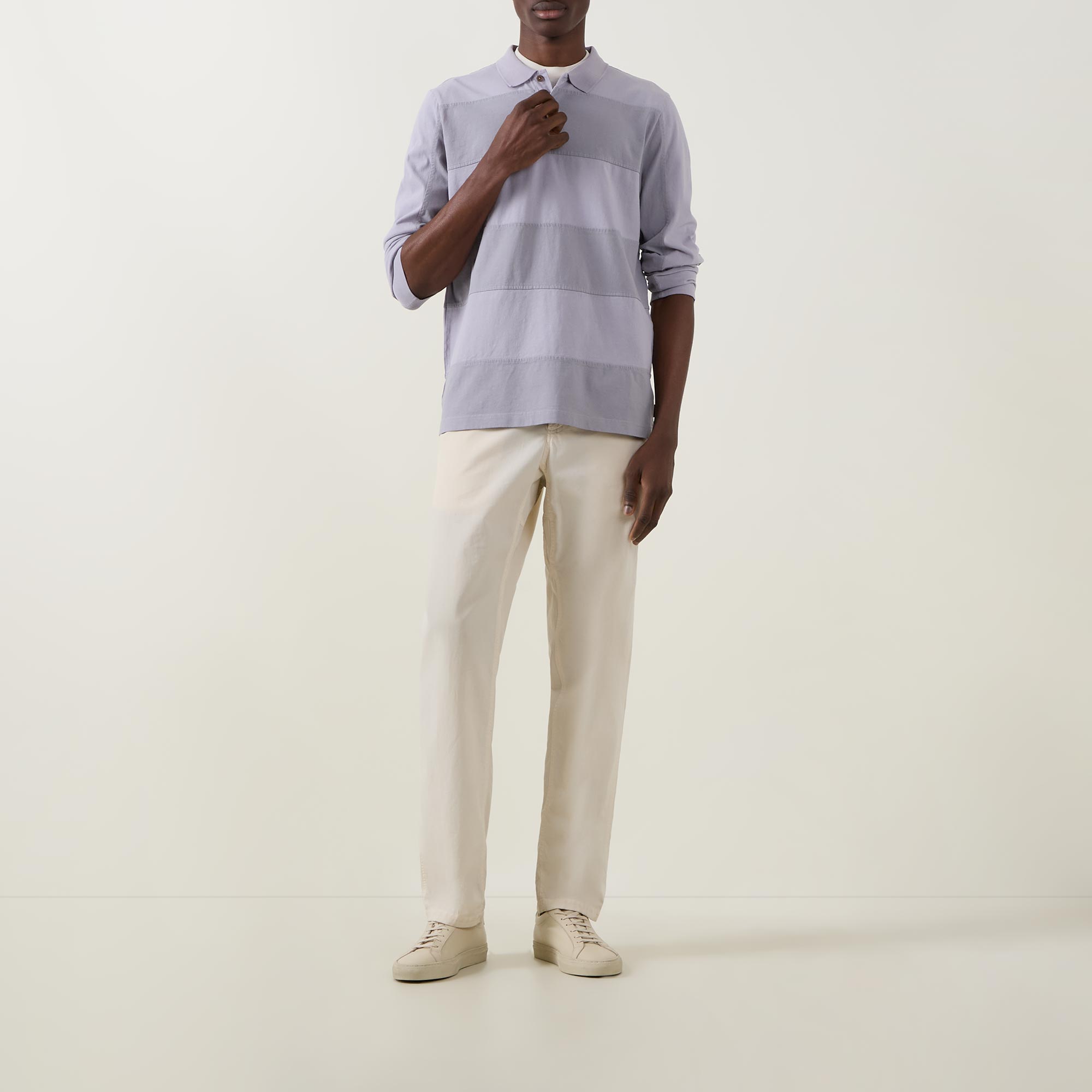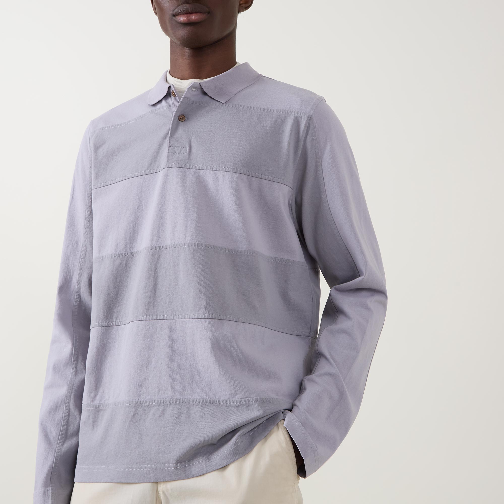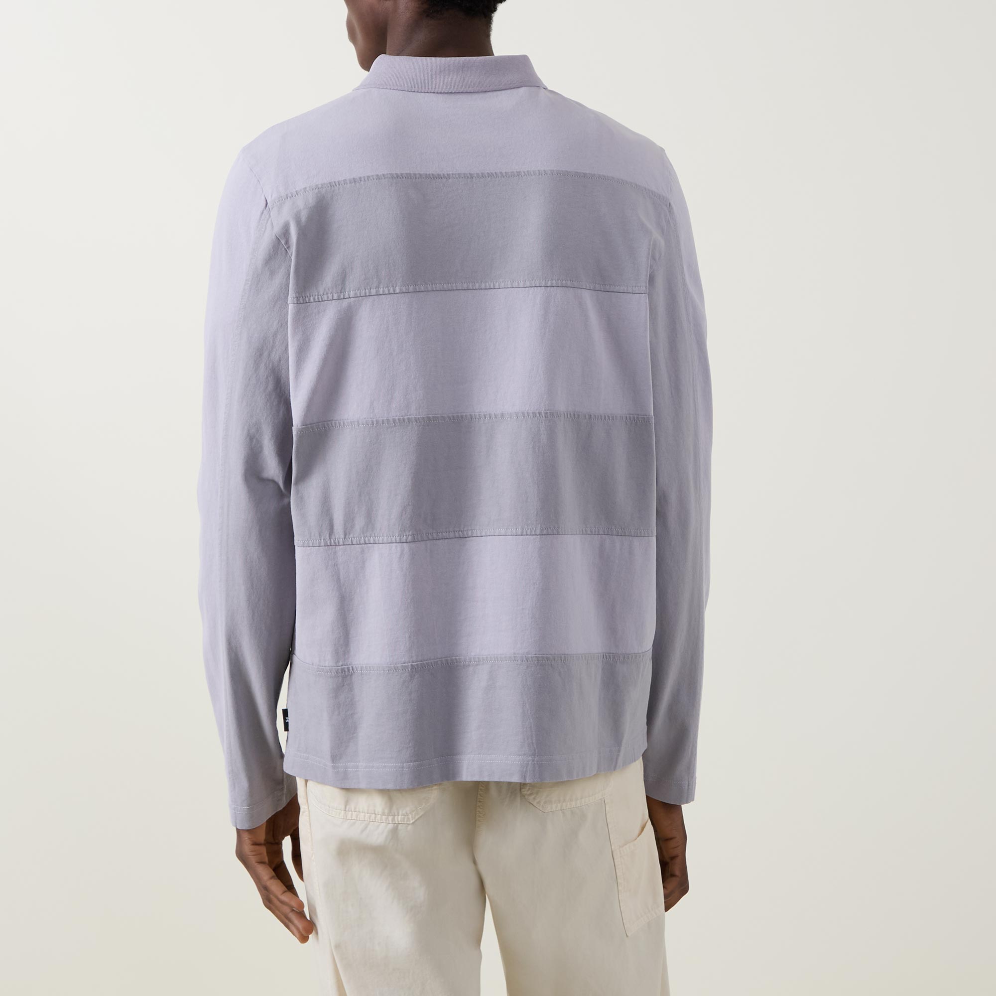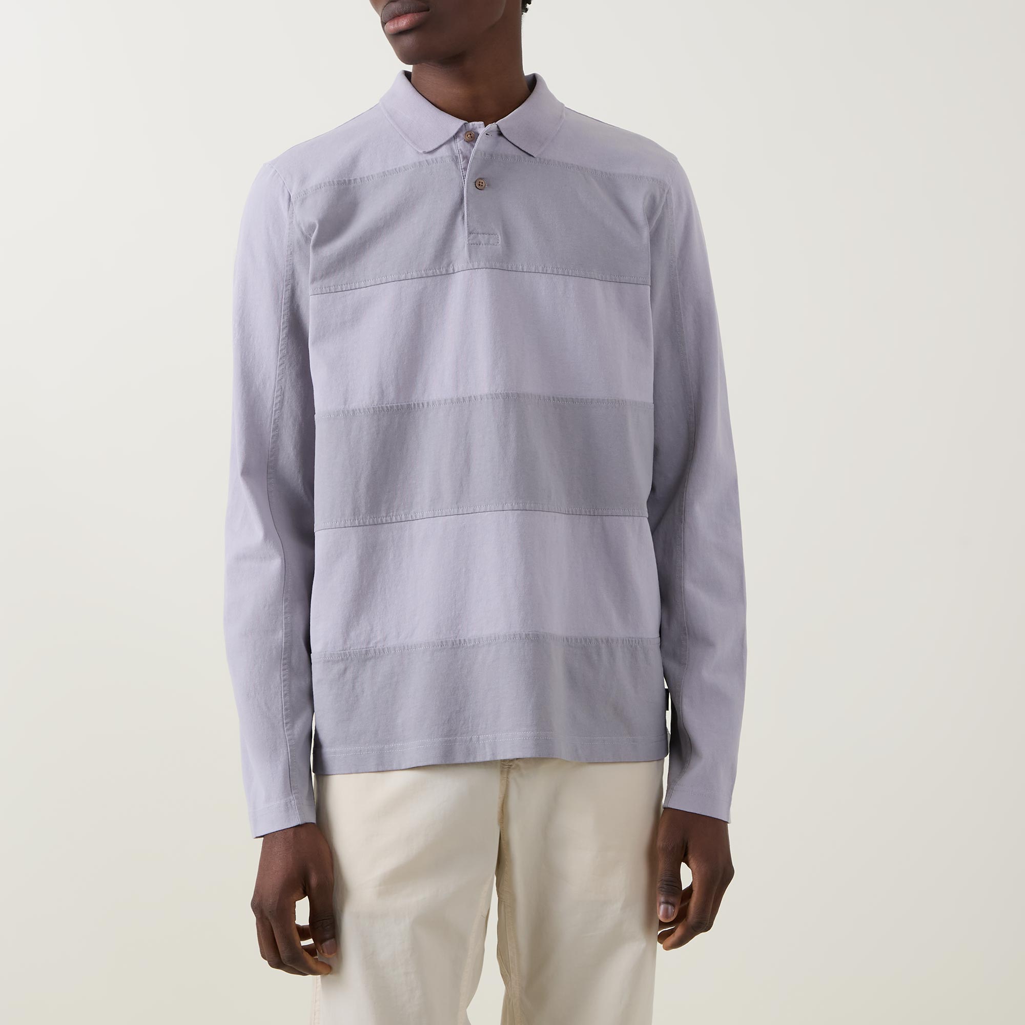 - Polo collar, two-button placket, long sleeves, straight hem, tonal block striped design, logo tag, tonal stitching, piece-dyed finish