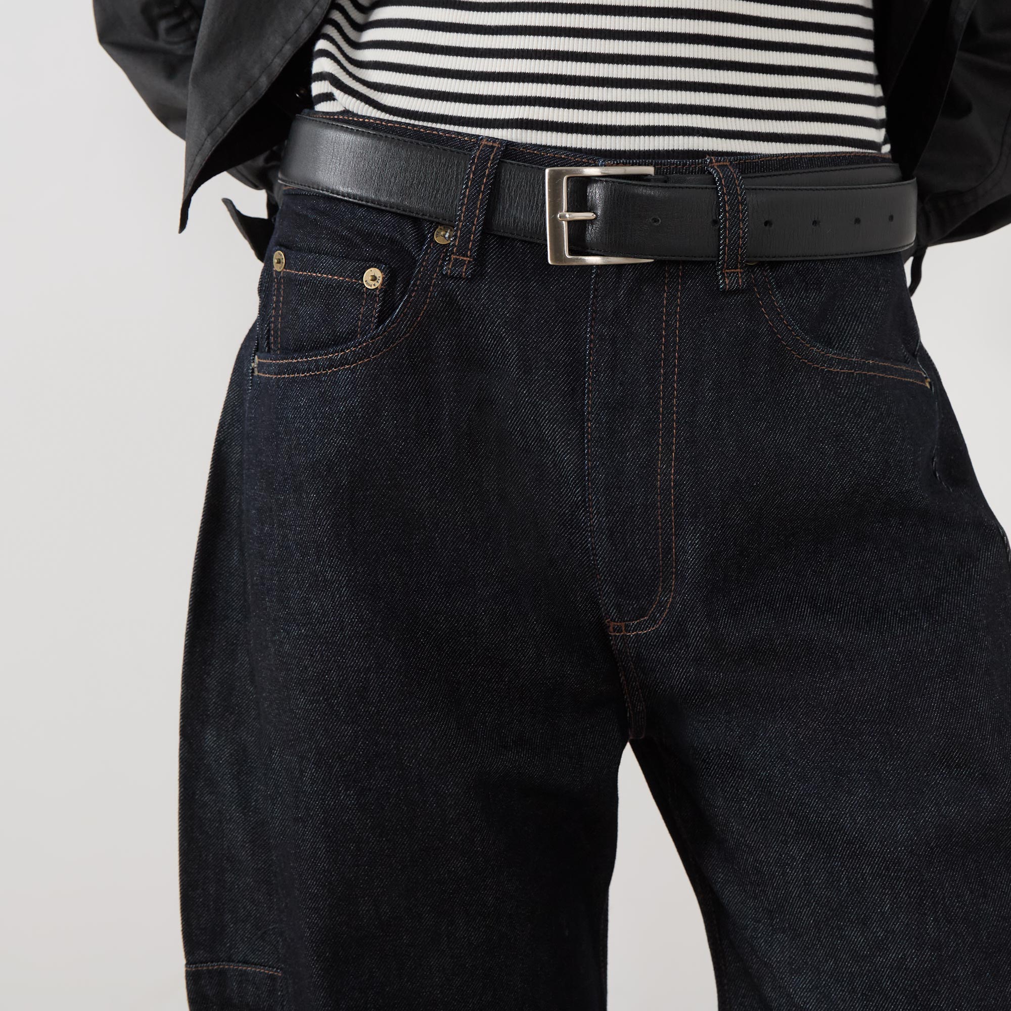 - Zip-fly and button fastening, belt loops, five-pocket design, contrast stitching, rear logo patch, dart detailing, mid-rise, barrel-cut leg, smooth denim finish