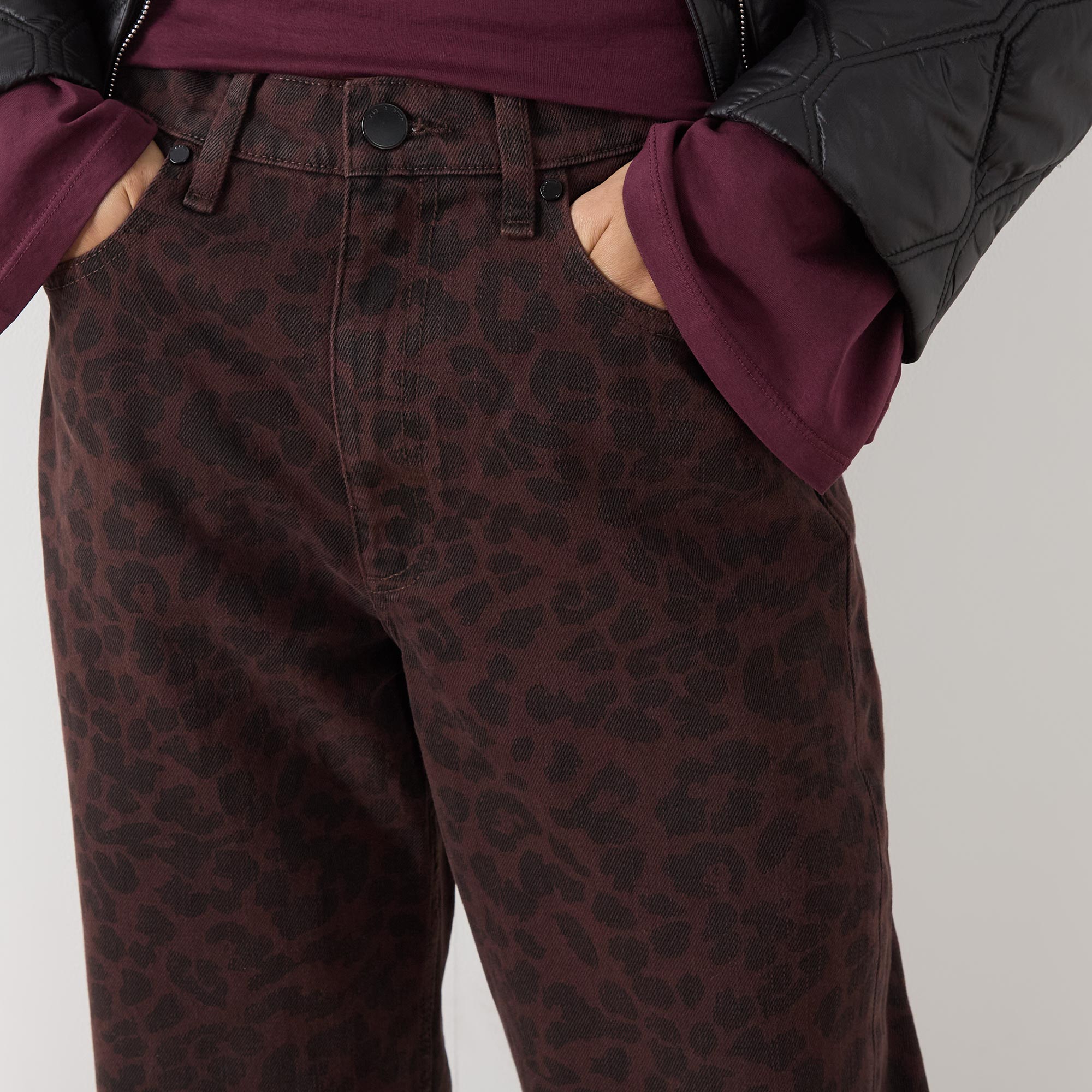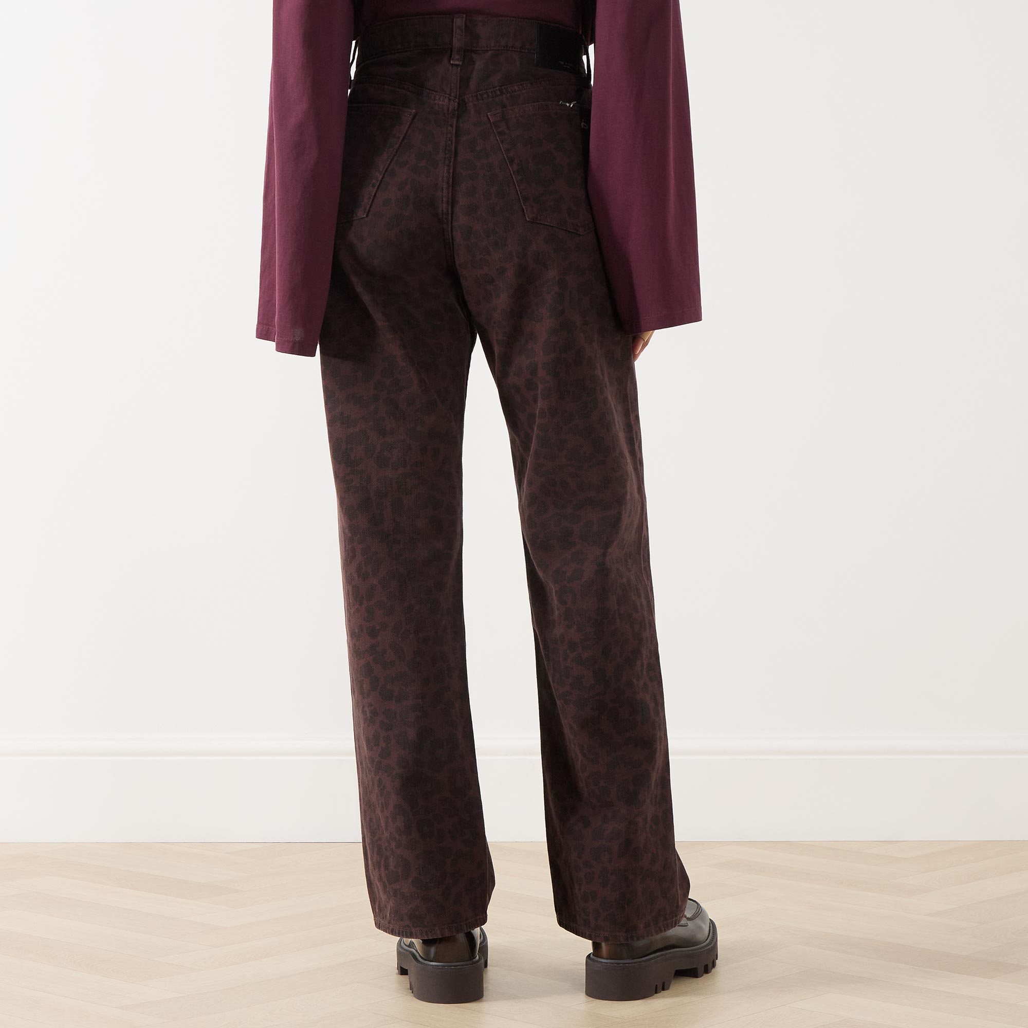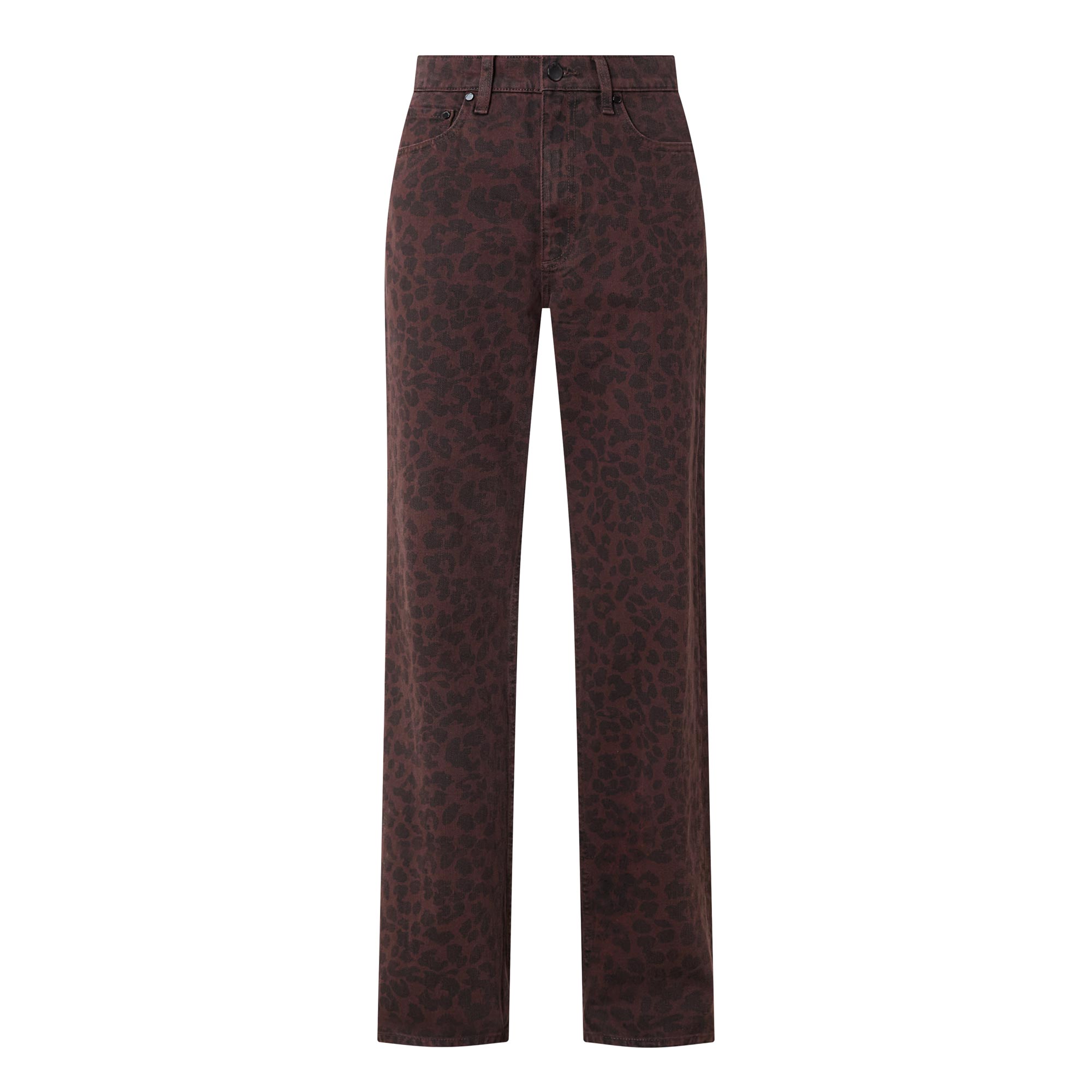 - Zip-fly and button fastening, belt loops, five-pocket design, tonal stitching, rear logo patch, leopard pattern, high-rise, straight-cut leg, smooth denim finish