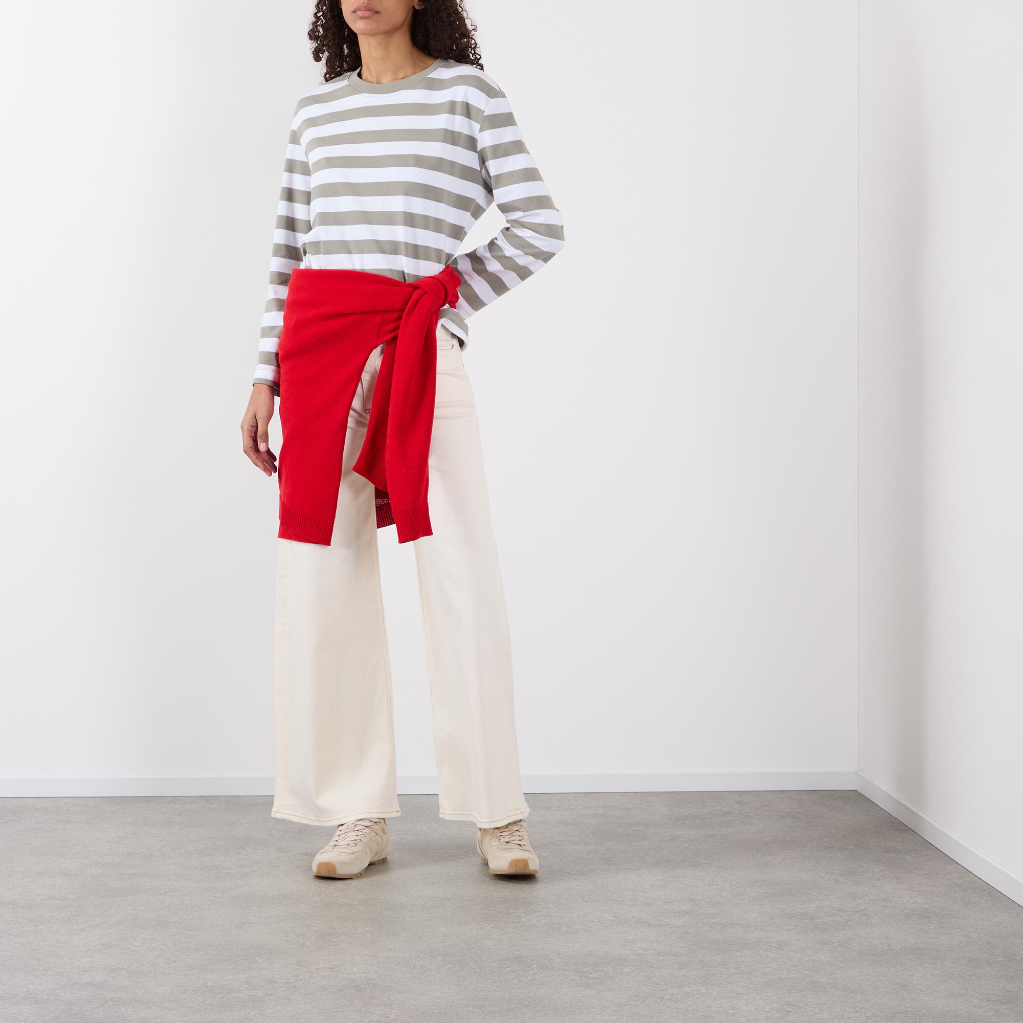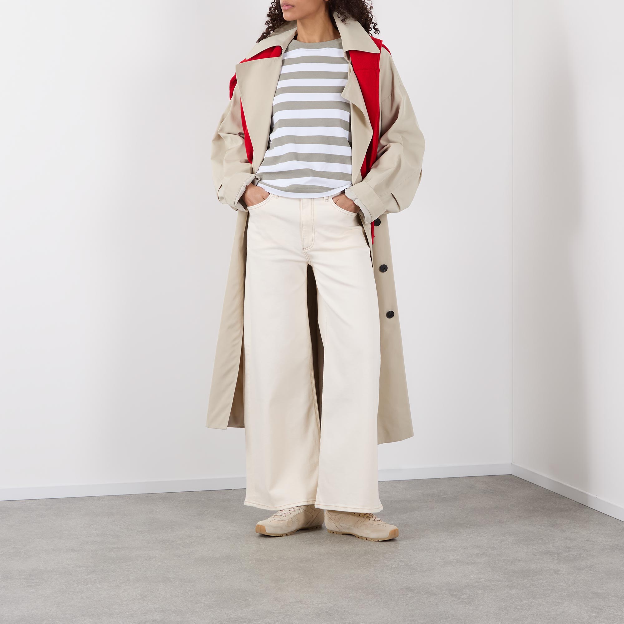 - Button and fly zip fastening, five-pocket style, belt loops, tonal stitching, logo badge, wide-cut legs
