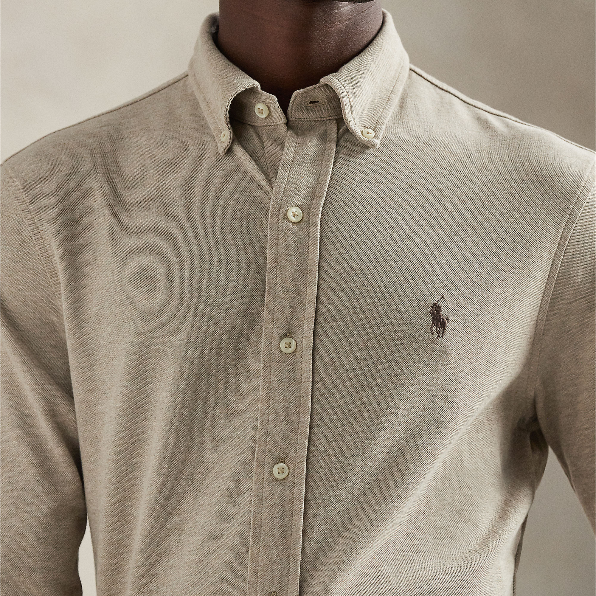 - Button-down point collar, buttoned placket, long sleeves, buttoned barrel cuffs, split back yoke, box pleat, signature embroidered Pony logo detail, cotton mesh fabric