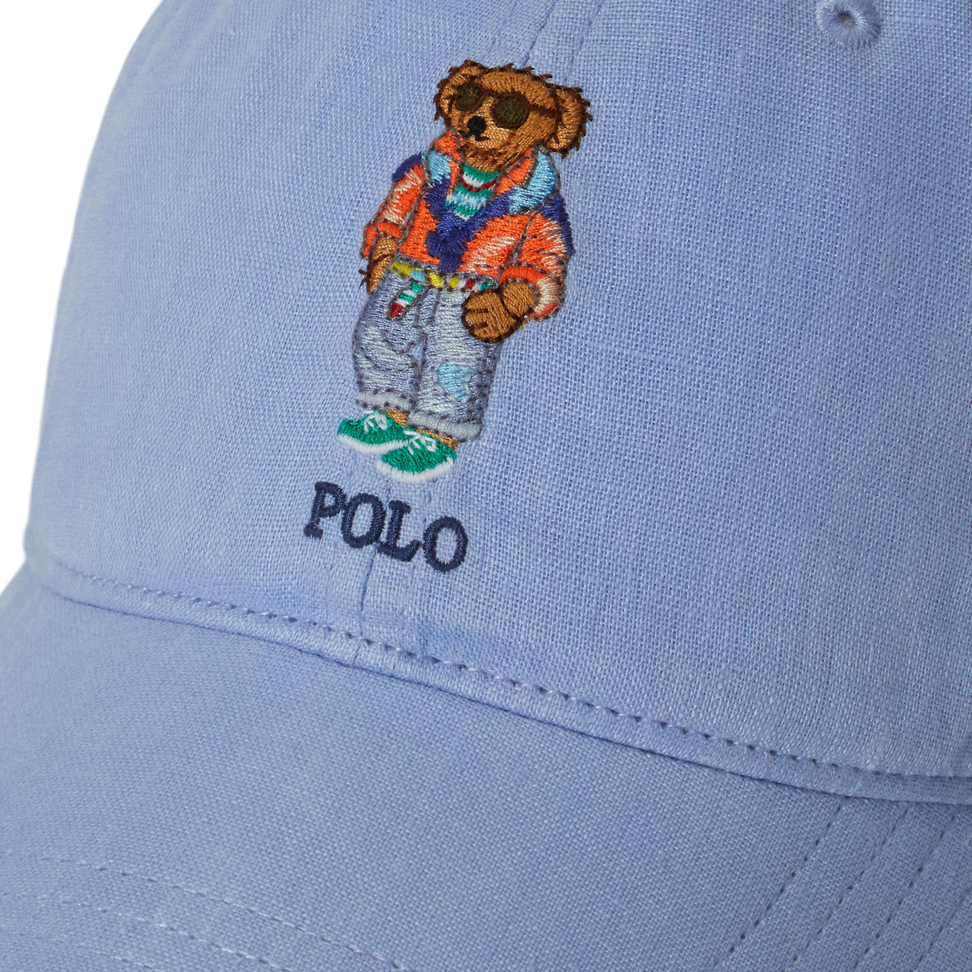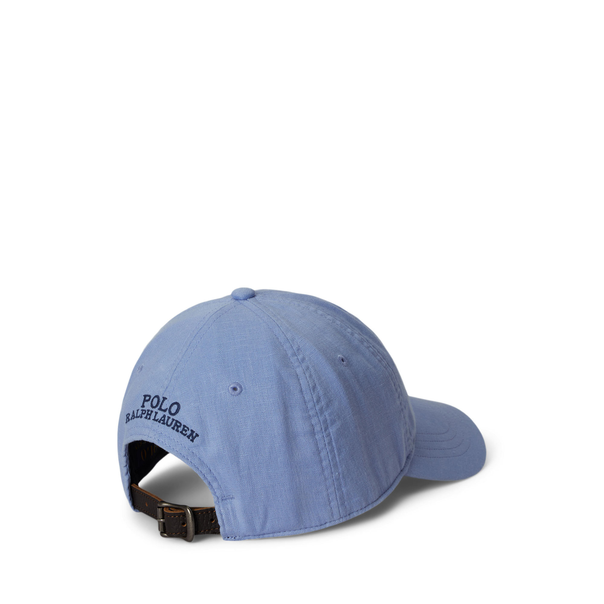 - Fine linen construction, leather back strap, Polo Bear logo detail, seamed bill, contrasting twill underbill, six-panel construction, ventilating embroidered eyelets, twill sweatband, lined with cotton, logo embroidery