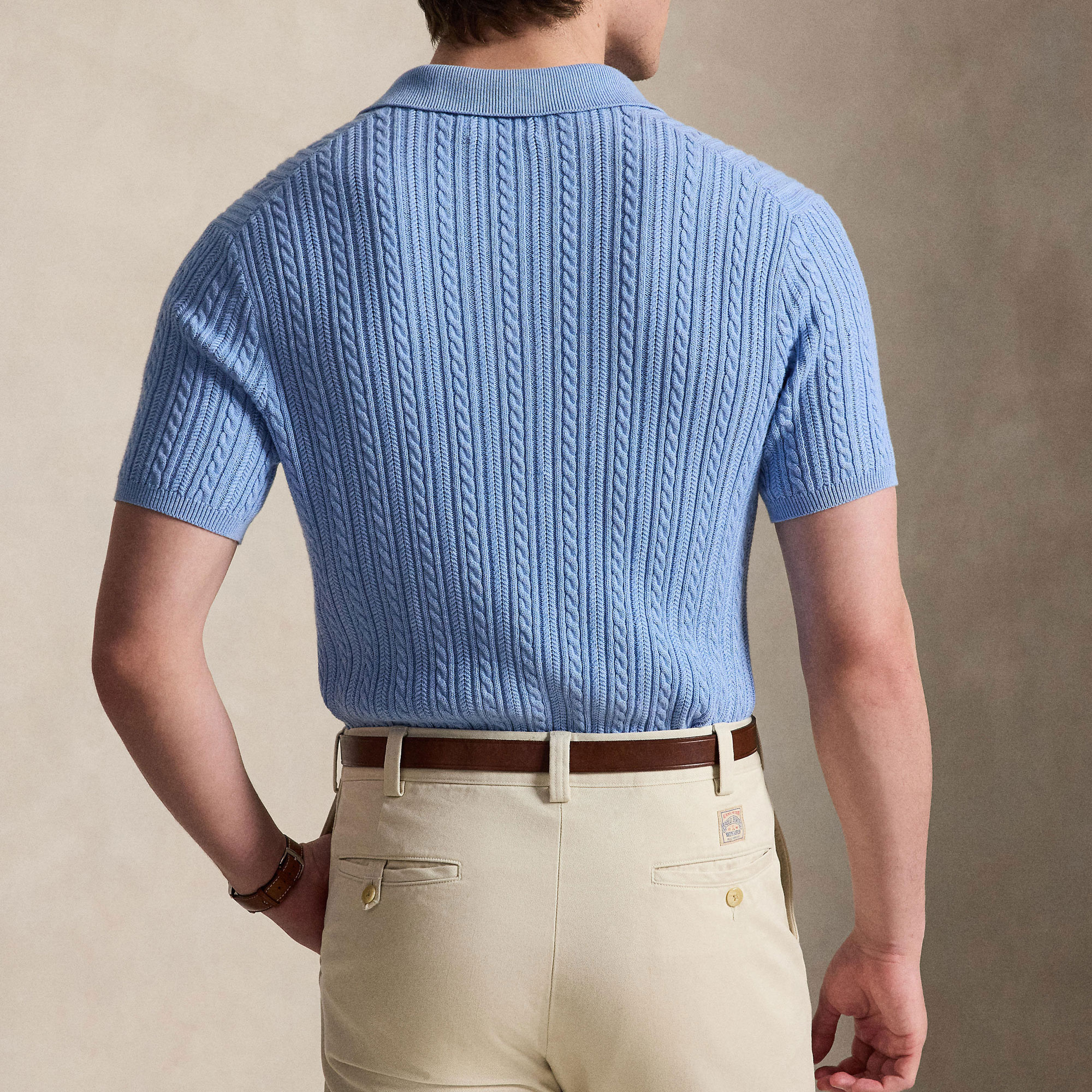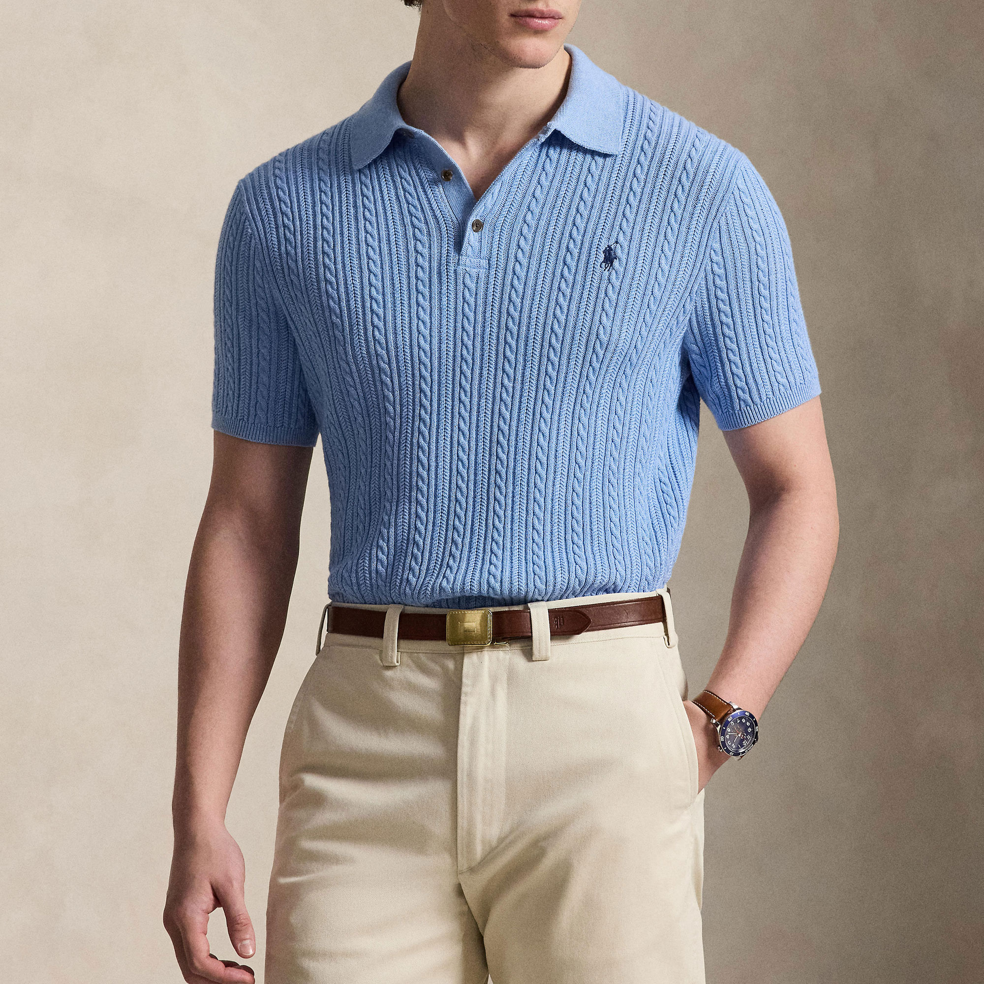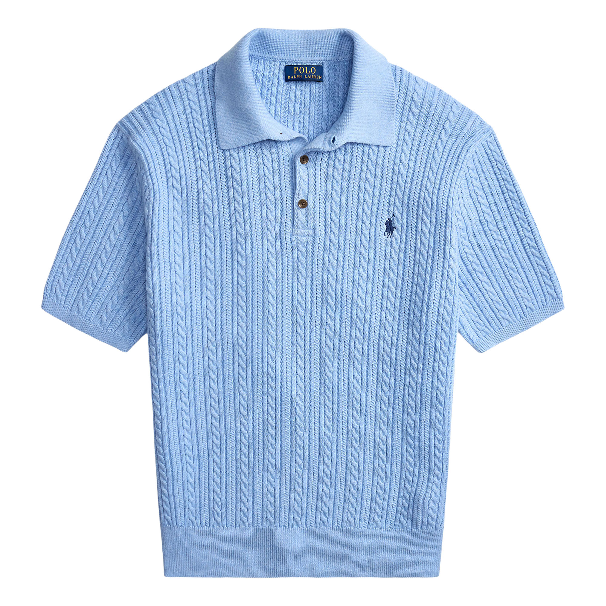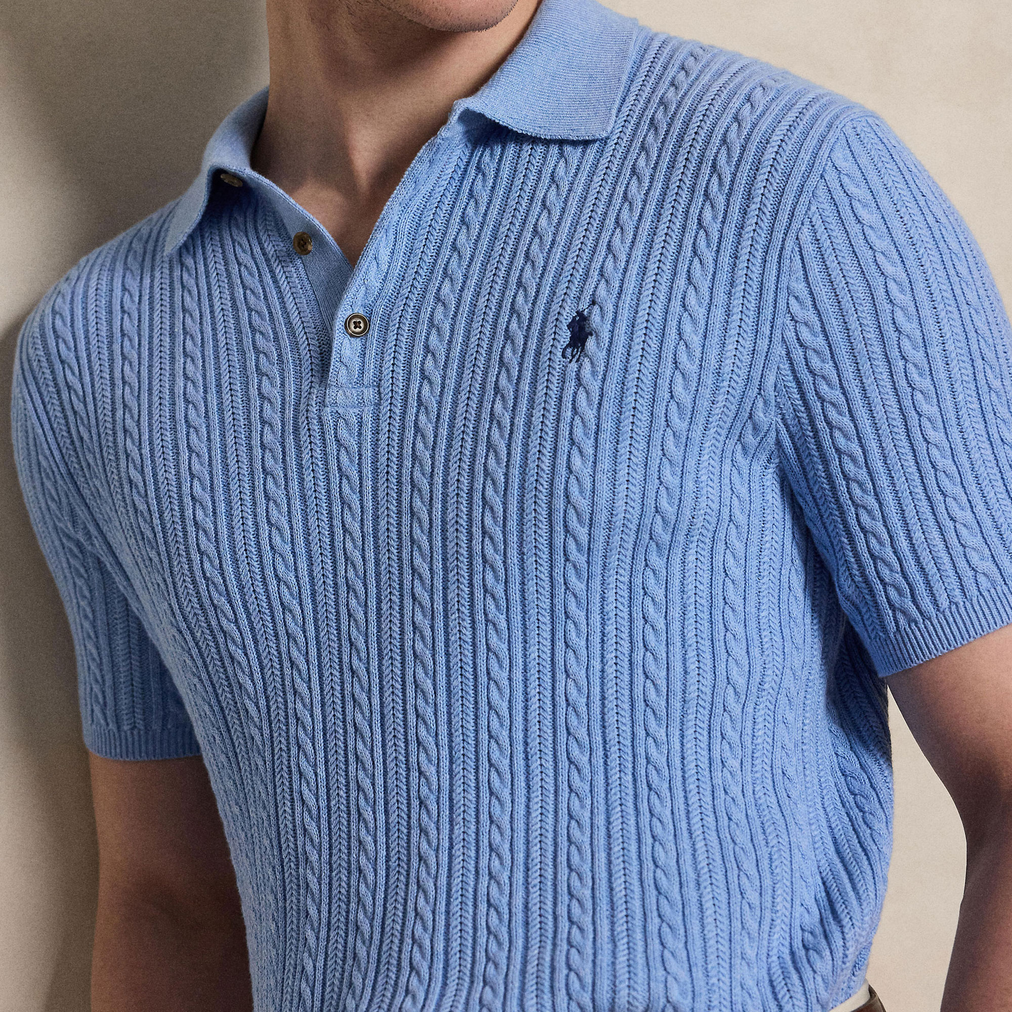 - Cable-knit sweater design, Polo collar, lightweight, combed finish, soft feel, durable, rib-knit Polo collar, three-button placket, front button fastenings, short sleeves, rib-knit armbands, rib-knit hem, signature embroidered Pony logo detail