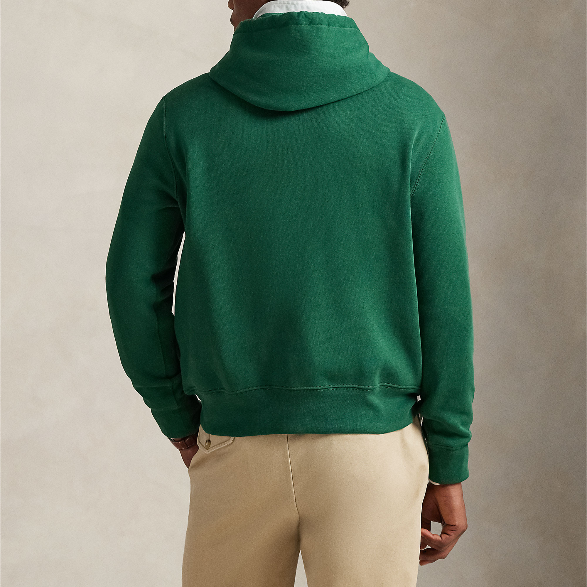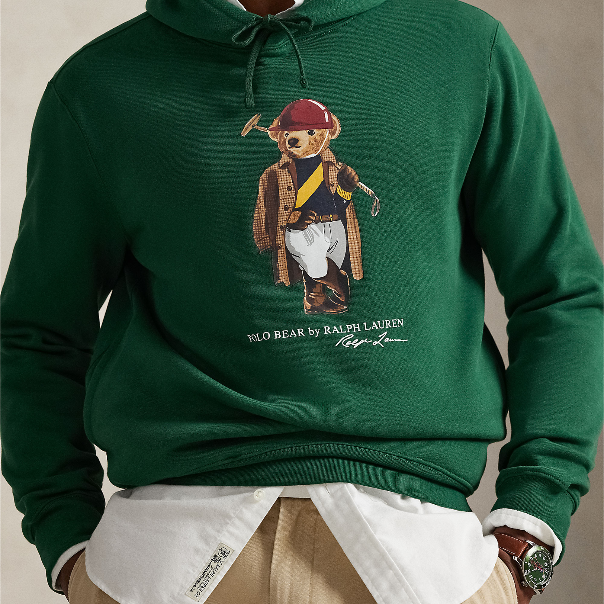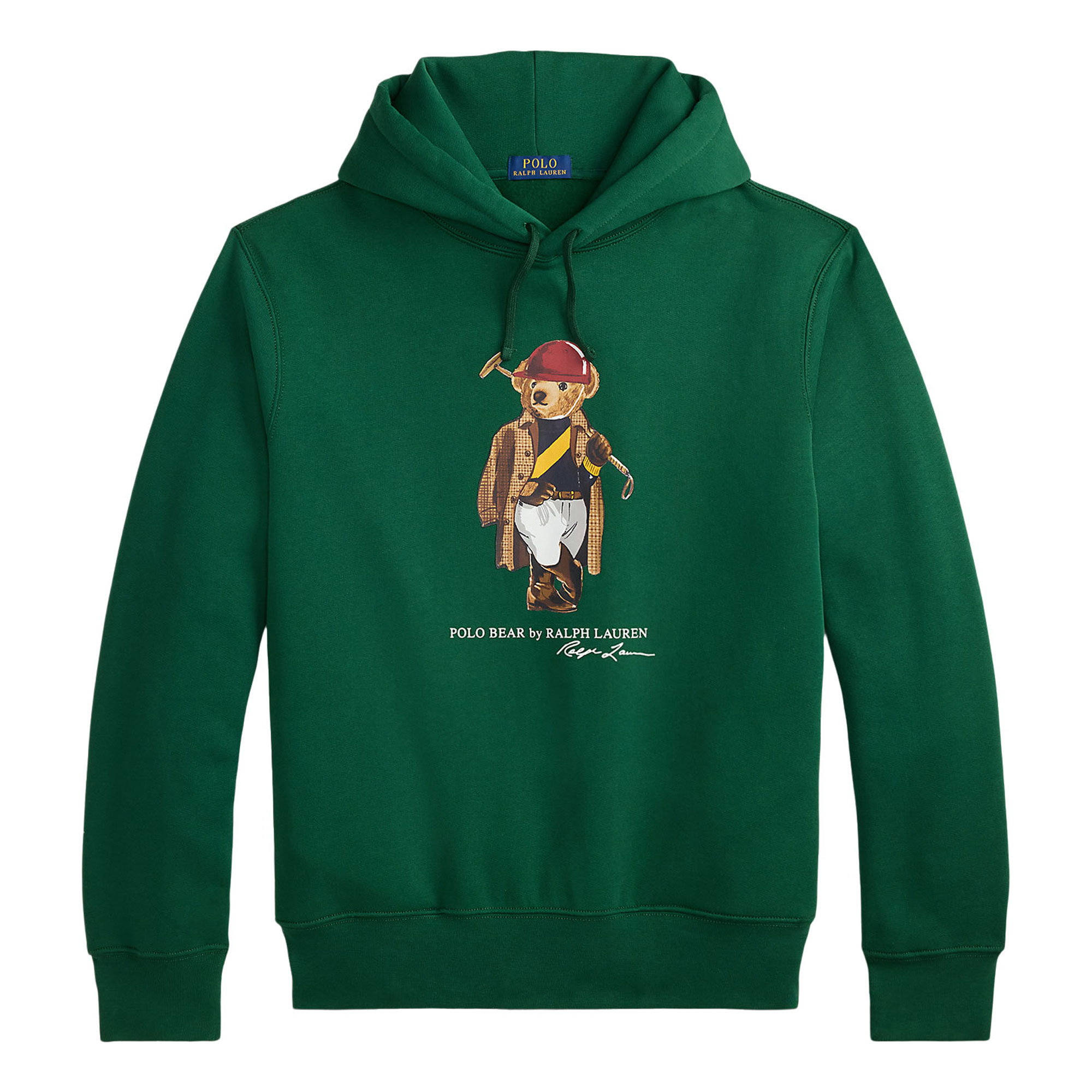 - Drawstring hood, long sleeves, ribbed cuffs, Polo Bear graphic, script logo, side on-seam pockets, ribbed hem, plush cotton blend