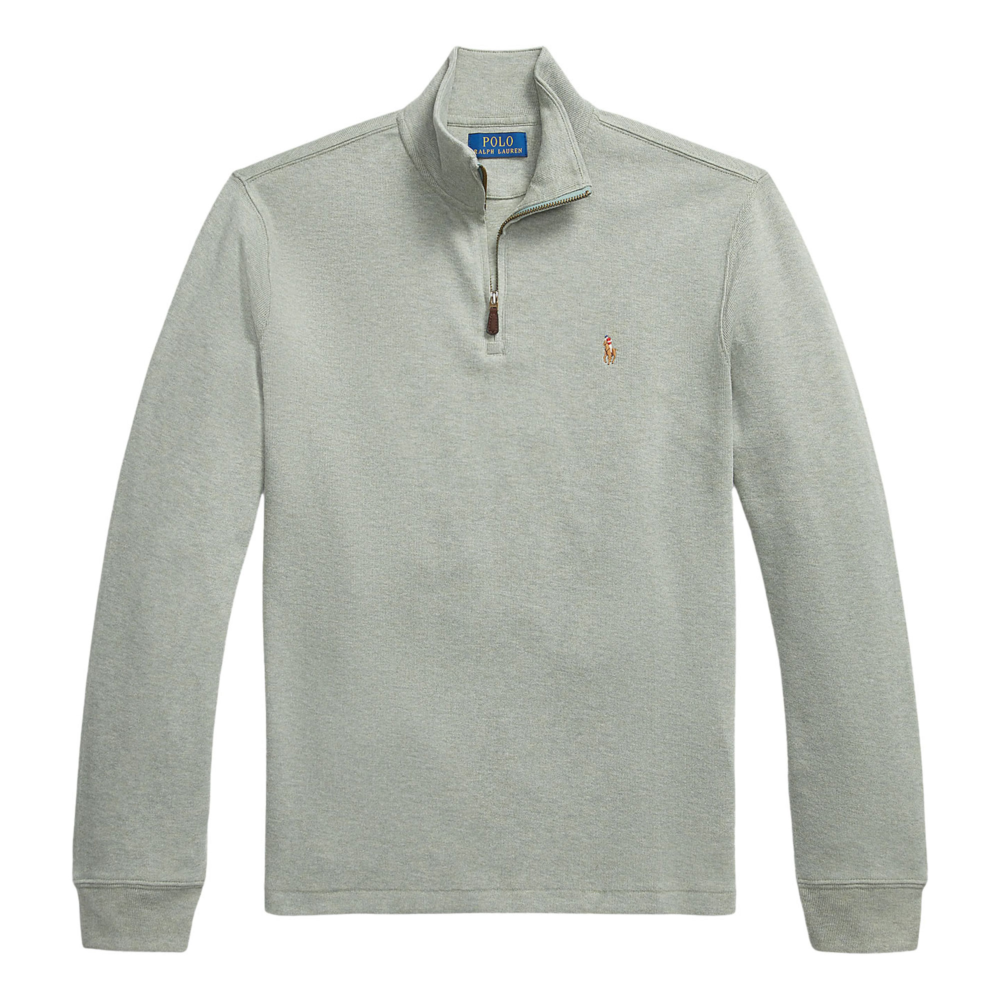 - Mockneck, quarter-zip placket with custom zipper, long sleeves with banded cuffs, vented hem, multi-coloured signature embroidered pony at the chest