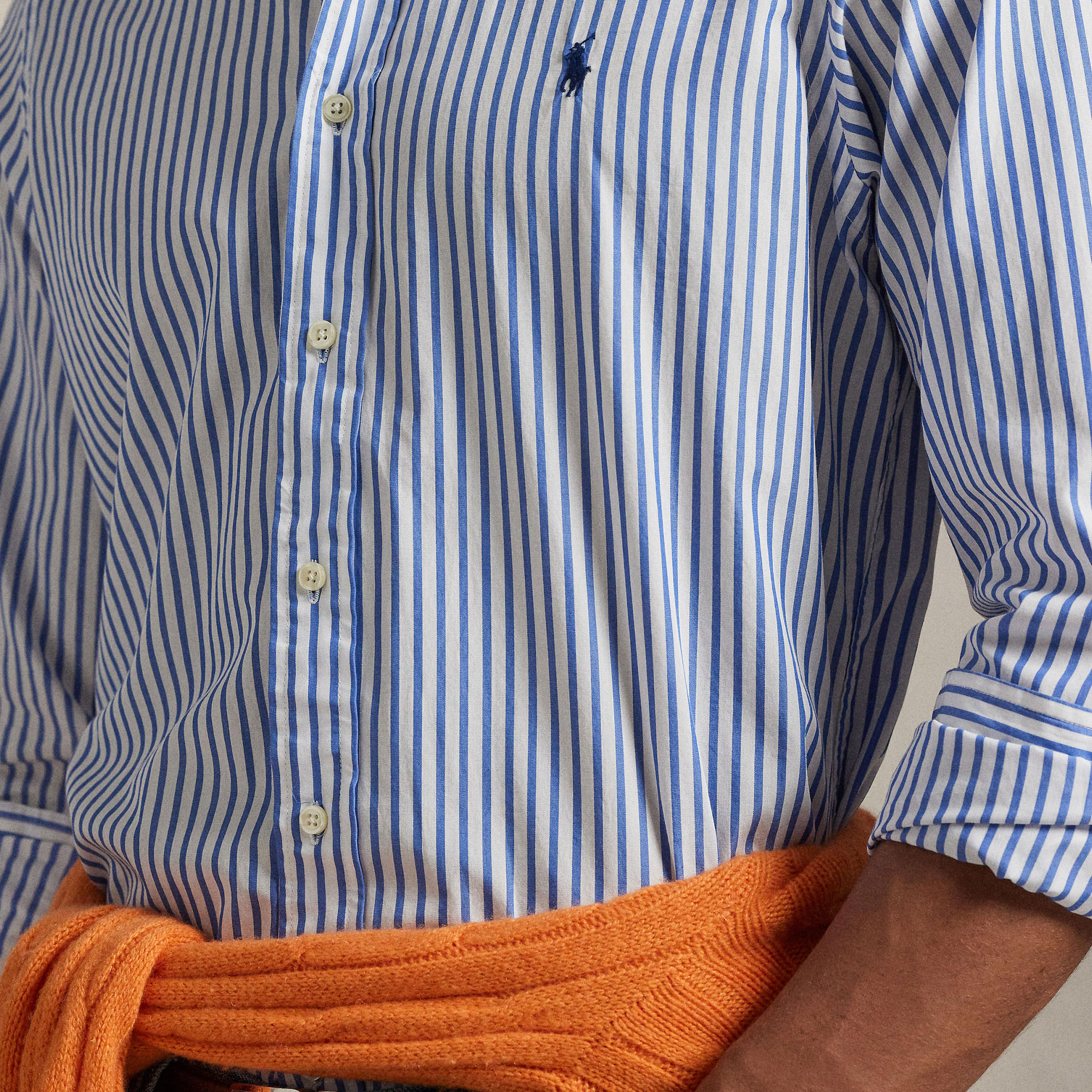 - Striped, broadcloth fabric, washed finish, soft feel, embroidered Pony logo detail, button-down collar, buttoned placket, long sleeves, buttoned barrel cuffs, split back yoke, box pleat