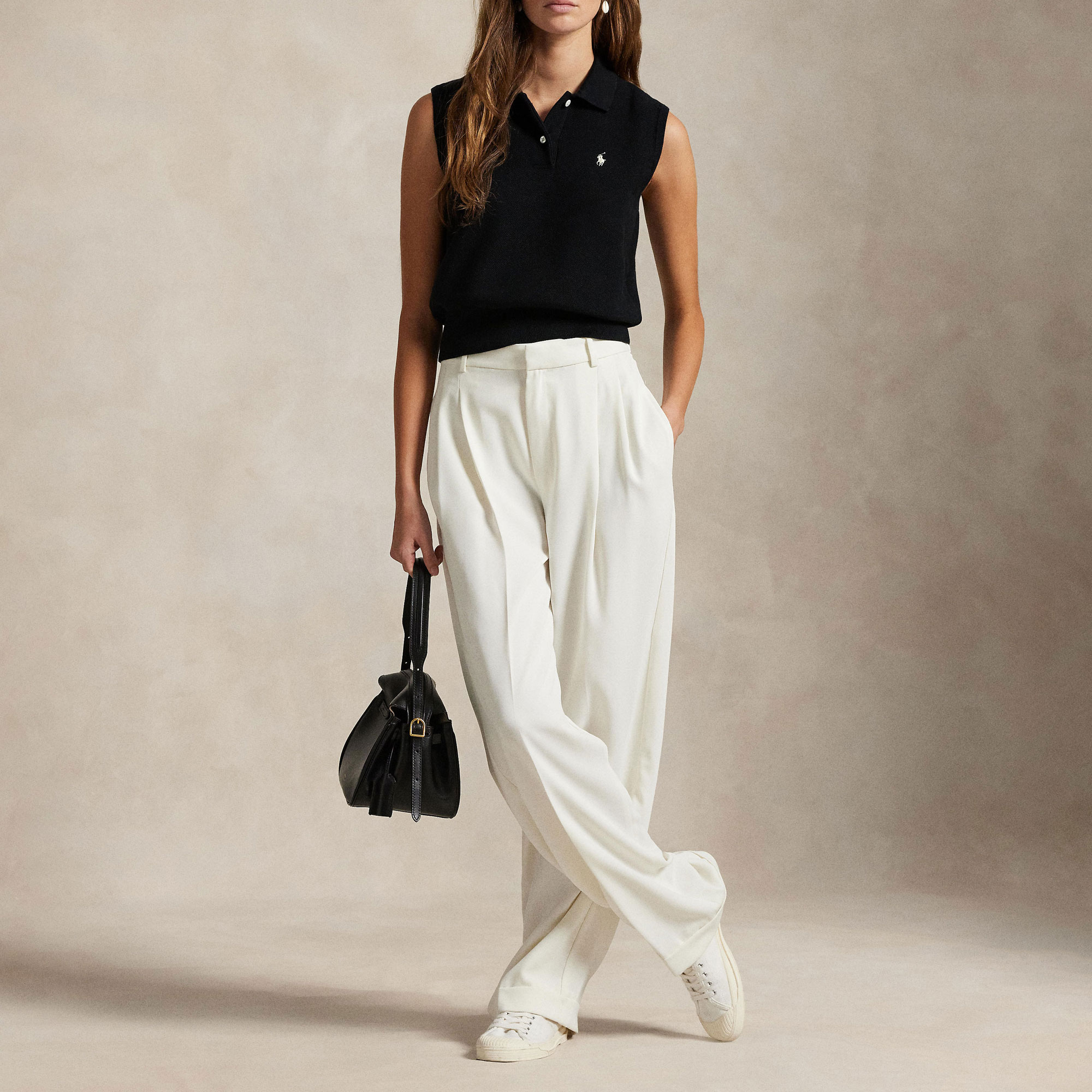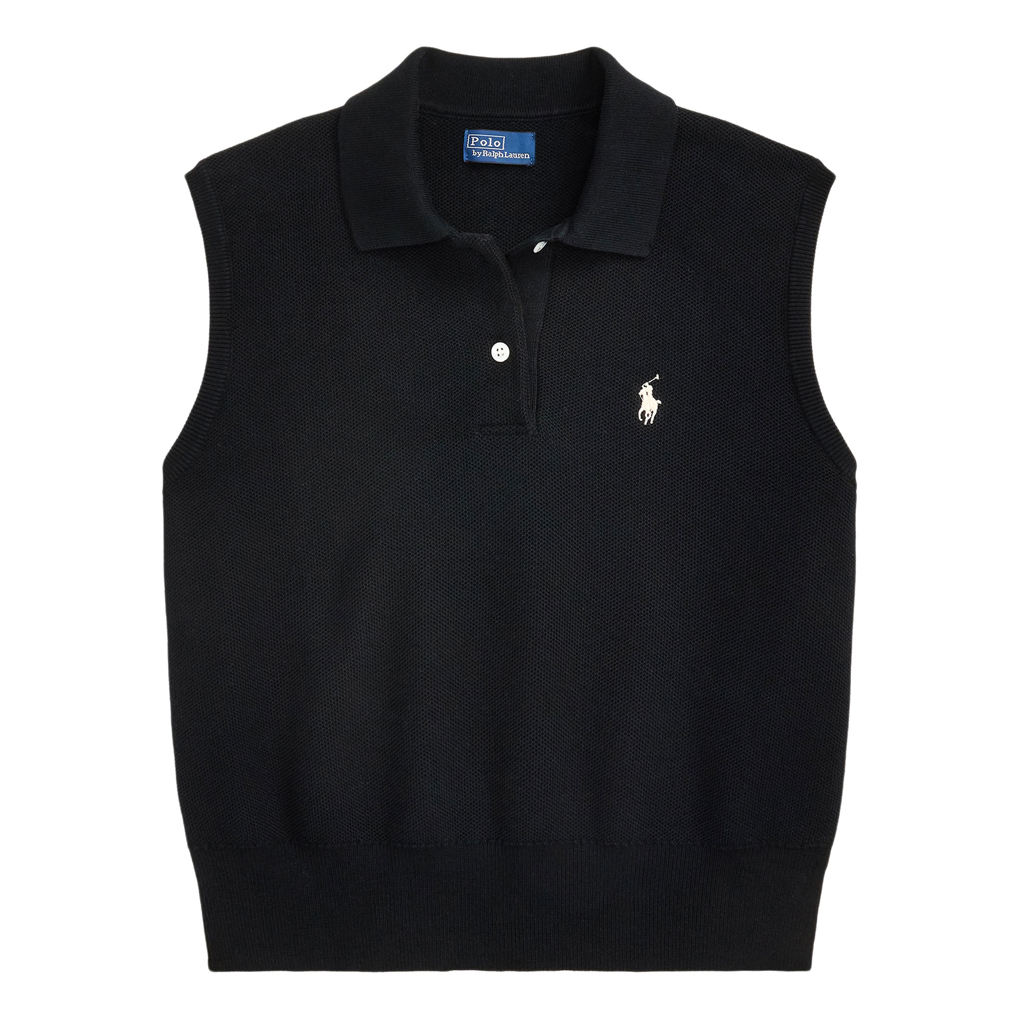 • Ribbed polo collar, two-button placket, sleeveless silhouette with ribbed armbands, ribbed hem, signature embroidered pony at the left chest