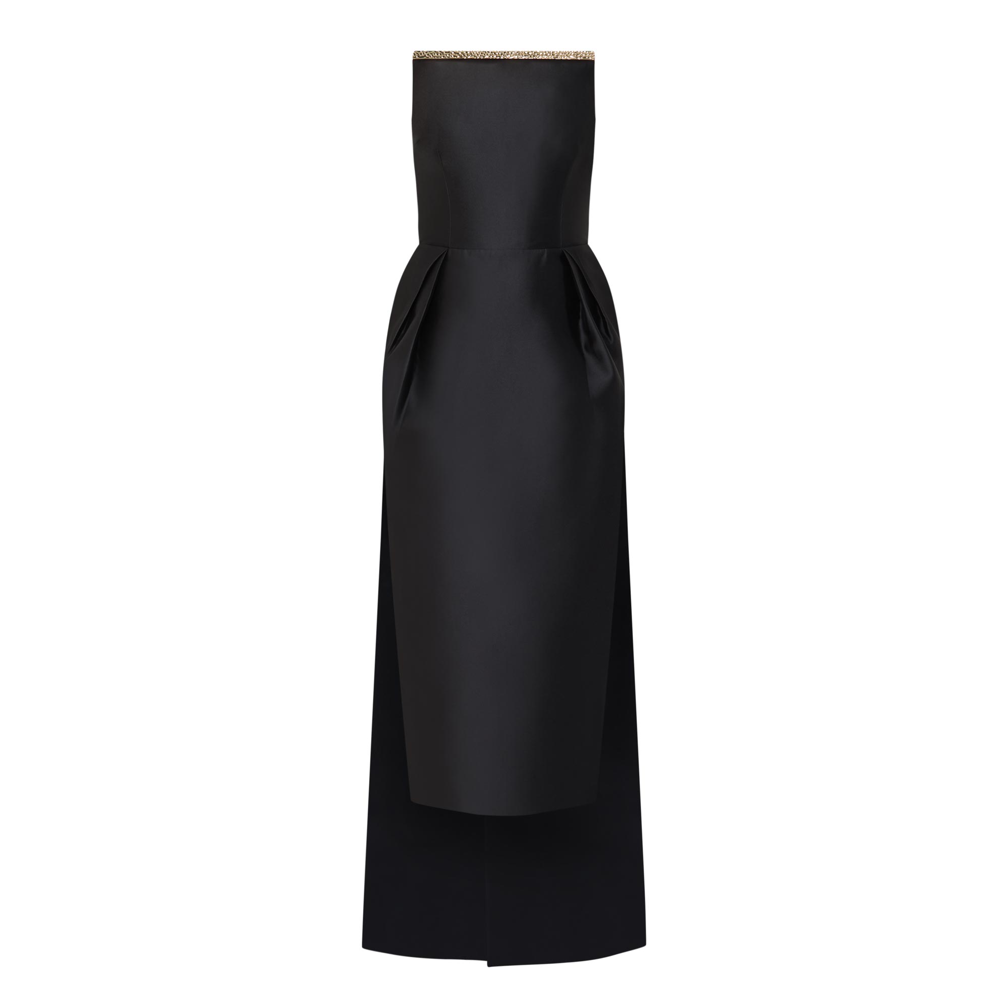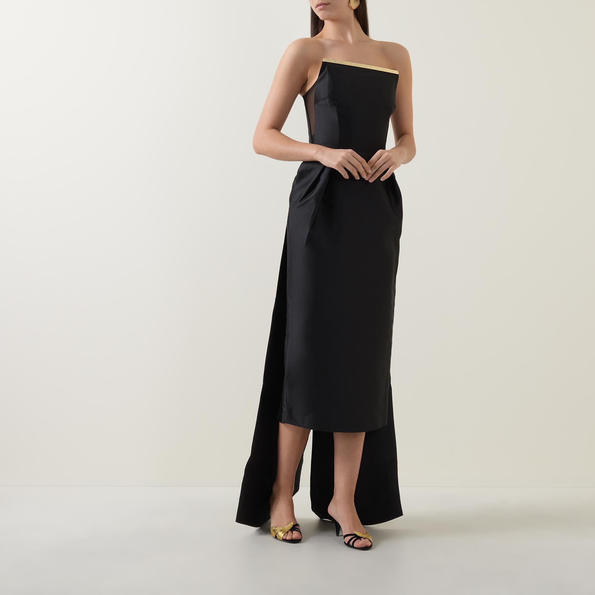 - Strapless, midi length with floor length train to the back, gold-tone hardware detail at neckline, zip fastening, side entry pockets, mesh inserts at side, bust and waist darts, lined