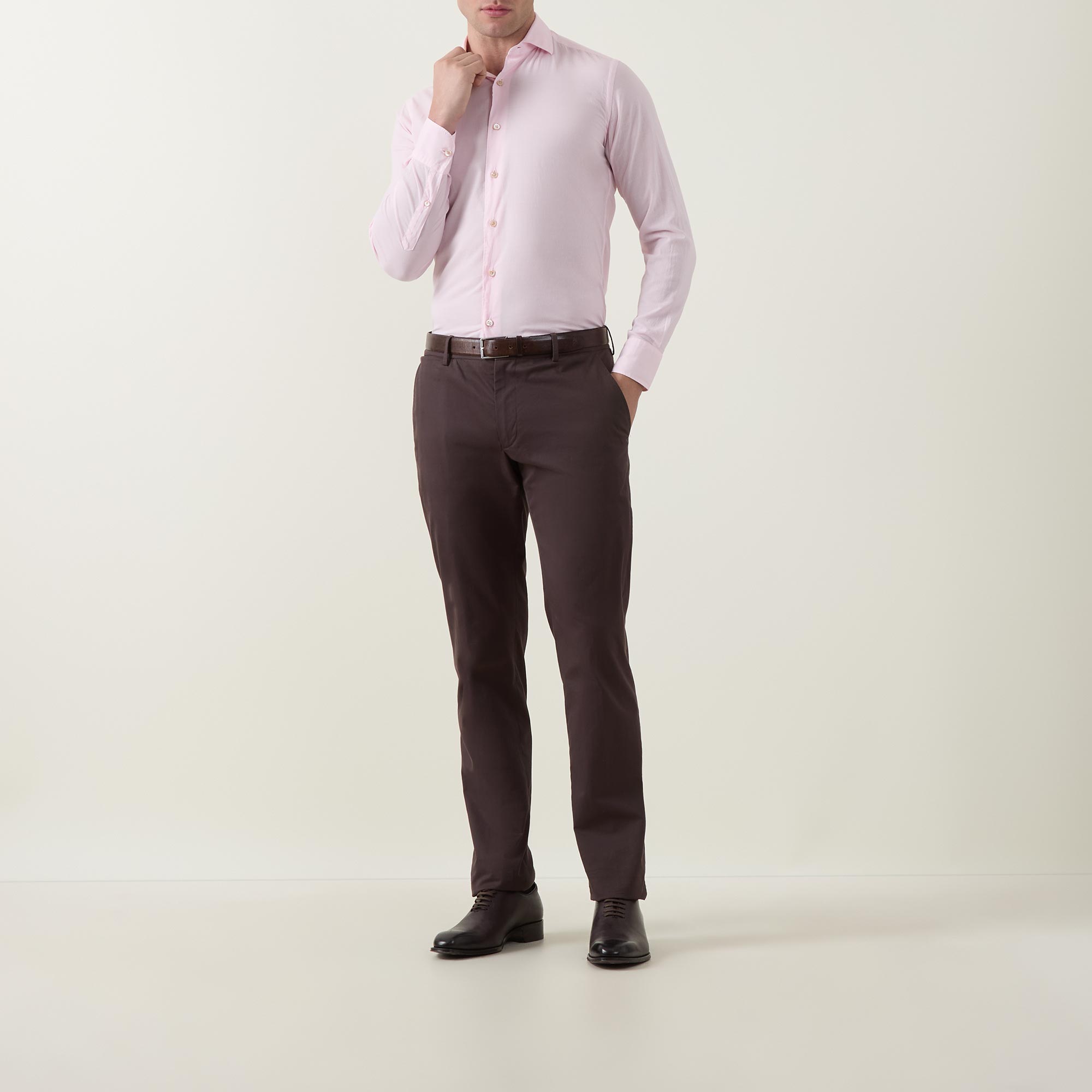 - Point collar, long sleeves, buttoned cuffs, front button fastening, curved hem, tonal stitching, dyed finish