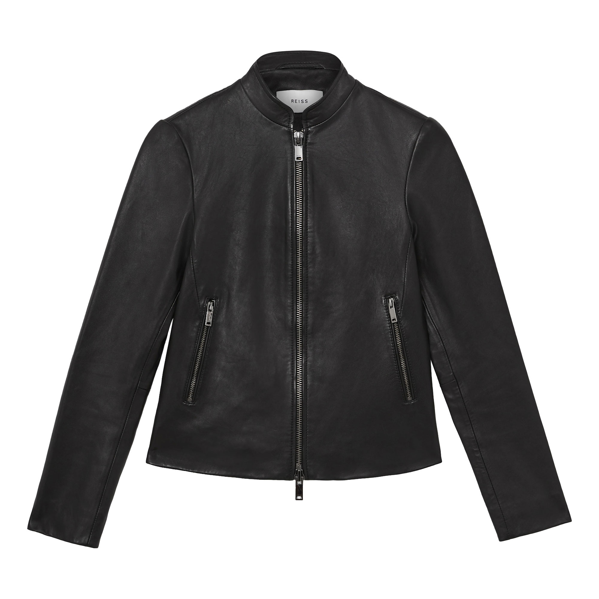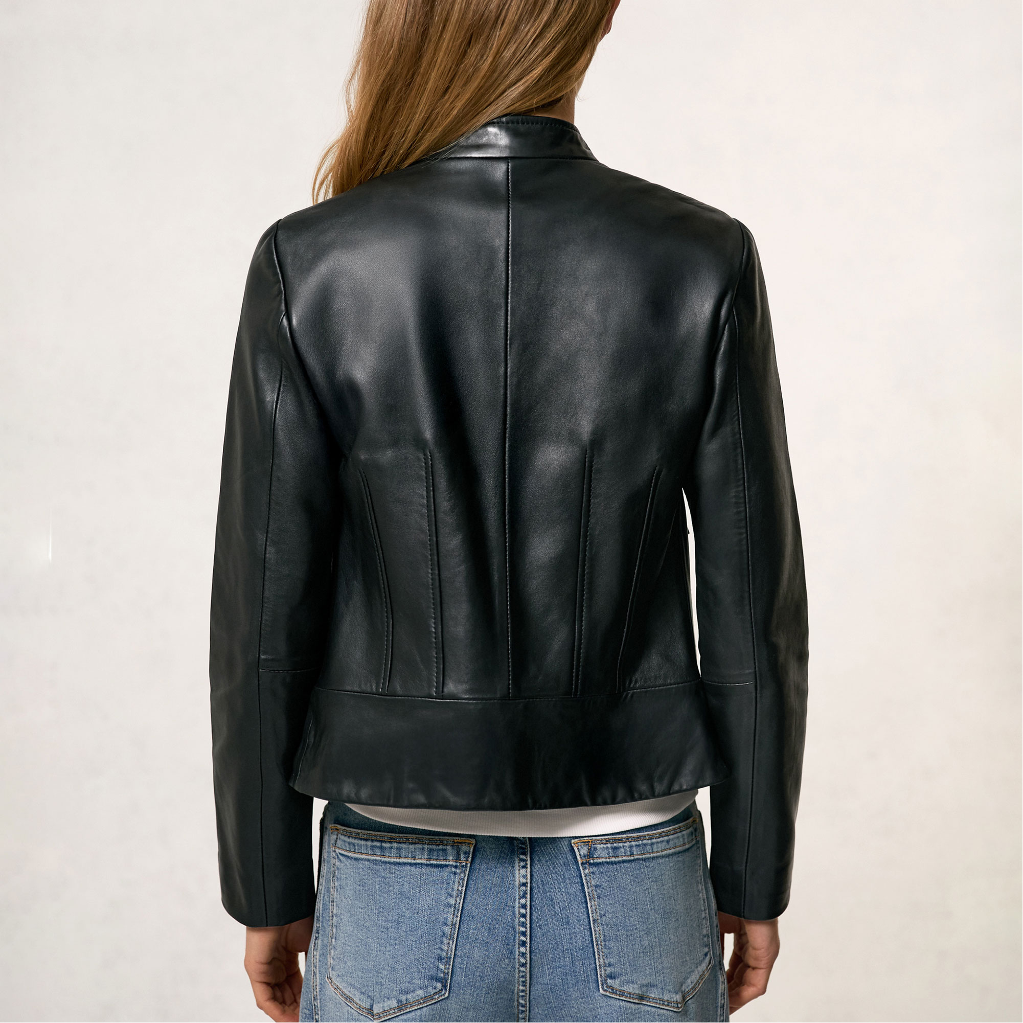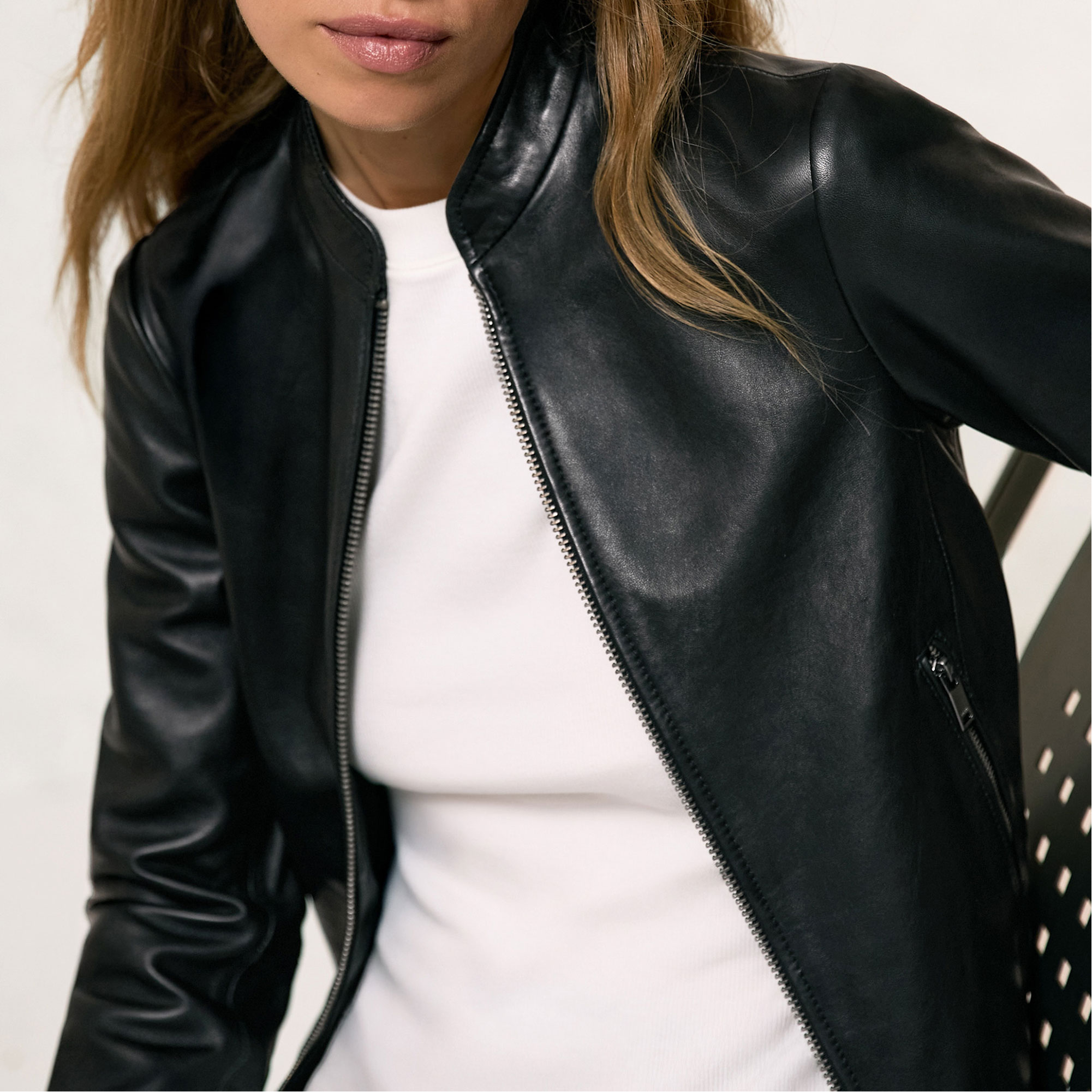 • Collarless neckline, butter-soft leather, fully lined, double-ended zip fastening, zip pockets, slim fit