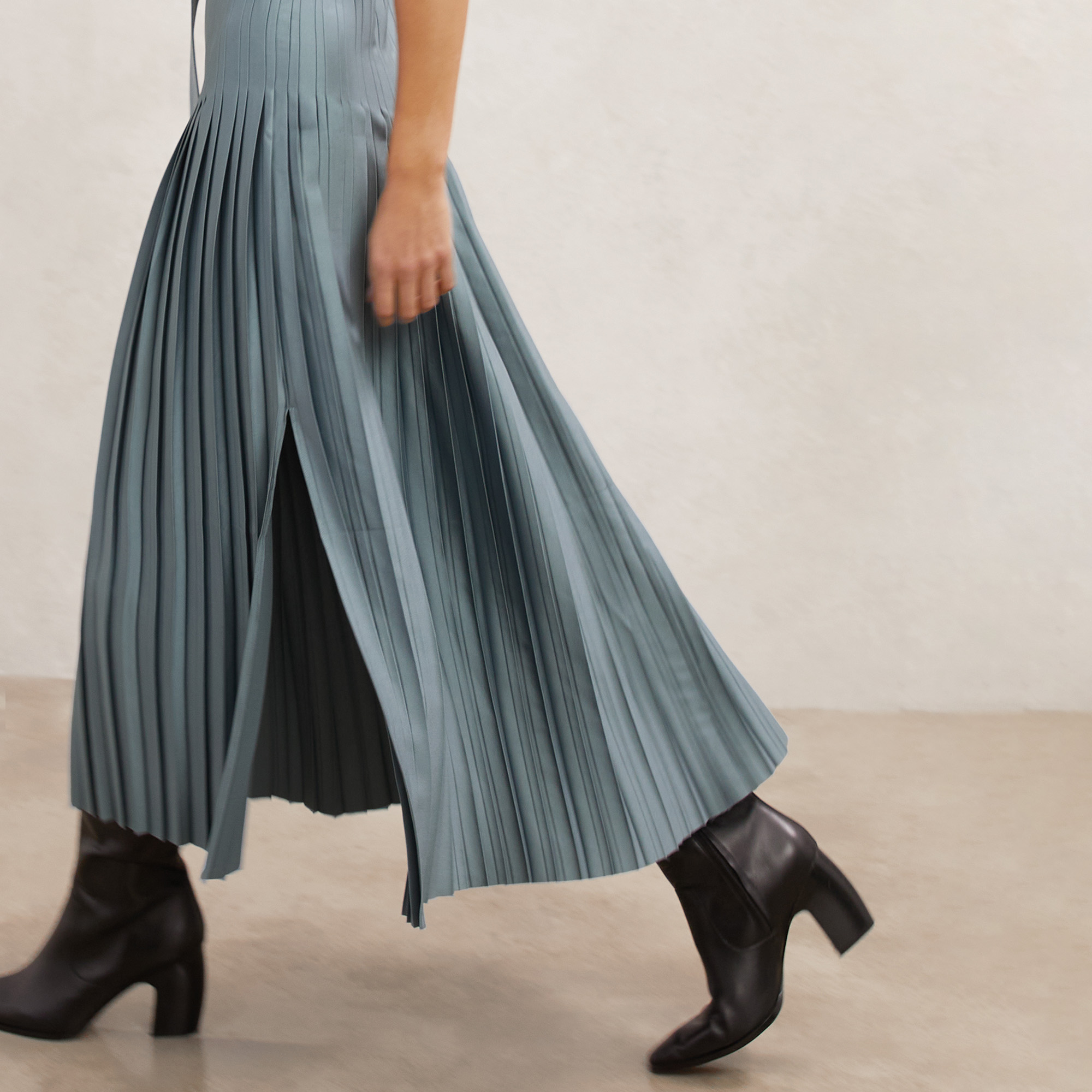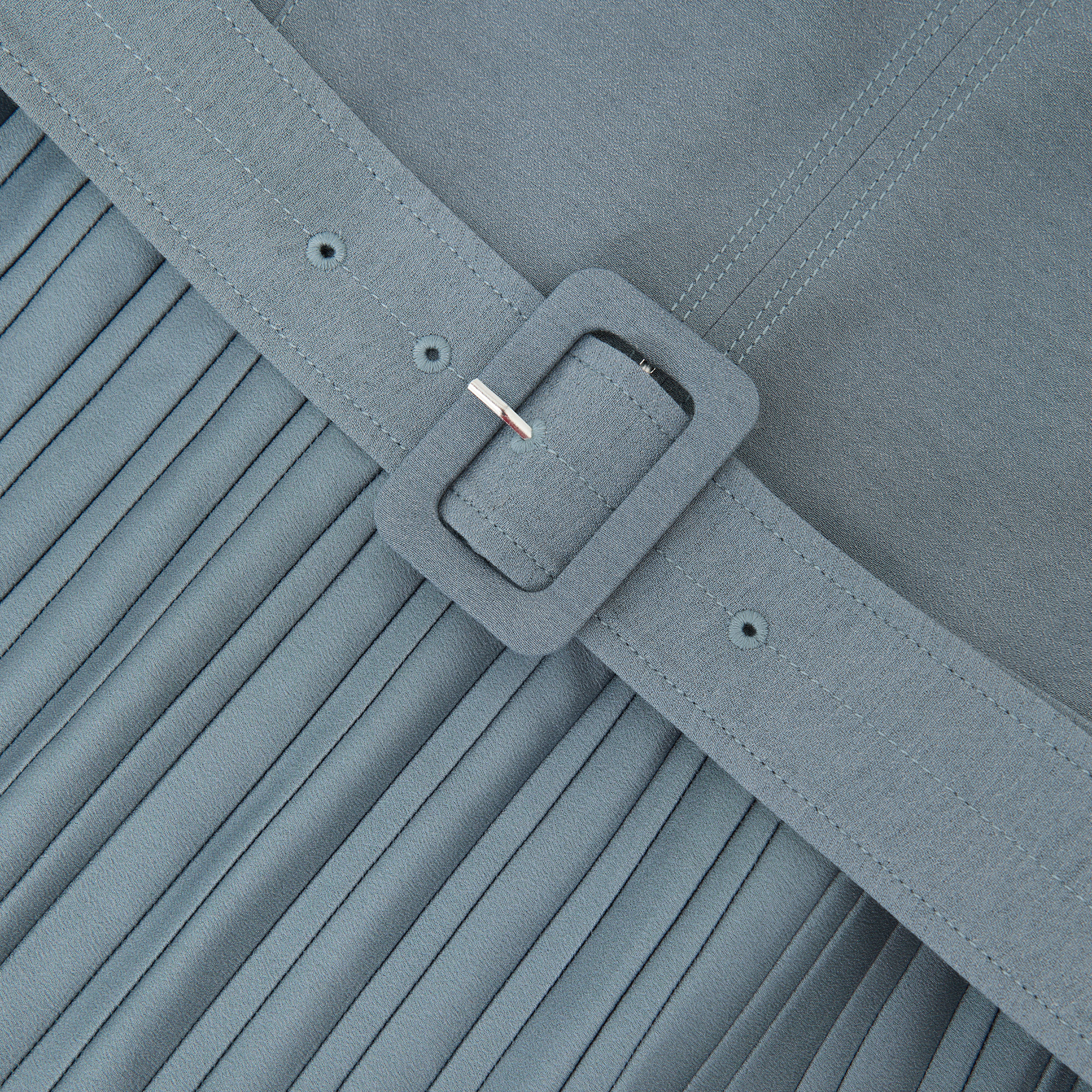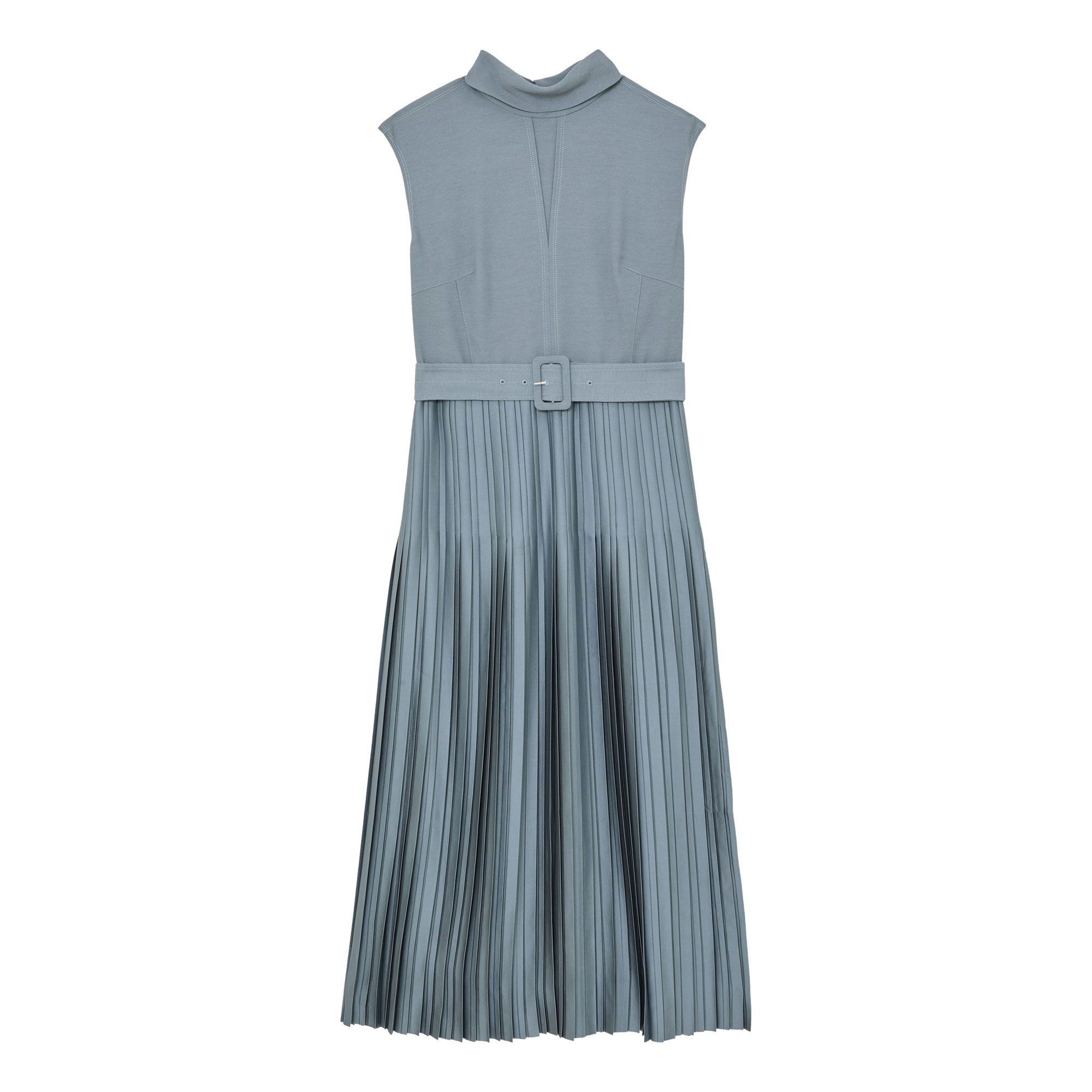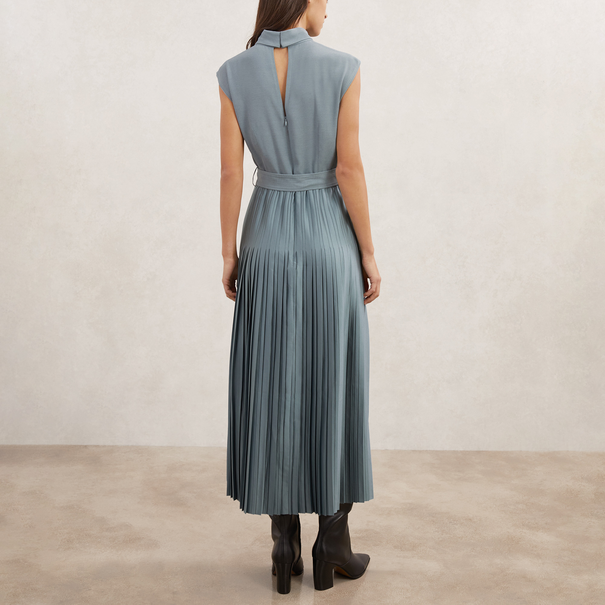 - Midi length, roll neckline, pleated satin skirt, co-ordinating belt, V-shaped front stitching, buttoned keyhole, concealed zip fastening, fit and flare silhouette, cap sleeves, sleeveless design, side slit