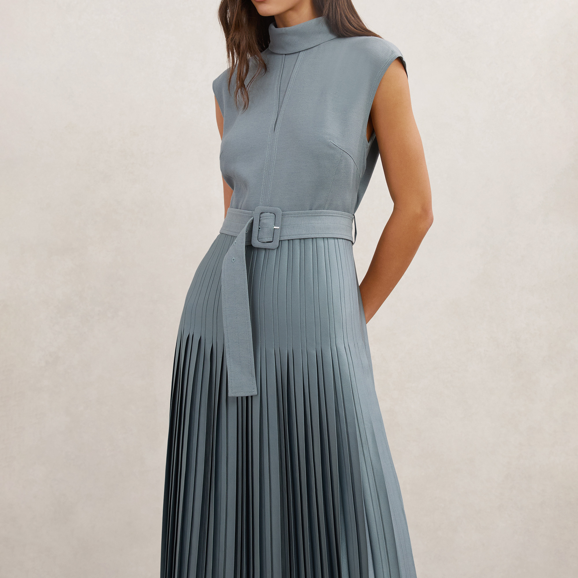 REISS Ania Belted Pleated Flared Dress
