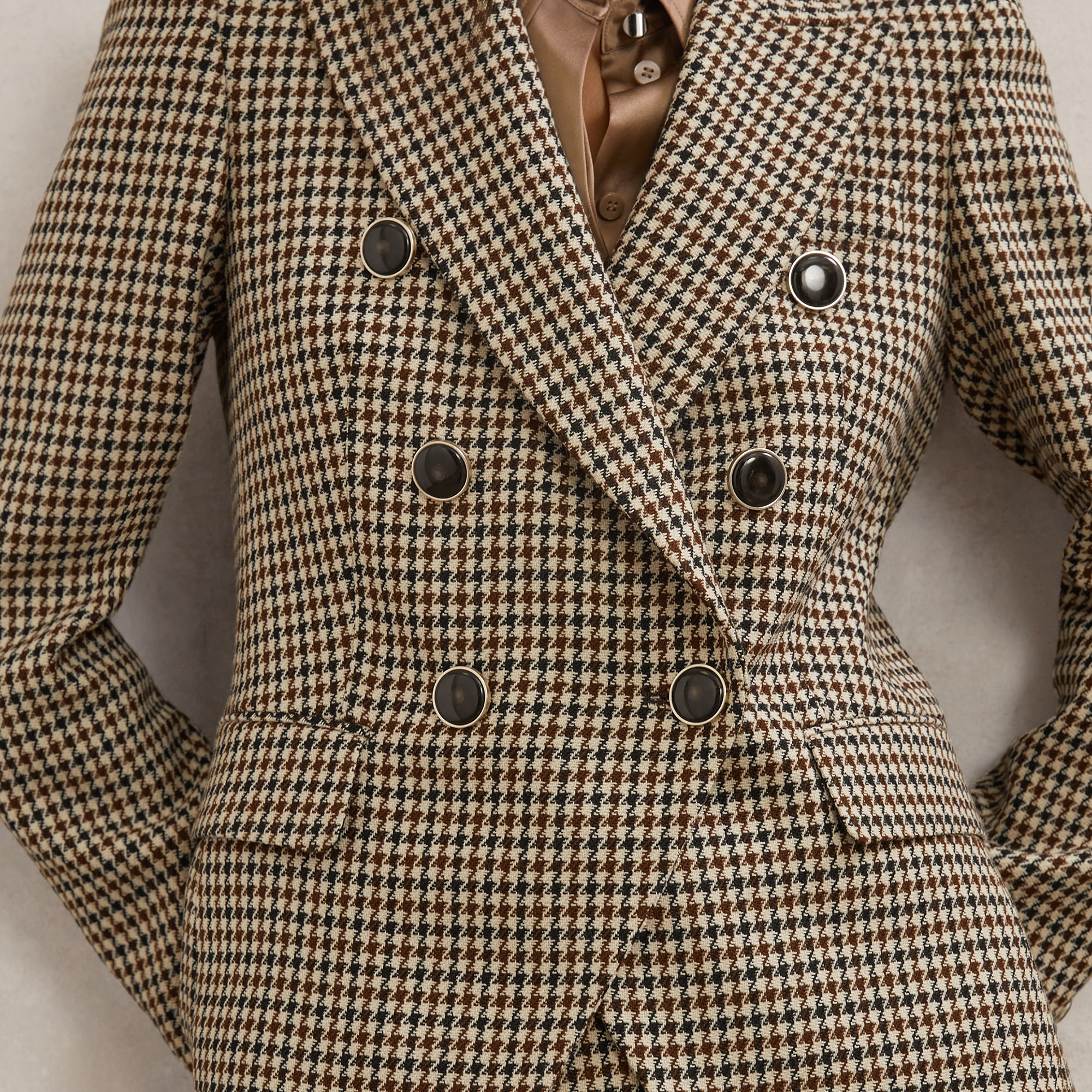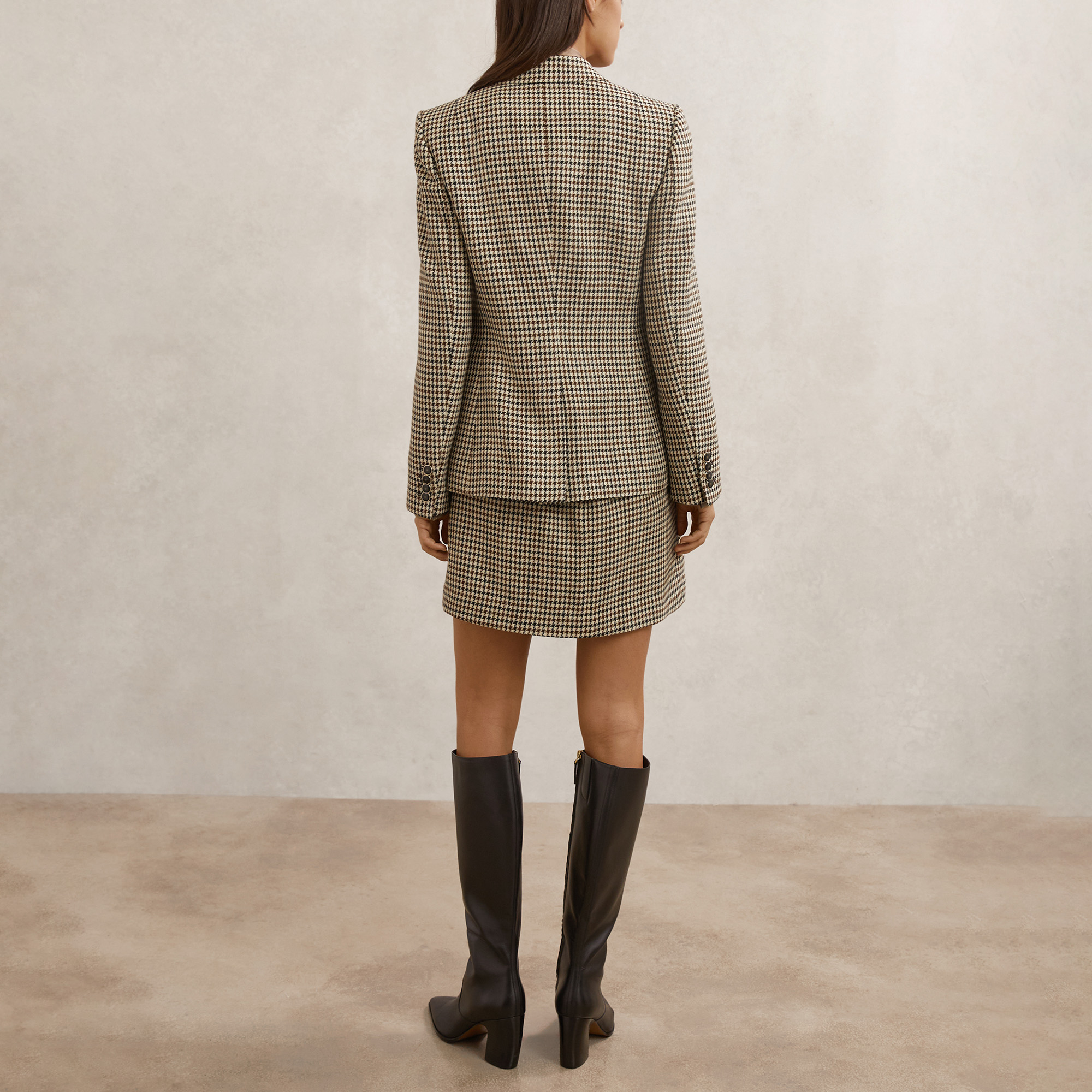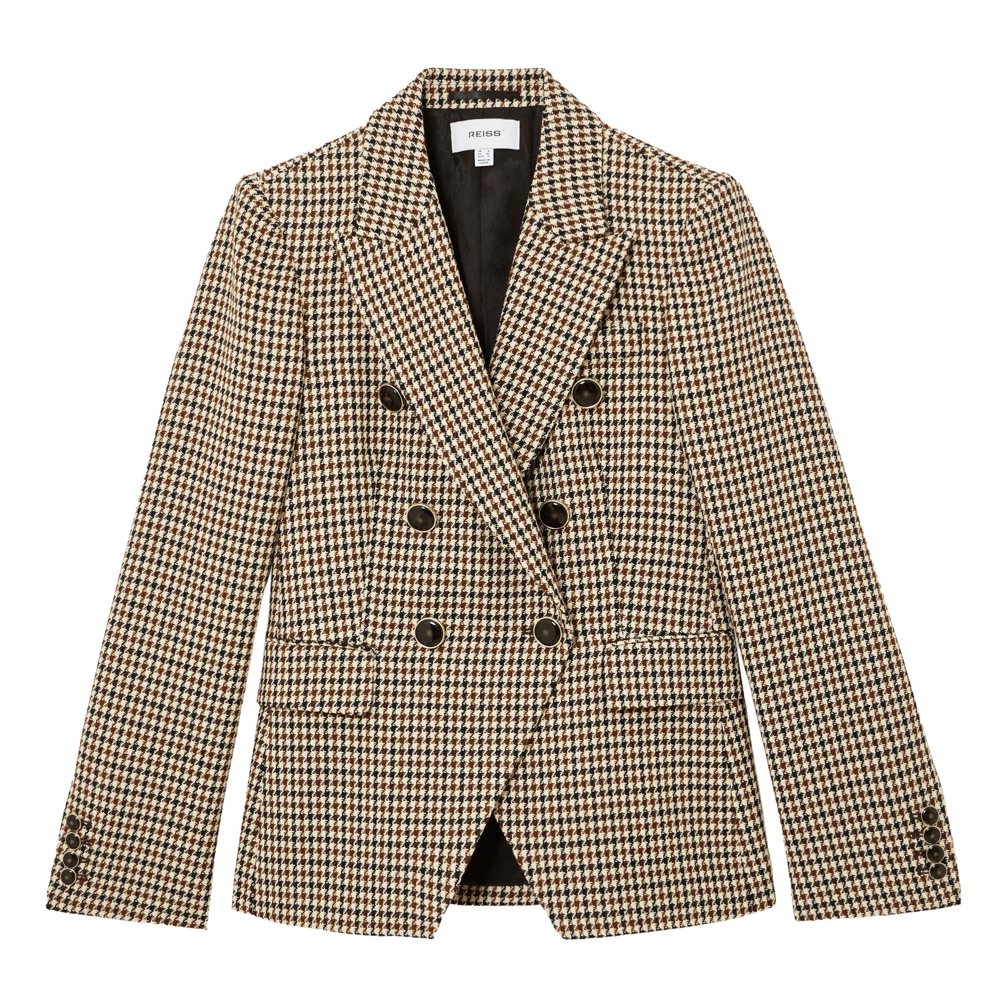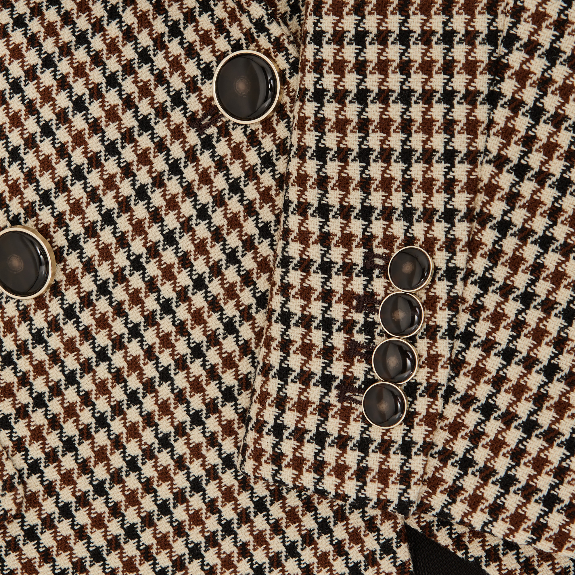 • Tailored, houndstooth check pattern, double-breasted silhouette, peak lapels, cut-away front, six-button fastening, buttoned cuffs, full lining, flap welt pockets, long sleeves