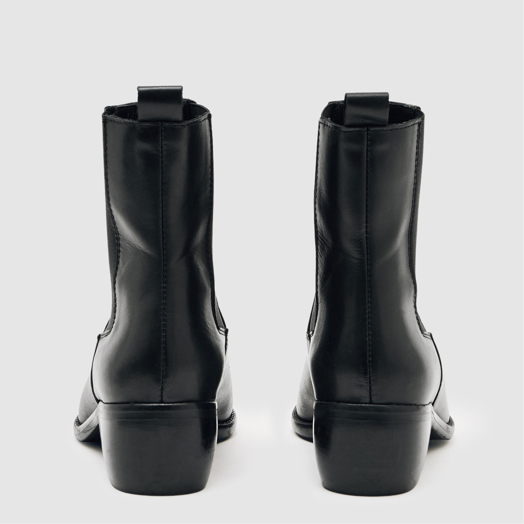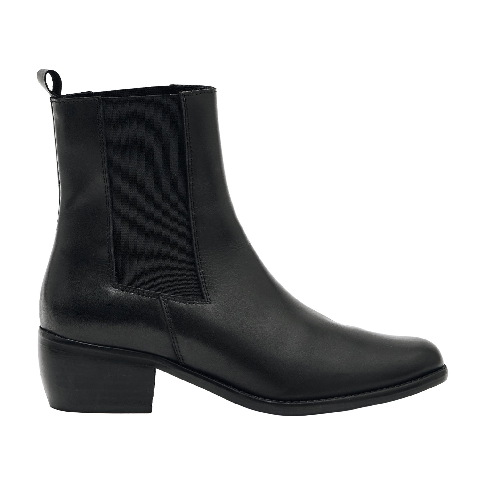 - Chelsea style, elasticated side inserts, blocked heel, almond toe, polished finish, pull tab